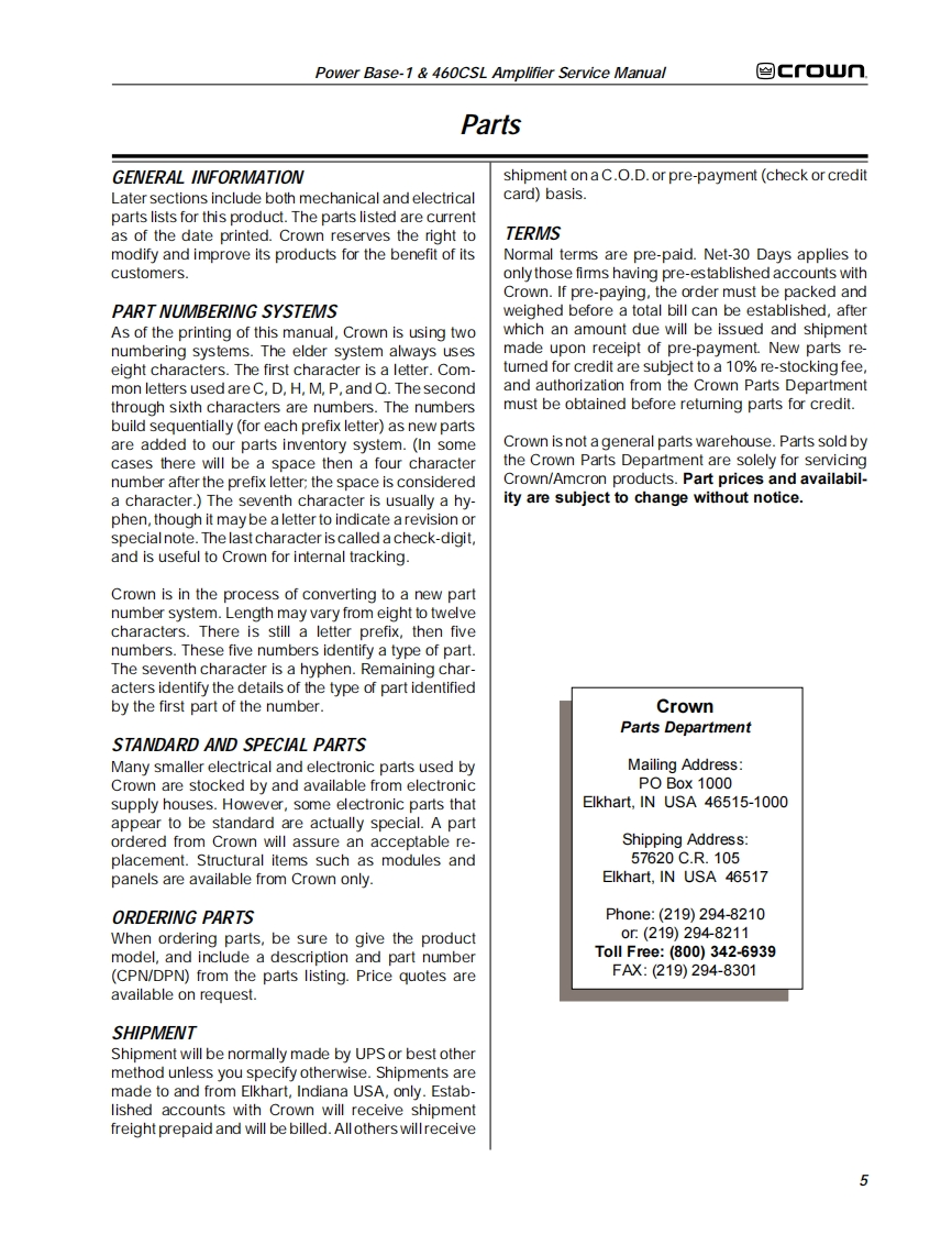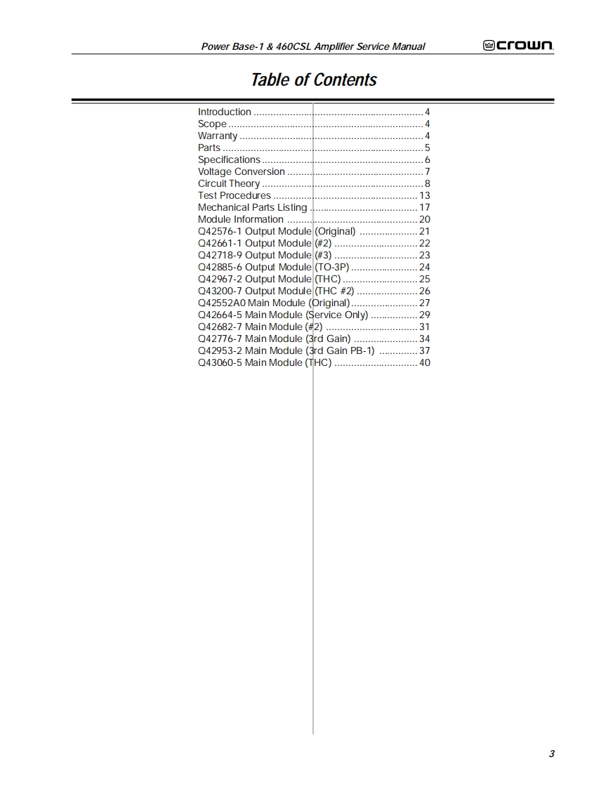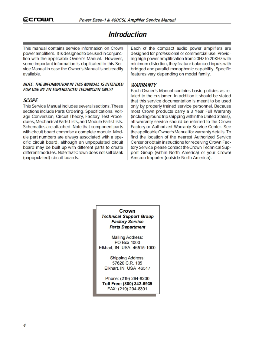 ≌Gf▣UnTHE PROFESSIONAL AUDIO DIVISION OF CROWN INTERNATIONAL,INCPOWER AMPLIFIERSERVICE MANUALPOWER BASE-1°&460CSL1995 by CROWN INTERNATIONAL,INC.Mailing Address.Shipping Address:P.0.Box100057620C.R.105Elkhart.IN U.S.A.46515-1000Elkhart,IN U.S.A.46517CSLis a trademark and Power Base-1,ODEP and Crown are registered trademarks of Crown International,Inc.K-SVCPB11.95