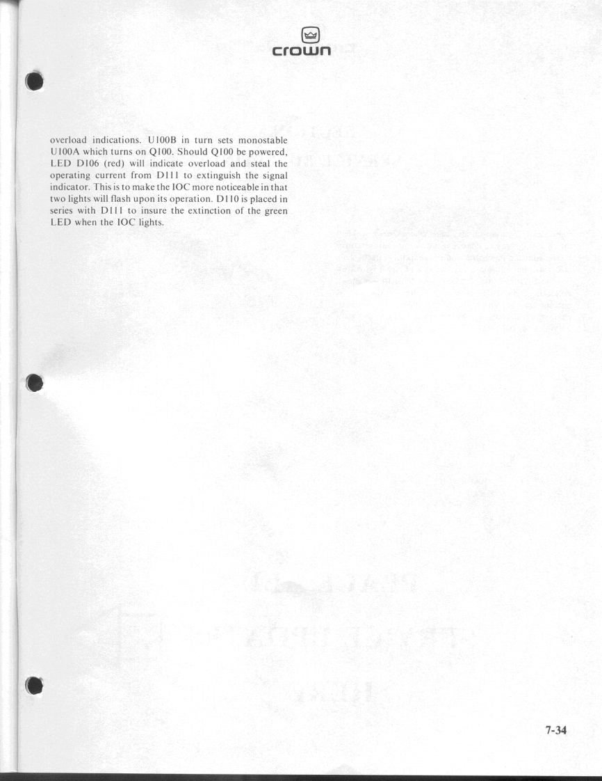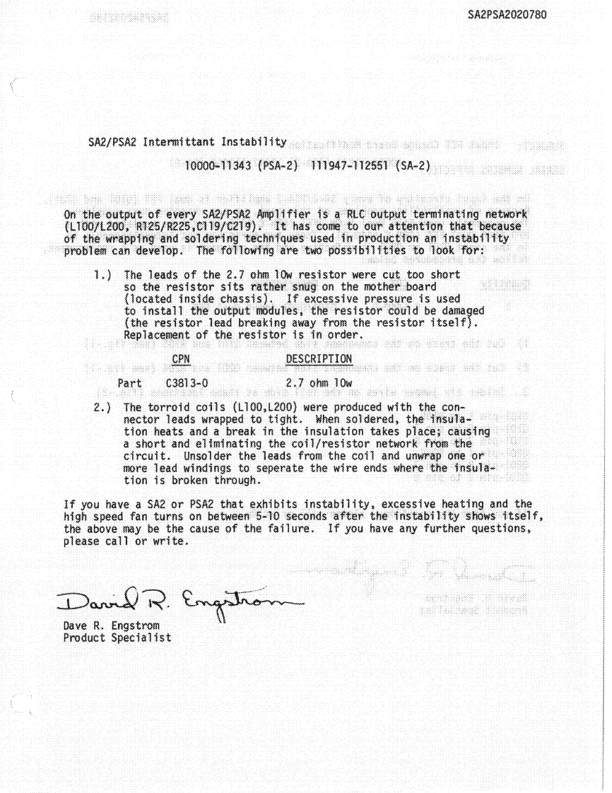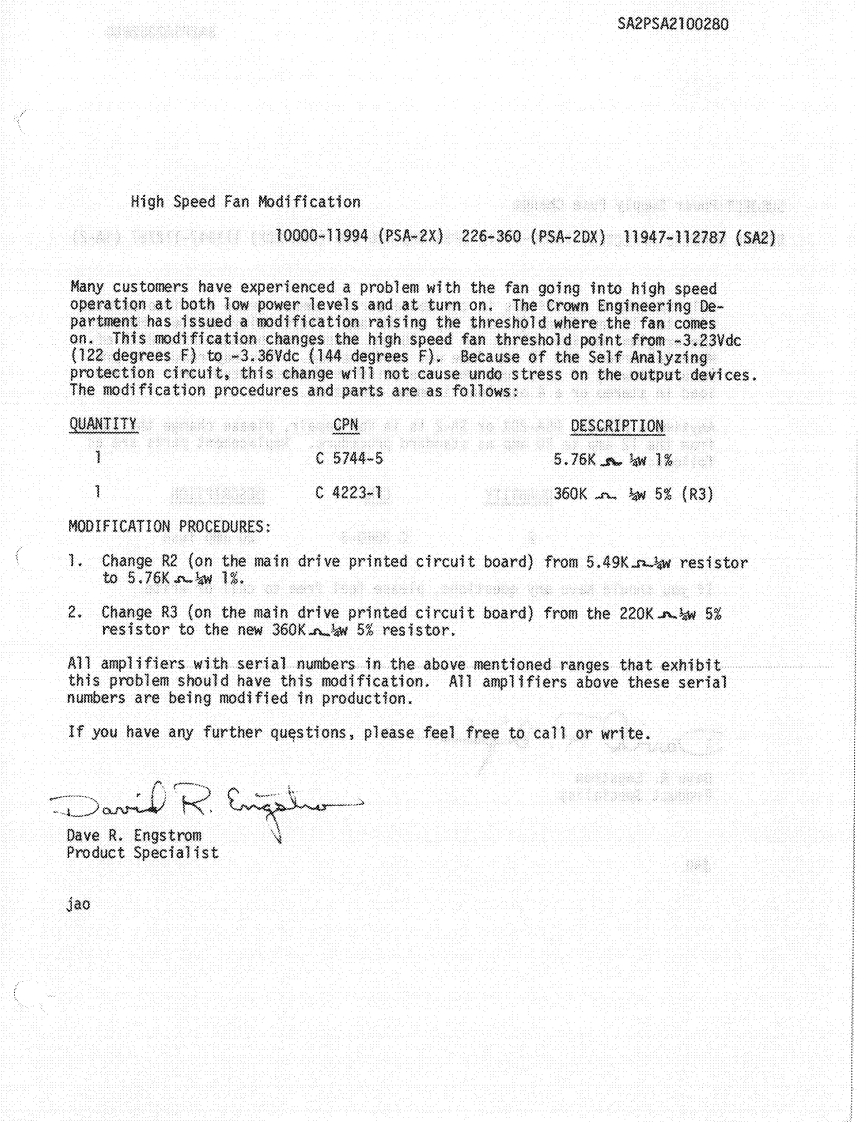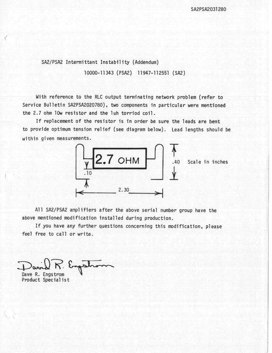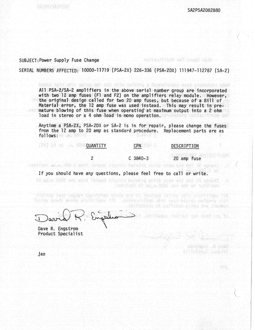 The gain stage is constructed with UIB whose output iswill allow the compressor to restrain the output power ofrouted to the low-pass filter using U3C.The low passthe unit to protect fragile drivers,etc.filter is standard as a 3-pole Butterworth type of 15K Hz.It also may be readily reconfigured.The input and outputShould stereo tracking of the compressors be desired theof the LP filter are routed to SW10l for selection of thetest points TP5 and TP6 may be shorted together.Thisdesired signal.The output of SW10l is then input to thewill cause the compressors to compress equally despitelimiter-compressor.which channel may have initiated the gain reduction.The limiter -compressor is constructed with deliberatelyIf the action of the compressors is undesirable in anrestricted compression range.Compressors with largeapplication,the OTA's U4 and U5 or comparators U6gain compression capability often exacerbate feedback inmay be removed from their sockets to prevent allsystems where the gain is increased only to be reduced bycompression.the compressor action.Should the input be reduced theWhen making a hurried hook-up of a sound system it isgain will suddenly appear as the compressor recovers andoften handy to know if the amplifier is attached to thefeedback will result.loudspeakers that it is to drive,i.e.,no open or shortedThe compressor is not a part of the circuit function until aspeaker cables.To make this test easier,the PSA-2 has acontrol signal biases on U4.U4 is what is known as anbuilt in tone generator which provides inpulses at a 50Hzoperational transconductance amplifier or OTA.Such arate.As such the spectrum will excite tweeters or woofersdevice converts a small input voltage into an outputwith a signal that has very little power yet is quitecurrent which is proportional to the control currentdistinctive and audible.injected into pin 5.When Q100 is off,R117 acts to assureThe generator is constructed with UID which excitesthat no leakage current will enable any amount ofboth signal channels with a pulse shaped by CI incompression.When Q100 is on,the current in R118 turnsconjunction with RIII and R211.UID is wired as anon U4 which becomes an additional feedback loop inastable which has sufficient regeneration to oscillate onlyparallel with R112 and decreases the net stage gainwhen SWI is closed.proportional to the current in R112.The input signal toU4 is provided by the divider R114 and R113.Since theI.PSA-2/PSA-2X DisplayOTA has an offset voltage like any other op-amp,thismust be offset by a small DC voltage from R115 andThe display of the PSA-2 is a combined set of indicatorsRI16,the offset adjustment.Failure to null this errorto show the state of the output stage supplies,powerwould result in thumping of the compressor as it changedapplied to the control supply,signal on the outputs andgain.CIII is used to decouple any DC from the module.outputs overloaded (IOC).The output is then routed to the jack switch in J21.If anAmber LED D1,powered b