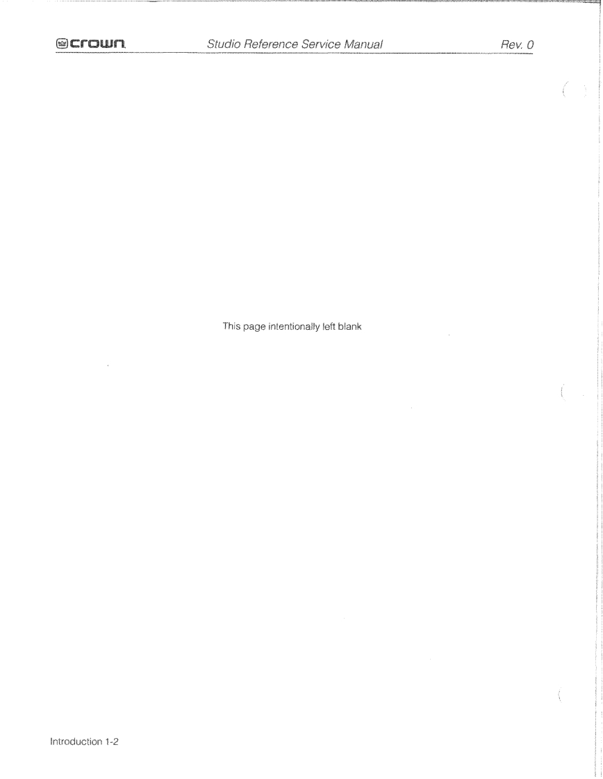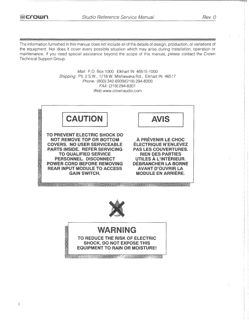 ≌CrOWStudio ReferenceService Manualcrown Reference】crownPROFESSIONAL STUDIO AMPLIFIERSModels:Studio Reference I Studio Reference llSome models may be exported under the name Amcron1998 by Crown International.Inc..P.O.Box 1000.Elkharl,Indiana 46515-1000 U.S.A.Telephone:219-294-B000.Studio Reference amplifiers are produced by Crown International,Inc.Trademark Notice:StudioReference"and Grounded Bridge"are trademarks and Amcron.Crown?/OC ODEP IQ Syster andP.1.P*are registered trademarks of Crown international,Inc.Other trademarks are the property of theirrespective owners.KSVCREF1/21298