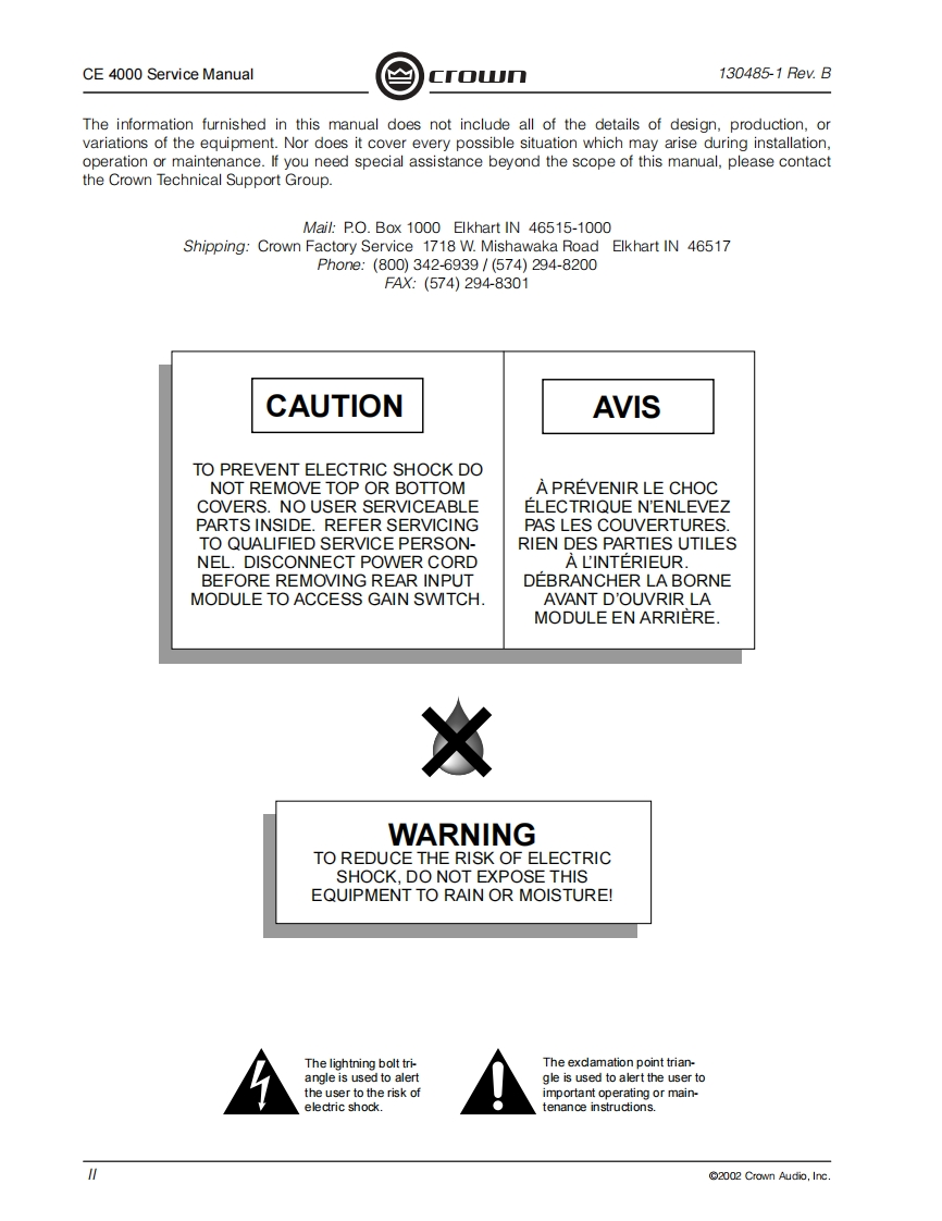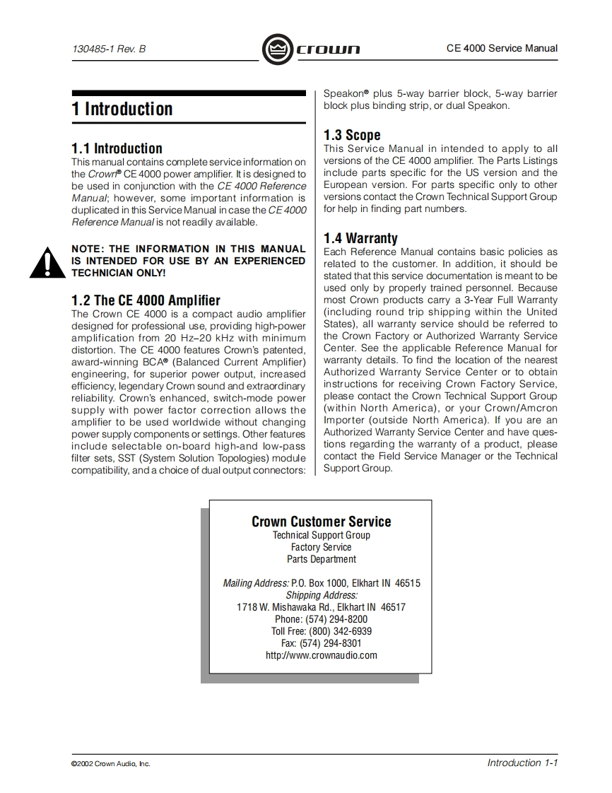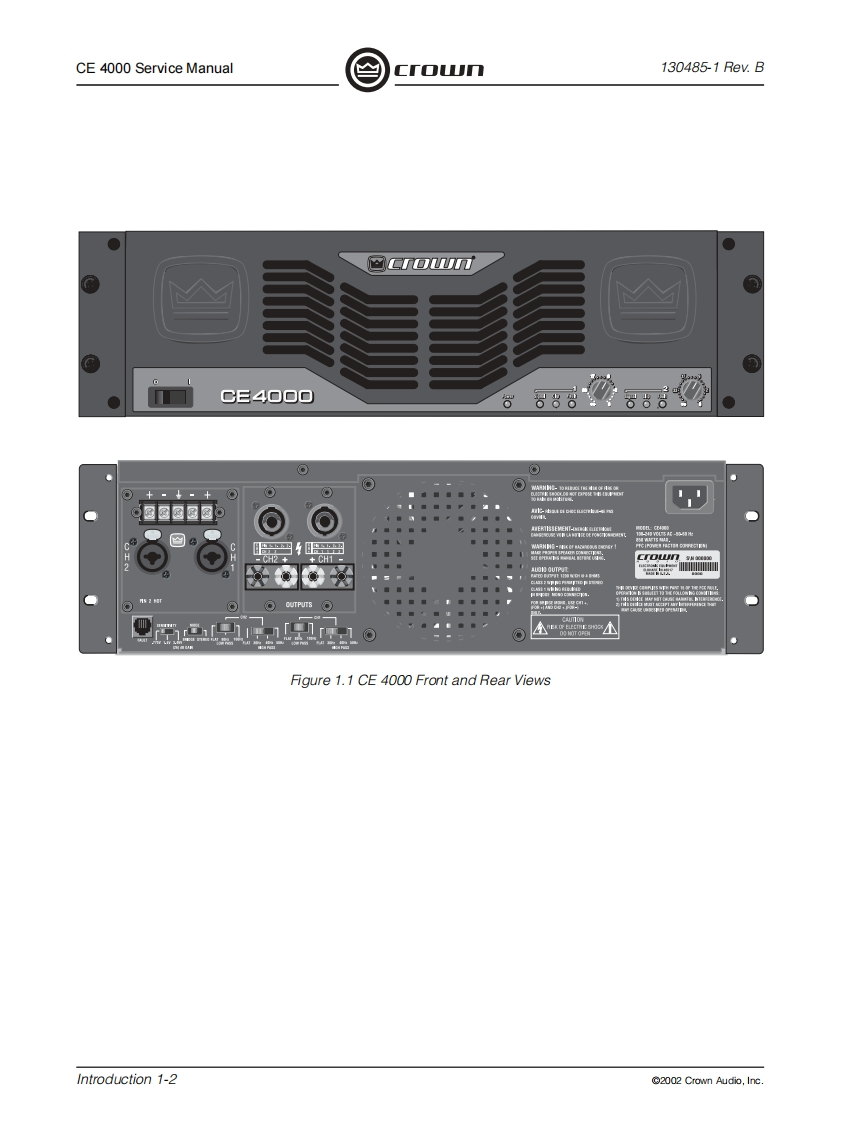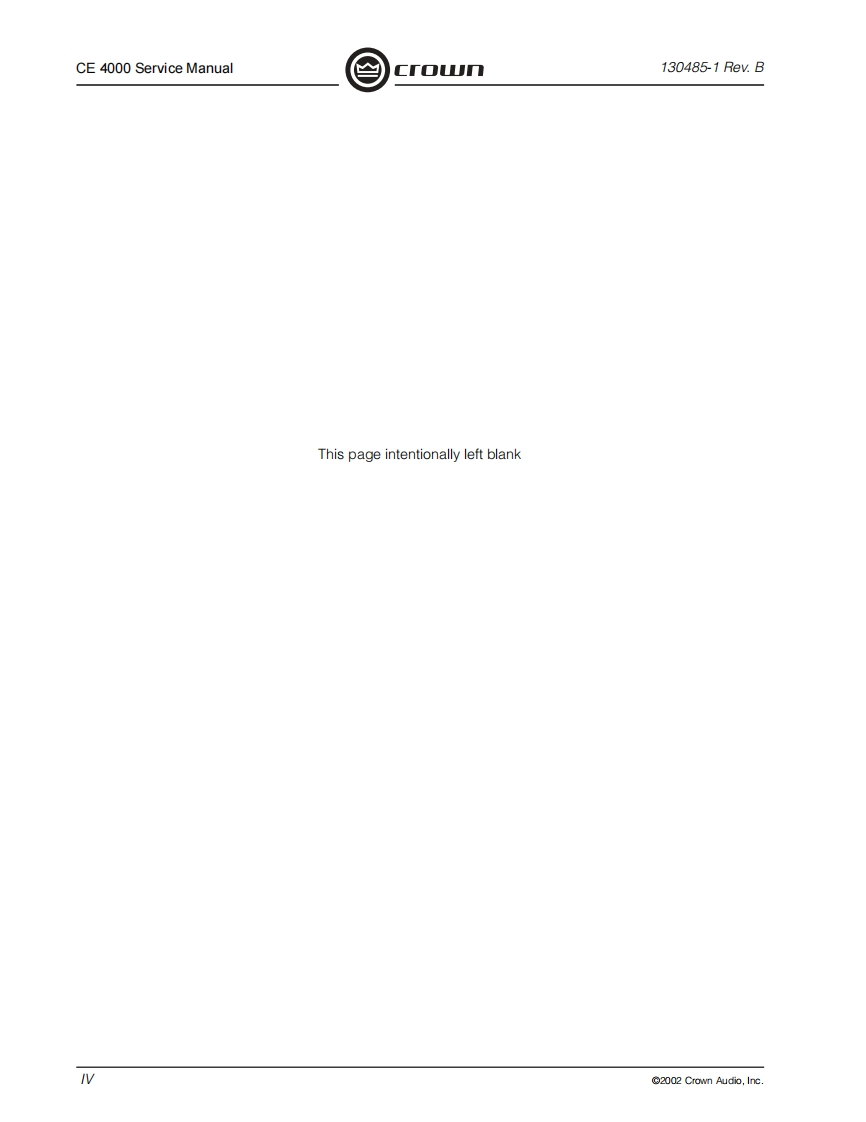 C「o几POWER AMPLIFIERSERVICE MANUALCE SeriesCE4000Some models may be exported under the name Amcron2002 by Crown Audio,Inc.,P.O.Box 1000,Elkhart,Indiana 46515-1000 U.S.A.Telephone:574-294-8000.Trademark Notice:Amcron and Crown are registered trademarks of Crownnternational.Other trademarks are the property of their respective owners.H A Harman International Company130485-111/02Rev.B