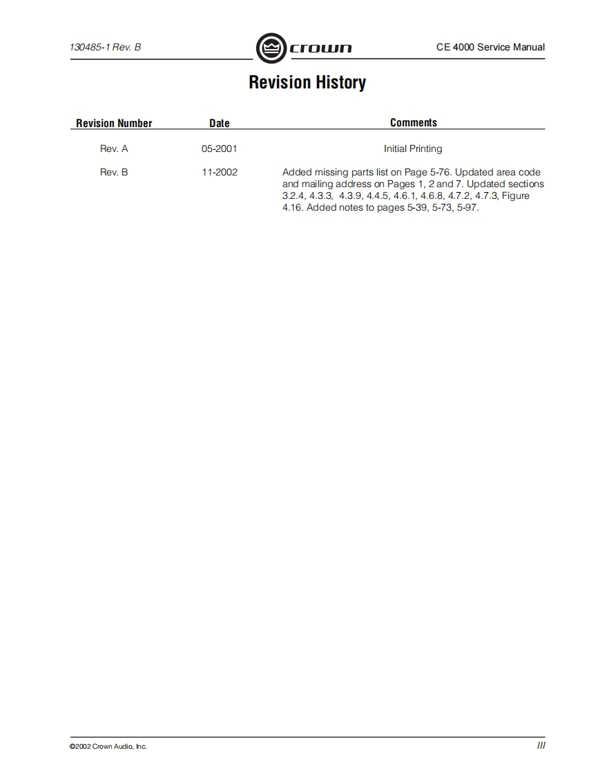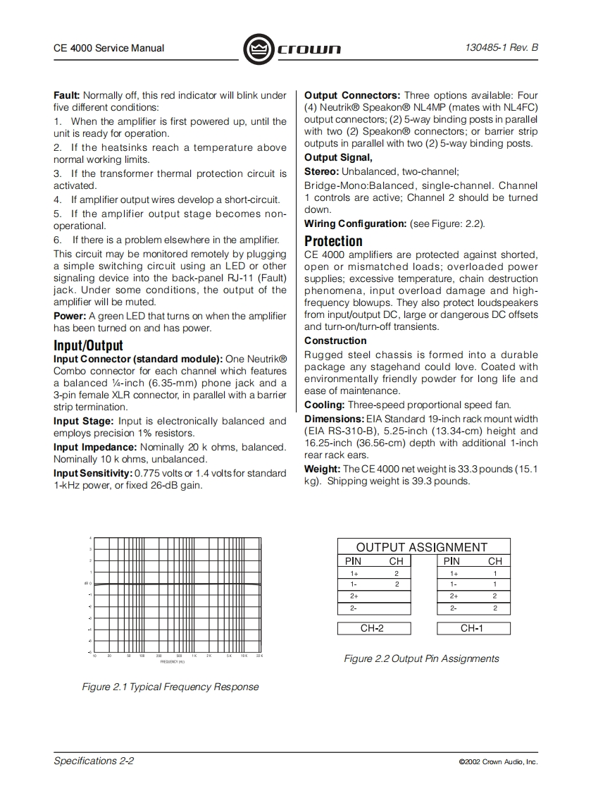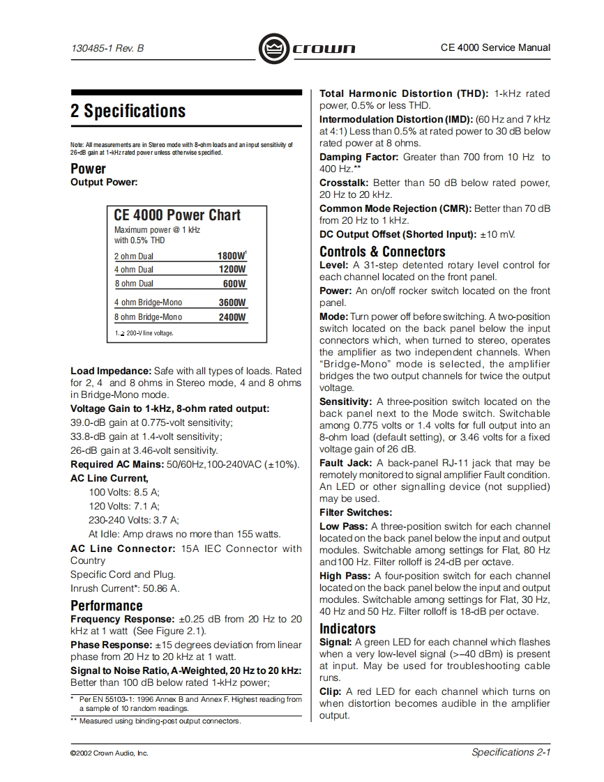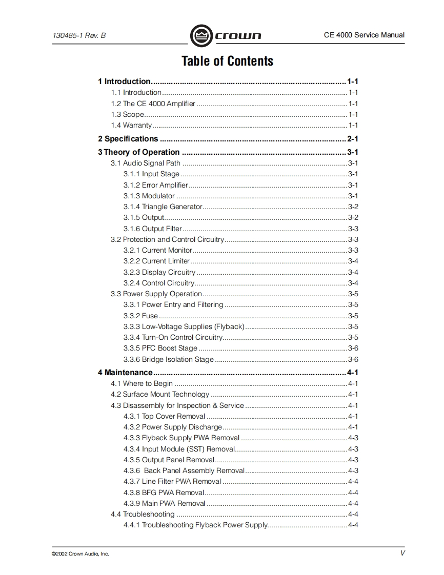 C「o几POWER AMPLIFIERSERVICE MANUALCE SeriesCE4000Some models may be exported under the name Amcron2002 by Crown Audio,Inc.,P.O.Box 1000,Elkhart,Indiana 46515-1000 U.S.A.Telephone:574-294-8000.Trademark Notice:Amcron and Crown are registered trademarks of Crownnternational.Other trademarks are the property of their respective owners.H A Harman International Company130485-111/02Rev.B