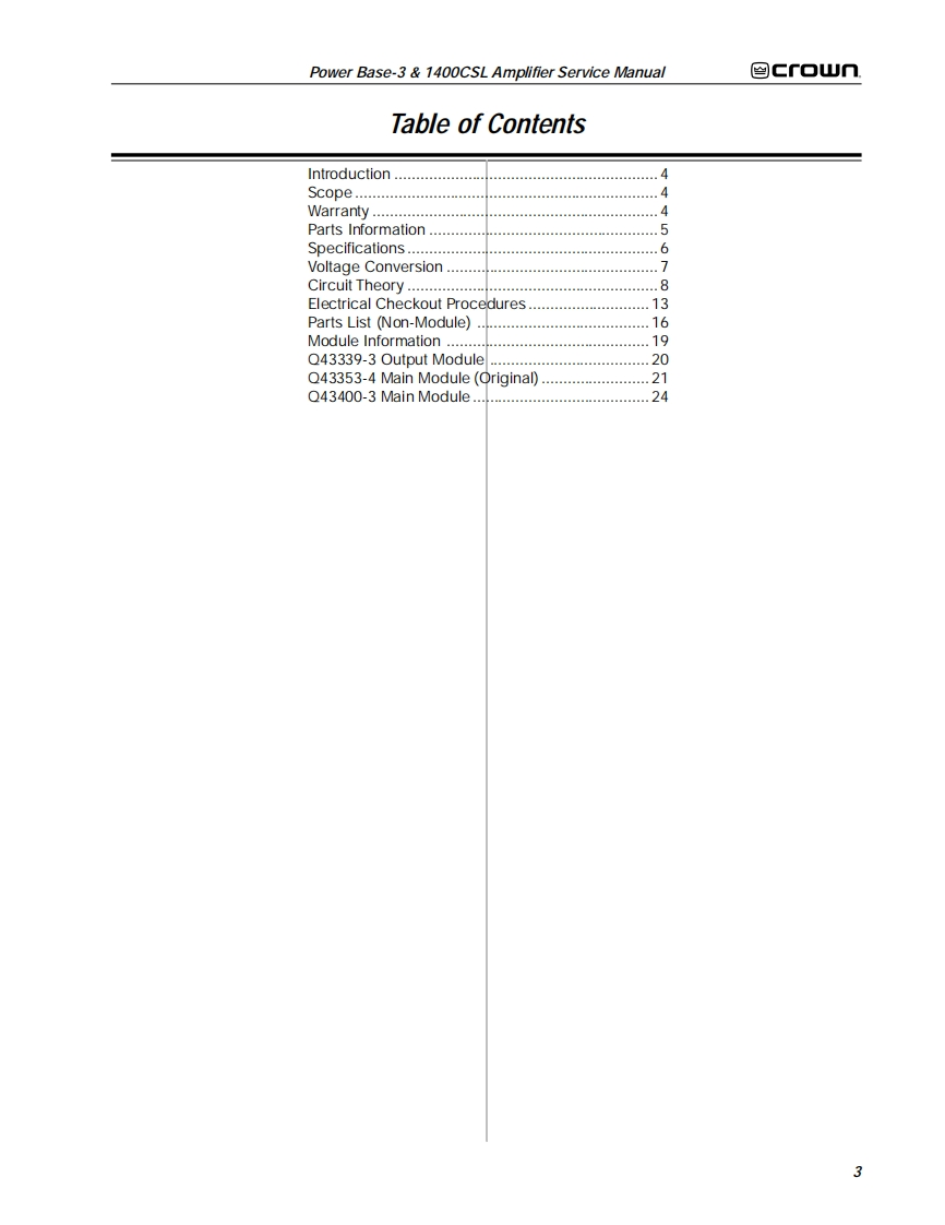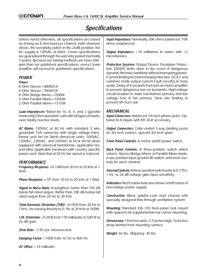 ≌Gf▣UTHE PROFESSIONAL AUDIO DIVISION OF CROWN INTERNATIONAL.INC.POWER AMPLIFIERSERVICE MANUALPOWER BASE-3 1400CSL1995 by CROWN INTERNATIONAL,INC.Mailing Address.Shipping Address:P.0.Box100057620C.R.105Elkhart.IN U.S.A.46515-1000Elkhart,IN U.S.A.46517CSLand Power Base are trademarks,andODEP and Crown are registered trademarks of Crown International,Inc.K-SVCPB36-95