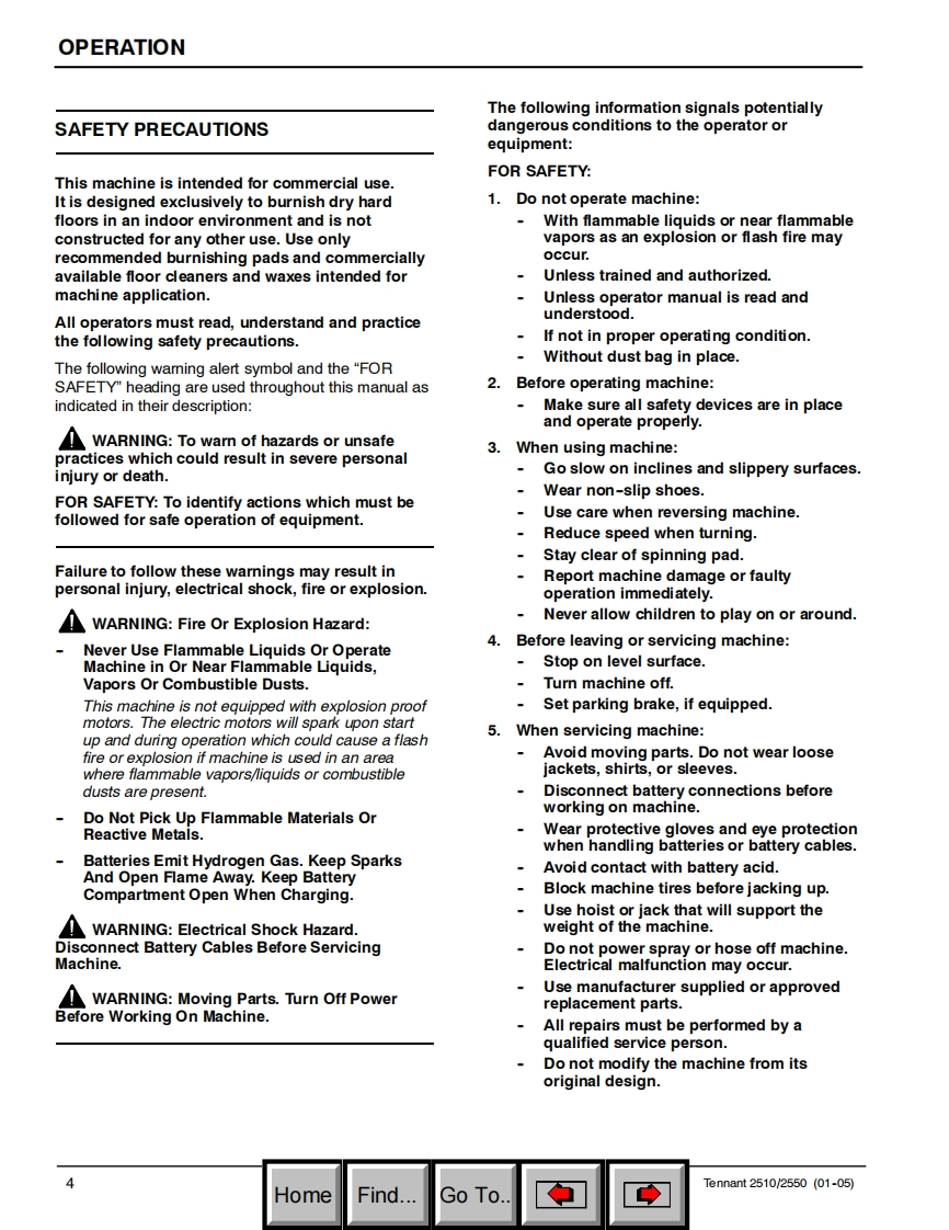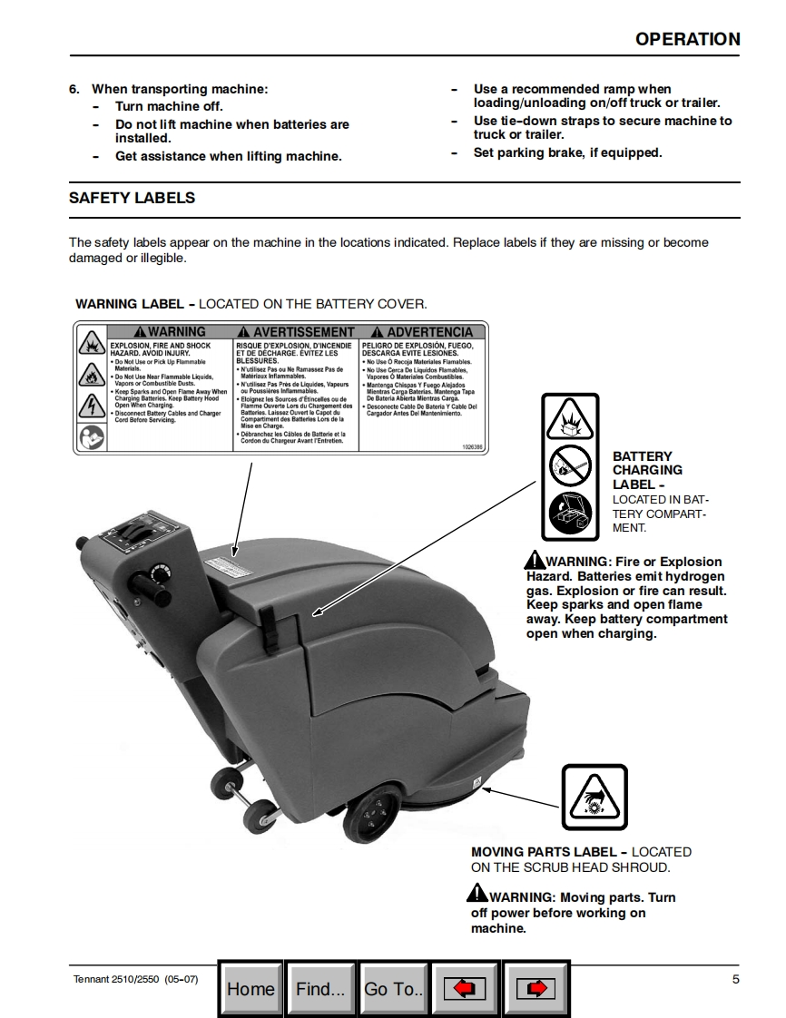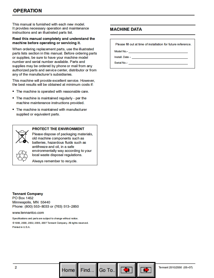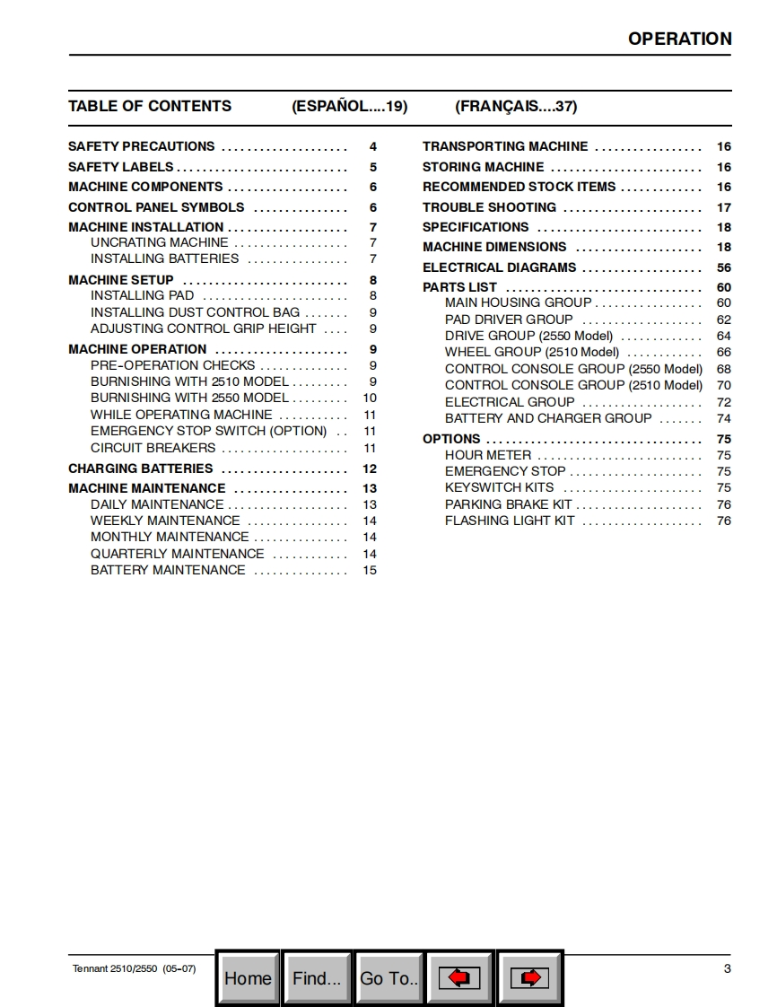 ENGUSH-ESPANOL-FRANCAISTENNANT2510/255036 Volt Dust Control BurnisherPulidora con control de polvo de 36VMachine a polir a systeme de controle dela poussiere de 36VOperator and Parts ManualManual De OperadorY Lista De RepuestosOperateur Manuel etListe Des PiecesModel Part No.:607598-2510607599-2510Pac610688-2510Can.Pac607595-2550607596-2550Pac610687-2550Can.Pac607597Rev.04(05-2007)www.tennantco.comHomeFind...Go To.