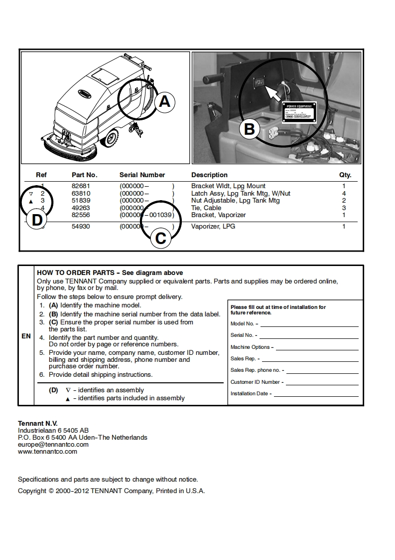 TENNANT5680(Electric)Walk-Behind ScrubberParts Manual@0FaSTFoam Scrubbing TechnologyAn ORBIO TechnologyTennantTrue PartsHygenic Fully Cleanable Tanks▣▣To view,print or downloadthe latest manual,visit:www.tennantco.com/manuals330456C€ReV.13(08-2012)ww.tennantco.com