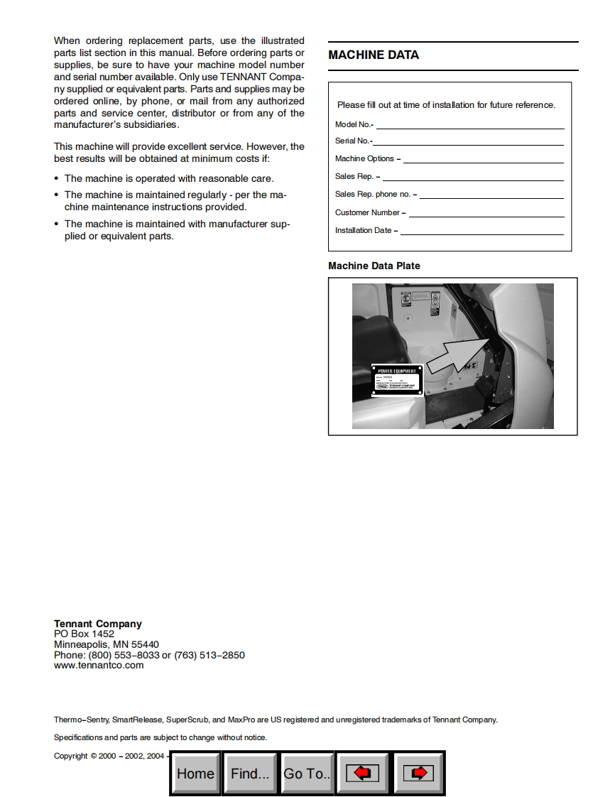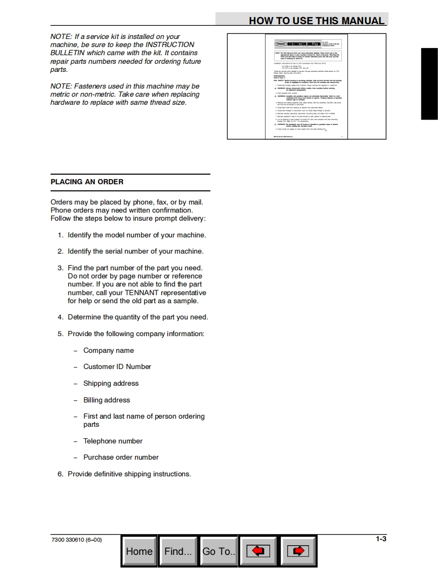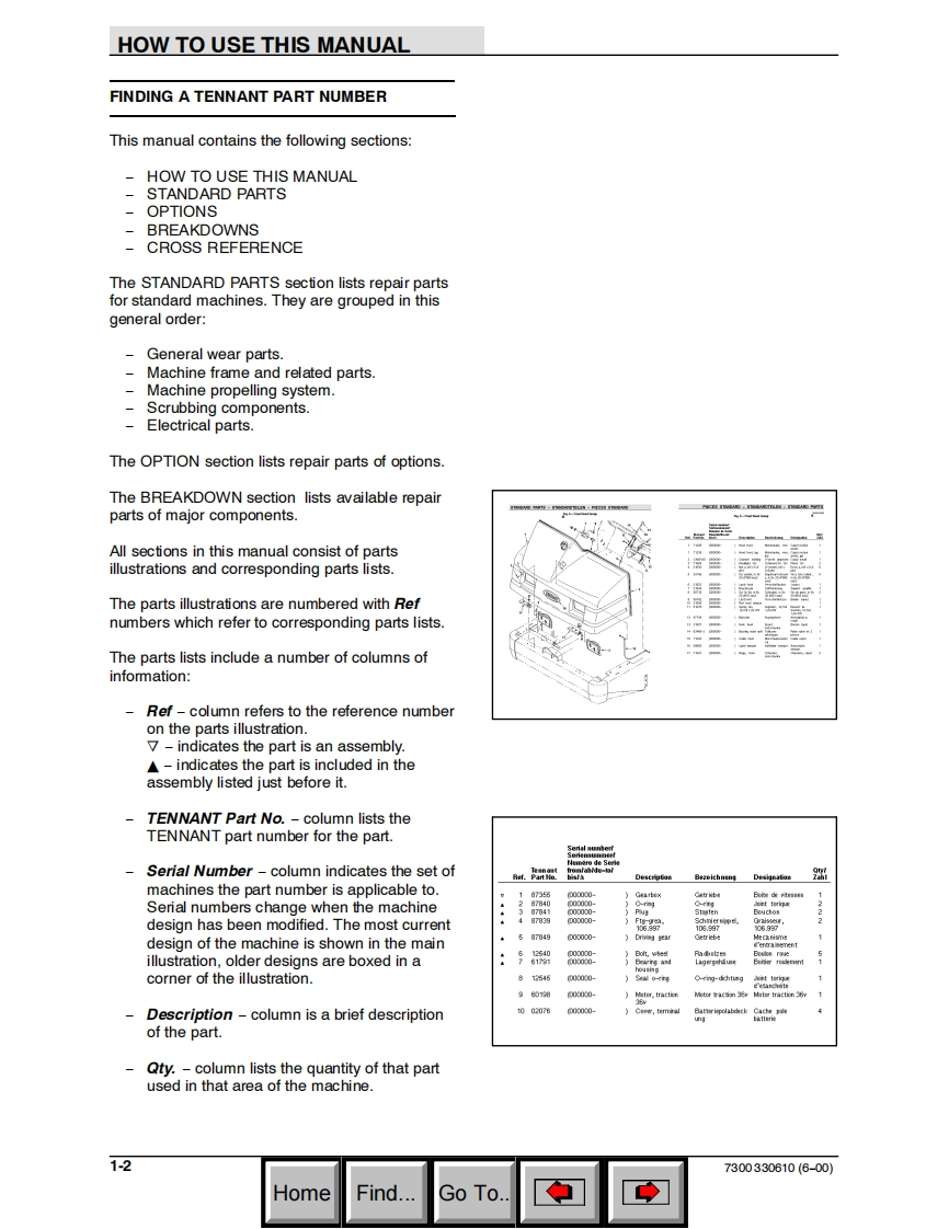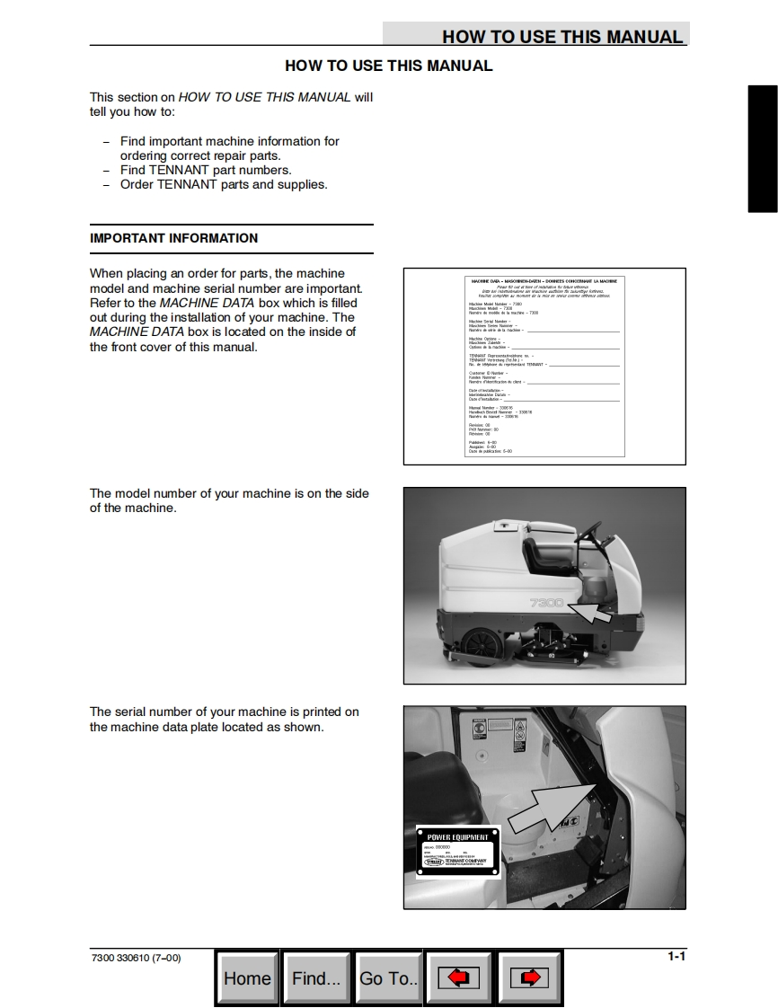 TENNANT7300(Battery)Rider ScrubberParts Manual@0SFoam Scrubbing TechnologyH2The Safe Scrubbing AlternativeAn ORBIOTechnologyES Extended Scrub SystemTennantTrue®PartsIRISTM a Tennant TechnologyNorth America International330610To view,print or downloadRe.17(7-2012)the latest manual,visitwww.tennantHomeFind.…Go To.