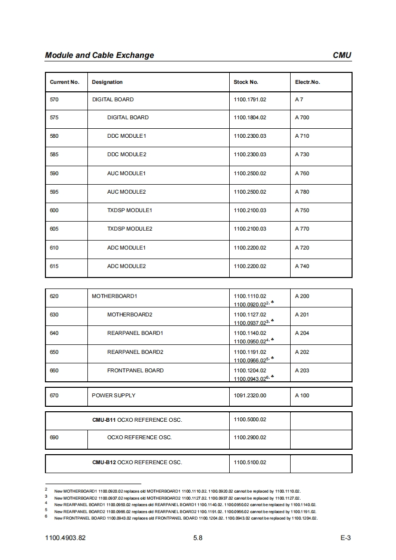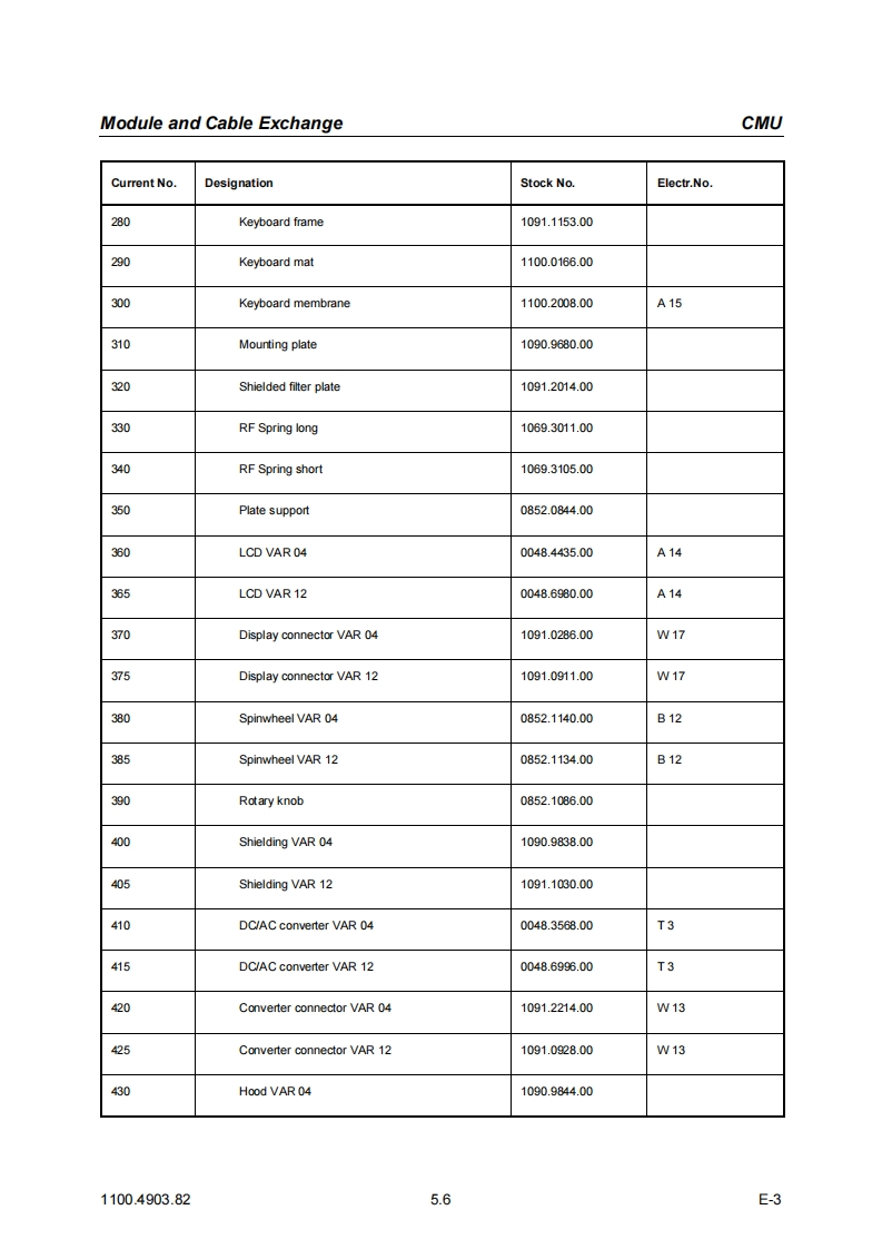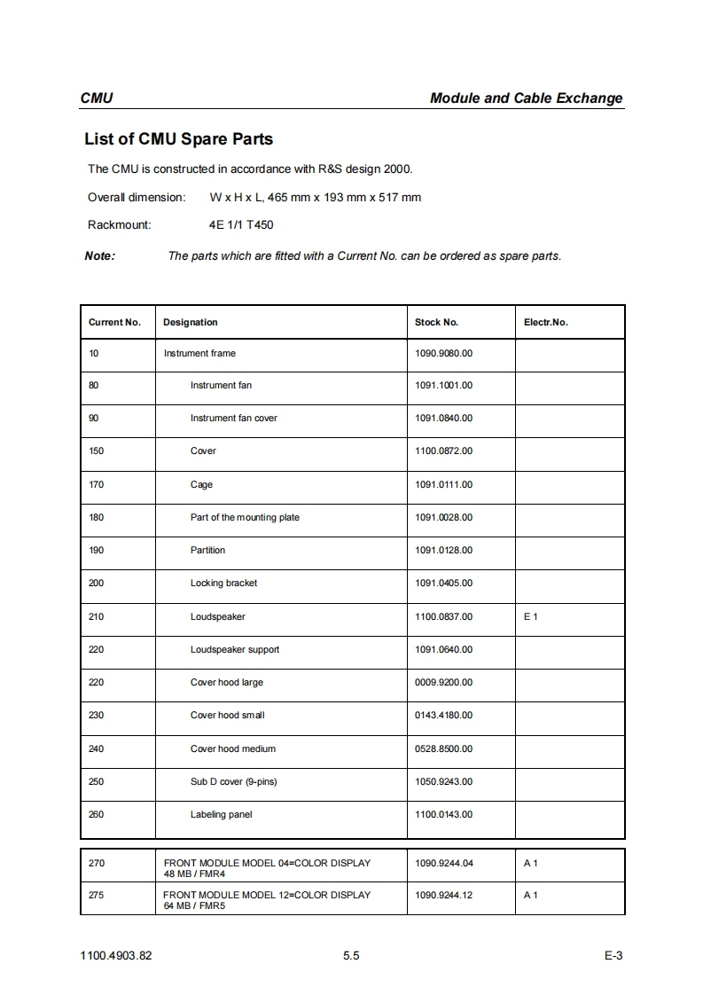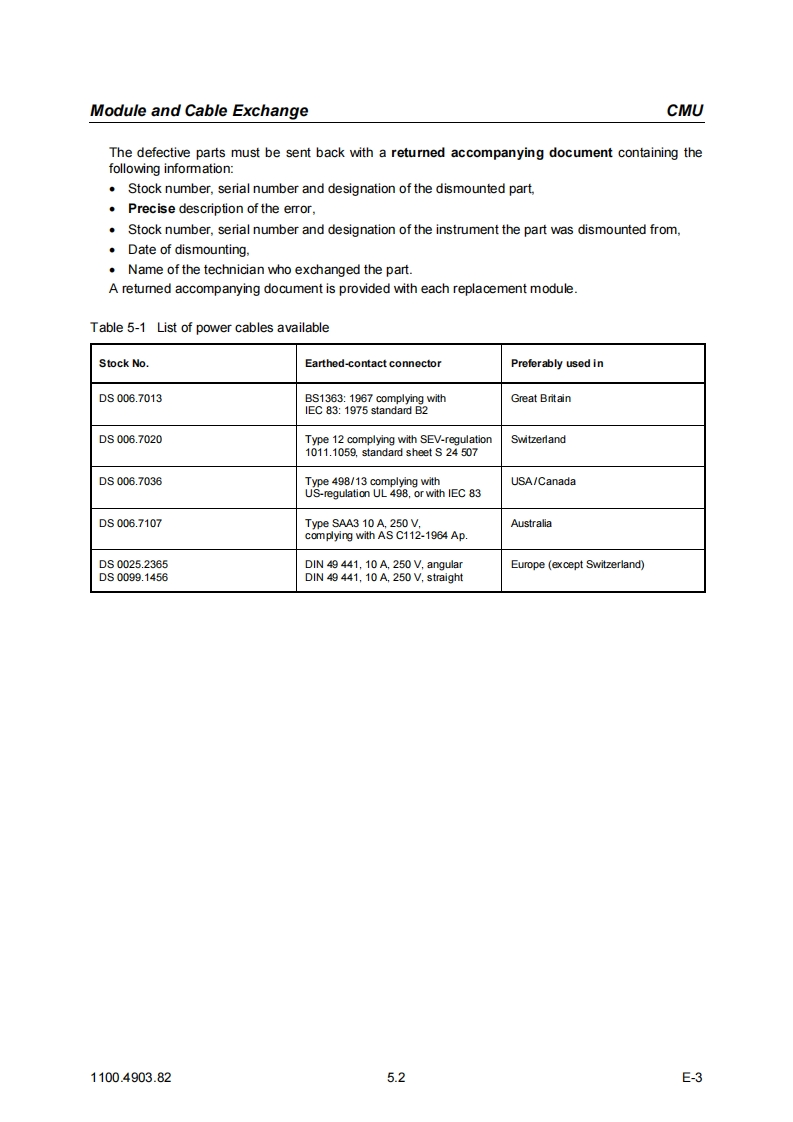 CMUModule and Cable Exchange5DocumentsThis chapter contains the documents for the CMU basic unit.The documents for the modules with thedescription of function,adjustment and interfaces are relegated to the Service Manual,Stock no.1110.4903.92.To order replacement parts and modules please contact our spare parts express serviceor your Rohde Schwarz service representative and note the hints given in the following section,Module and Cable Exchange.The address of our spare parts express service and a list of Rohde Schwarz representatives can befound at the beginning of this service manual.Module and Cable ExchangeTable 5-1 at the end of this section lists all power cables available.The stock numbers necessary forordering replacement parts and modules can be found in the component lists further down.Important Note!When replacing a module please note the safety instructions and the repair in-structions given in chapter 3 of this service manual.Ordering replacement partsTo deliver replacement parts promptly and correctly we need the following indications:Stock number(see component lists in this chapter)·DesignationComponent number according to component list·Number of piecesInstrument type the replacement part belongs toContact person for possible questionsReplaced modulesReplaced modules are an economic altemative for original modules.It should be kept in mind thatreplaced modules are not new,but repaired and fully tested parts.They may have traces from usebut they are electrically and mechanically equivalent to new modules.To find out which replaced modules are available,please refer to your Rohde Schwarz representa-tive (or to the central service division,Rohde Schwarz Munich).The identification number is usuallythe same as for the original module,but with a variant index.95,.96,.97 or.98.Ordering and delivery of replaced modulesFor ordering replaced modules,the same indications as for ordinary parts are required,however,with the corresponding variant index appended to the stock number.Taking back defective replacement modulesDefective modules of the replacement program which can be repaired are taken back within3 months after delivery of the replaced module.A repurchasing value is credited.Excluded are parts which can not be repaired,e.g.PCBs that are burnt,broken or damaged by repairattempts,incomplete modules,parts which are heavily damaged mechanically.1100.4903.825.1E-3