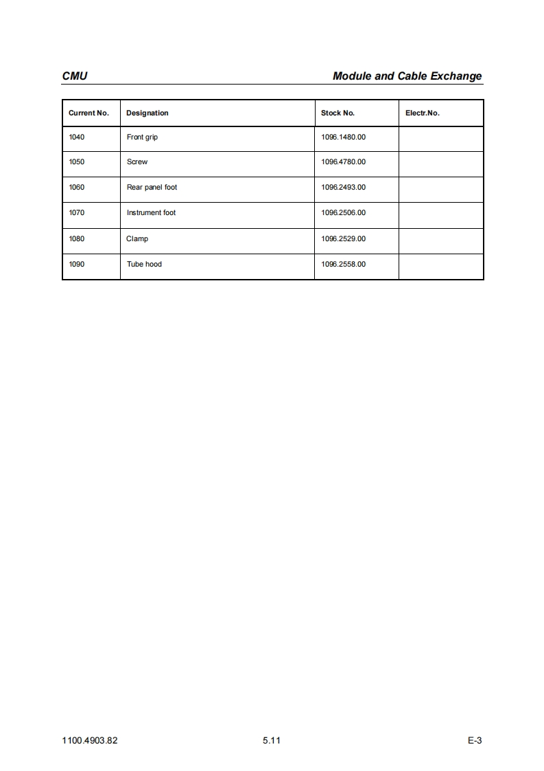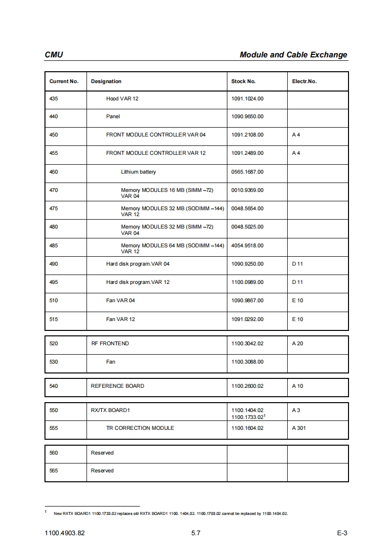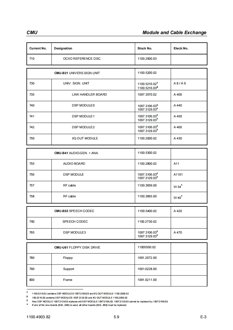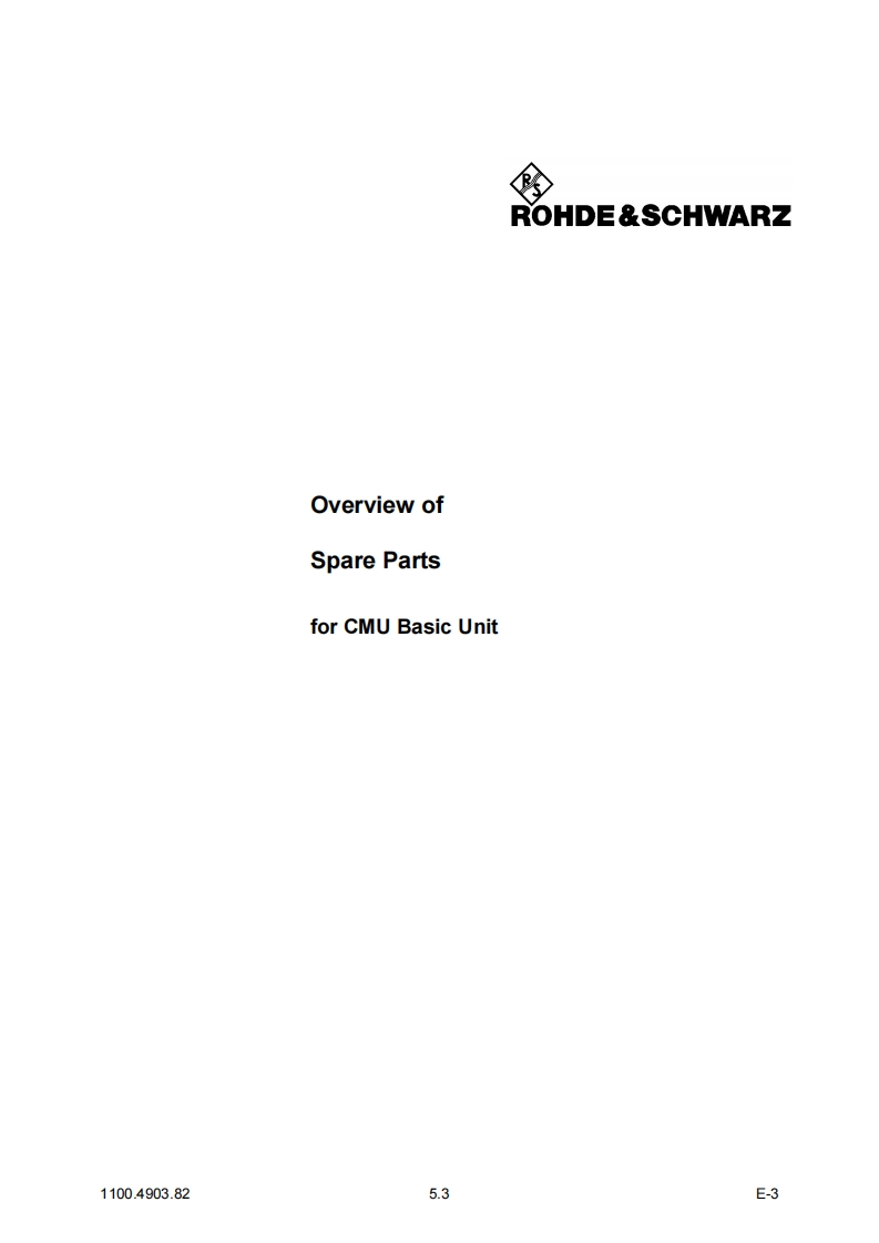 CMUModule and Cable Exchange5DocumentsThis chapter contains the documents for the CMU basic unit.The documents for the modules with thedescription of function,adjustment and interfaces are relegated to the Service Manual,Stock no.1110.4903.92.To order replacement parts and modules please contact our spare parts express serviceor your Rohde Schwarz service representative and note the hints given in the following section,Module and Cable Exchange.The address of our spare parts express service and a list of Rohde Schwarz representatives can befound at the beginning of this service manual.Module and Cable ExchangeTable 5-1 at the end of this section lists all power cables available.The stock numbers necessary forordering replacement parts and modules can be found in the component lists further down.Important Note!When replacing a module please note the safety instructions and the repair in-structions given in chapter 3 of this service manual.Ordering replacement partsTo deliver replacement parts promptly and correctly we need the following indications:Stock number(see component lists in this chapter)·DesignationComponent number according to component list·Number of piecesInstrument type the replacement part belongs toContact person for possible questionsReplaced modulesReplaced modules are an economic altemative for original modules.It should be kept in mind thatreplaced modules are not new,but repaired and fully tested parts.They may have traces from usebut they are electrically and mechanically equivalent to new modules.To find out which replaced modules are available,please refer to your Rohde Schwarz representa-tive (or to the central service division,Rohde Schwarz Munich).The identification number is usuallythe same as for the original module,but with a variant index.95,.96,.97 or.98.Ordering and delivery of replaced modulesFor ordering replaced modules,the same indications as for ordinary parts are required,however,with the corresponding variant index appended to the stock number.Taking back defective replacement modulesDefective modules of the replacement program which can be repaired are taken back within3 months after delivery of the replaced module.A repurchasing value is credited.Excluded are parts which can not be repaired,e.g.PCBs that are burnt,broken or damaged by repairattempts,incomplete modules,parts which are heavily damaged mechanically.1100.4903.825.1E-3