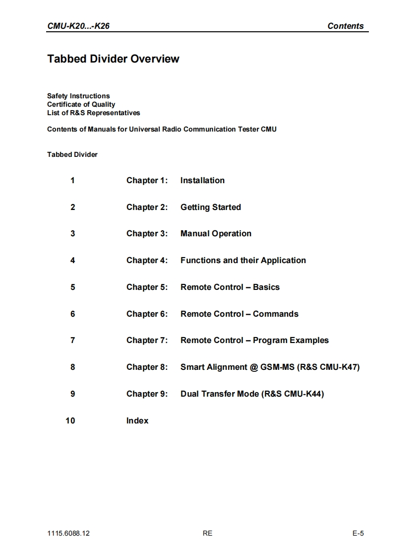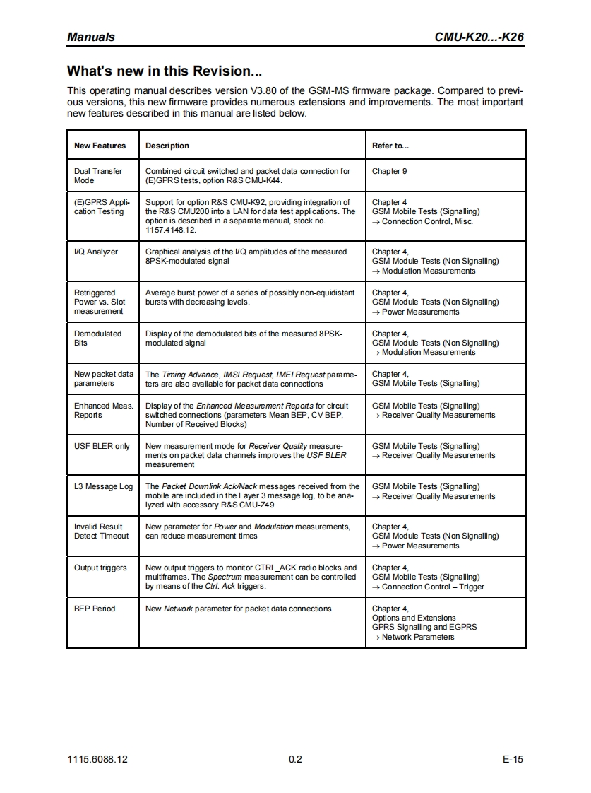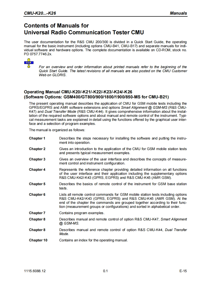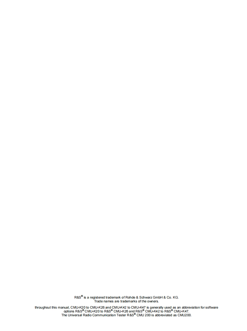 ROHDE &SCHWARZTest and MeasurementDivisionOperating ManualSoftware Options:GSM400/GT800/850/900/1800/1900-MSfor CMU-B21R&S®CMU-K20/-K21/-K22/-K23/-K24/-K261115.5900.02/6007.02/6107.02/6207.02/6307.02/6507.02Including the following extensions:GPRS/EGPRS Software ExtensionR&S®CMU-K42-K431115.4691.021115.6907.02AMR GSM for CMU 200R&S®CMU-K451150.3100.02Smart Alignment GSM-MSR&S®CMU-K471157.4477.02Dual Transfer ModeR&S®CMU-K441157.4277.02Printed in Gemmany1115.6088.12-16-1