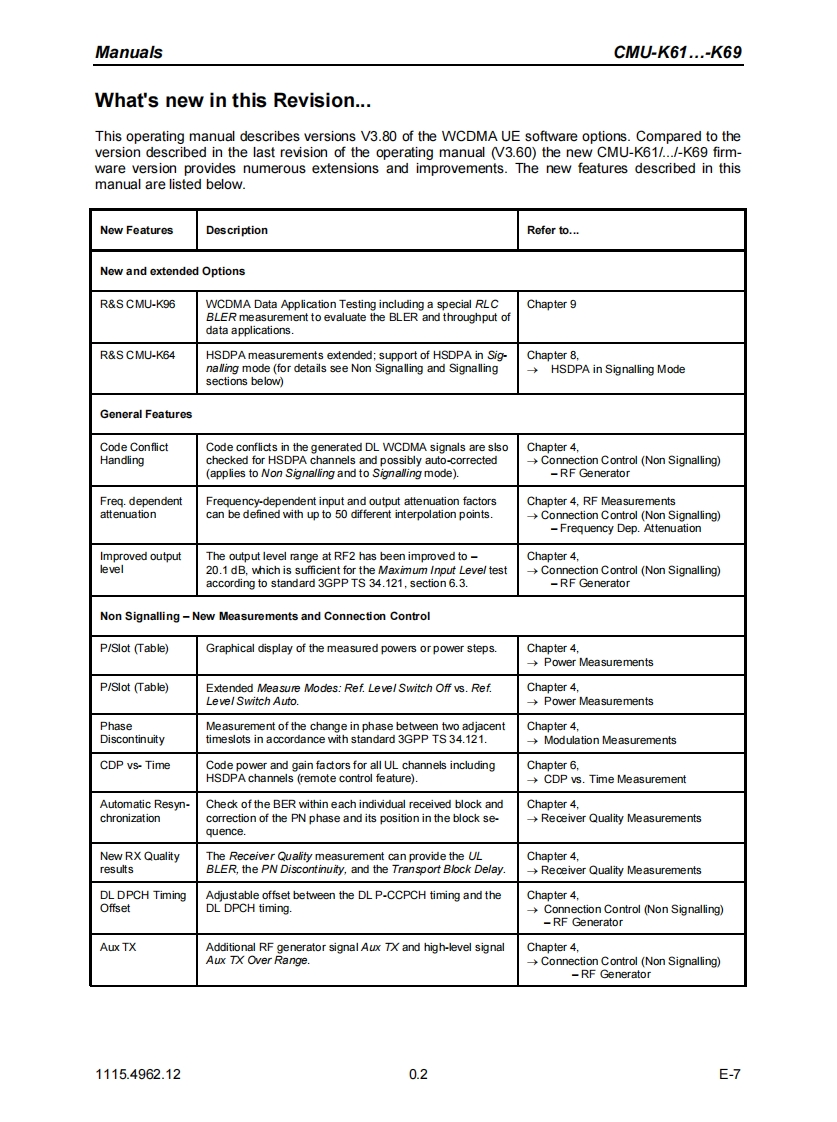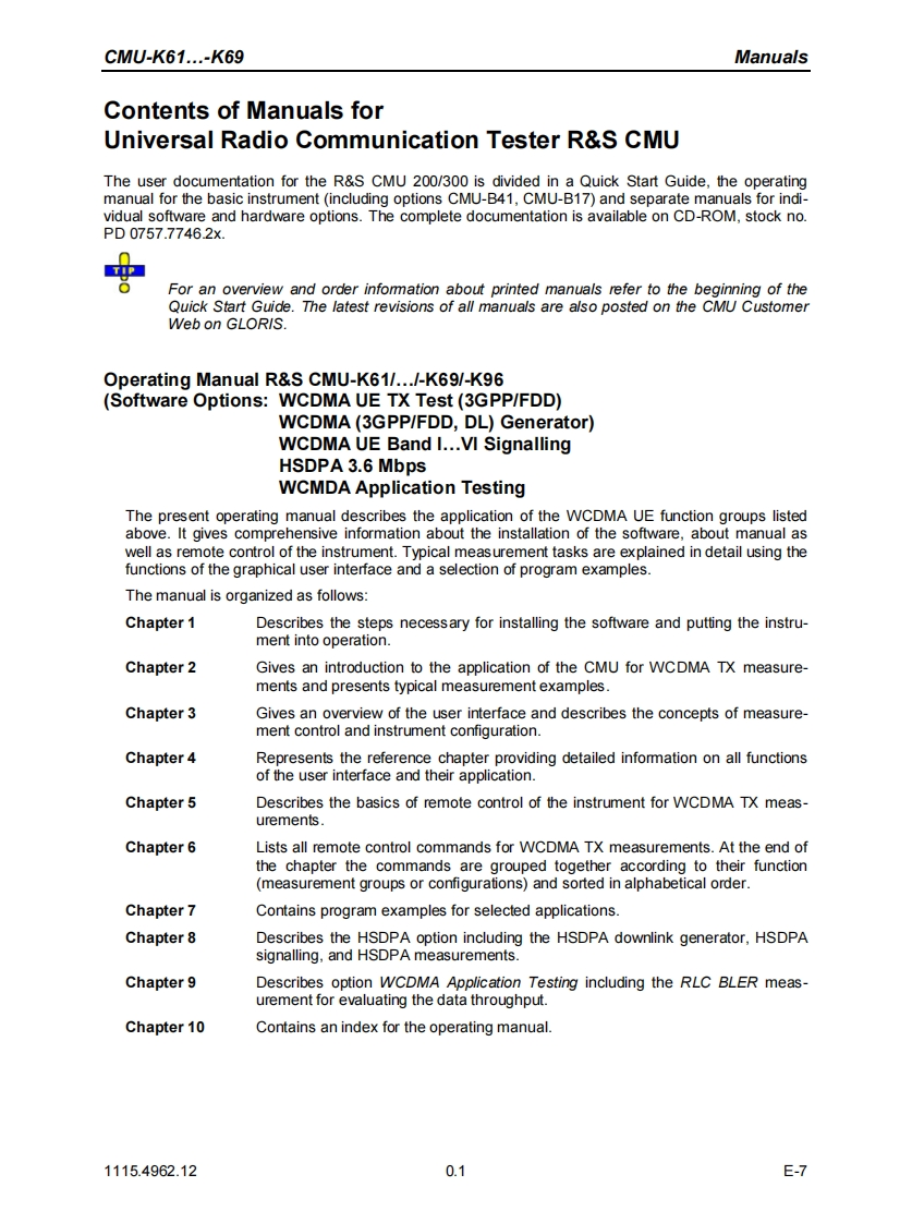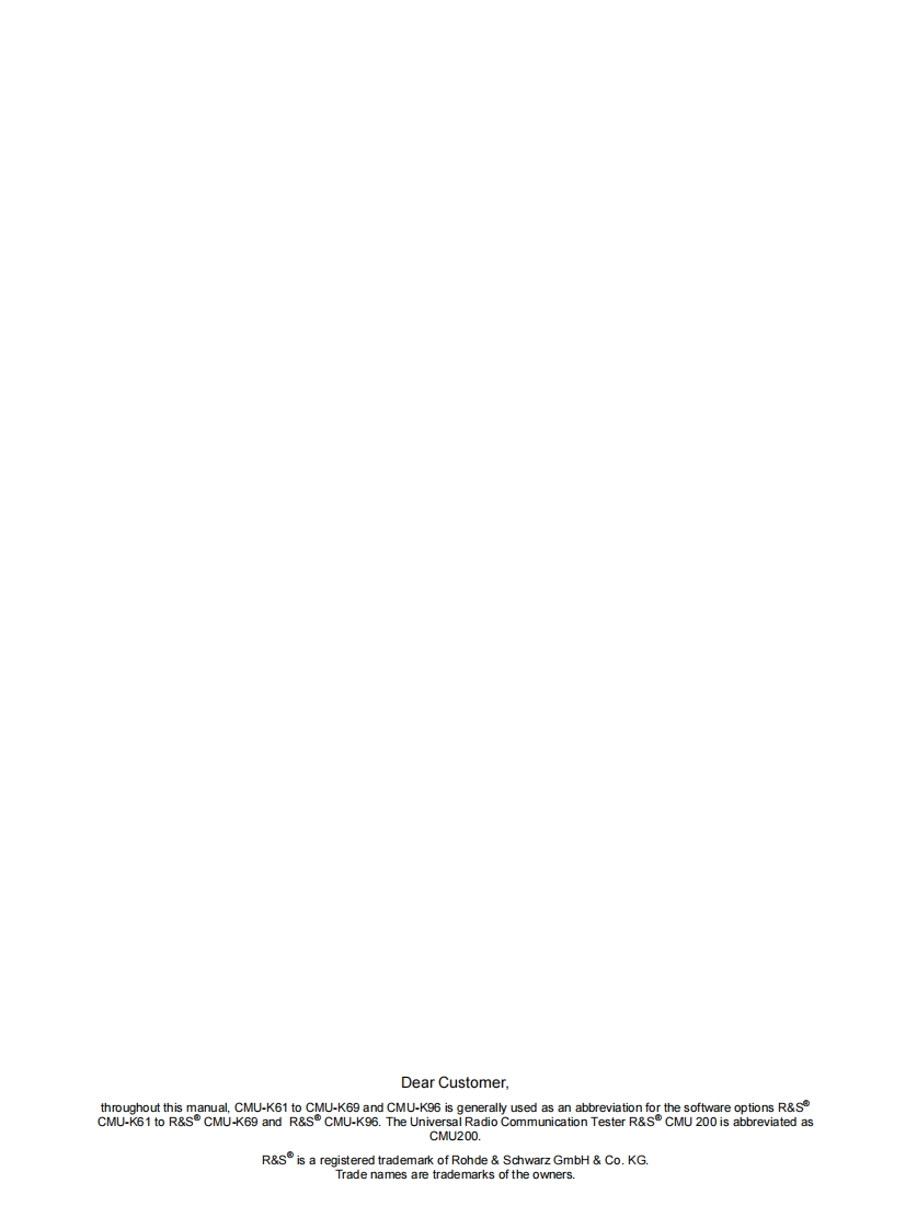 ROHDE &SCHWARZTest and MeasurementDivisionOperating ManualSoftware OptionsWCDMA UE TX Test(3GPP/FDD)R&S®CMU-K651115.4891.02WCDMA(3GPP/FDD,DL)GeneratorR&S CMU-K661115.5100.02WCDMA UE Band Ill /I/II/IV/V/VI SignallingR&S®CMU-K67/-K68/-K69/-K61-K62I-K631150.3000.02/1115.5300.02/1115.5400.021157.3670.02/1157.3770.02/1157.3870.02HSDPA 3.6 MbpsR&S®CMU-K641157.3970.02WCDMA Application TestingR&S®CMU-K961157.4177.02Printed Germany1115.4962.12-08
