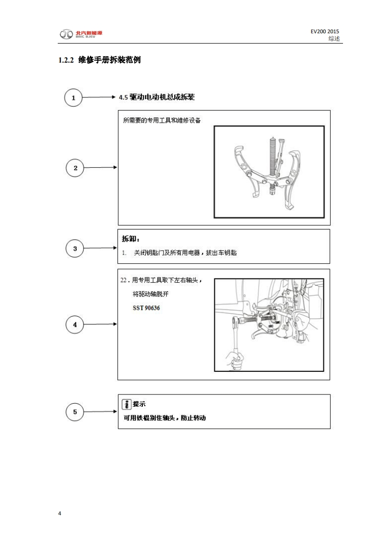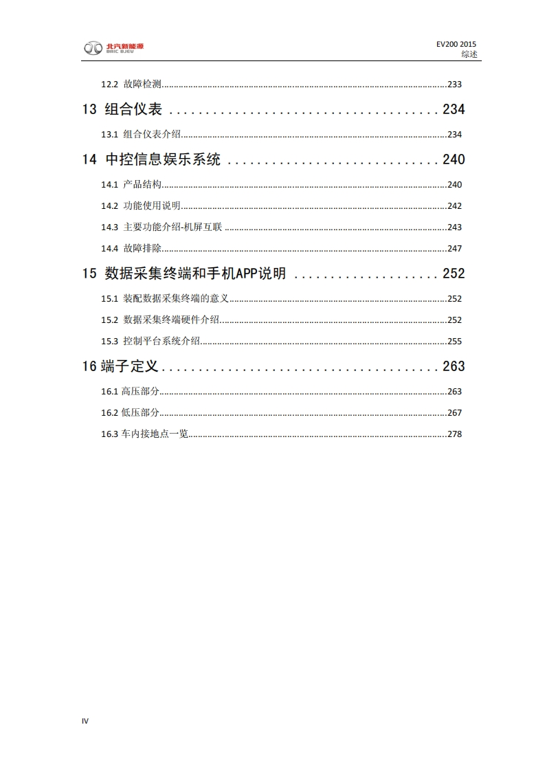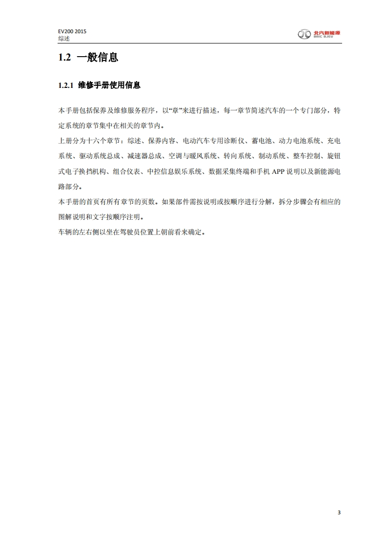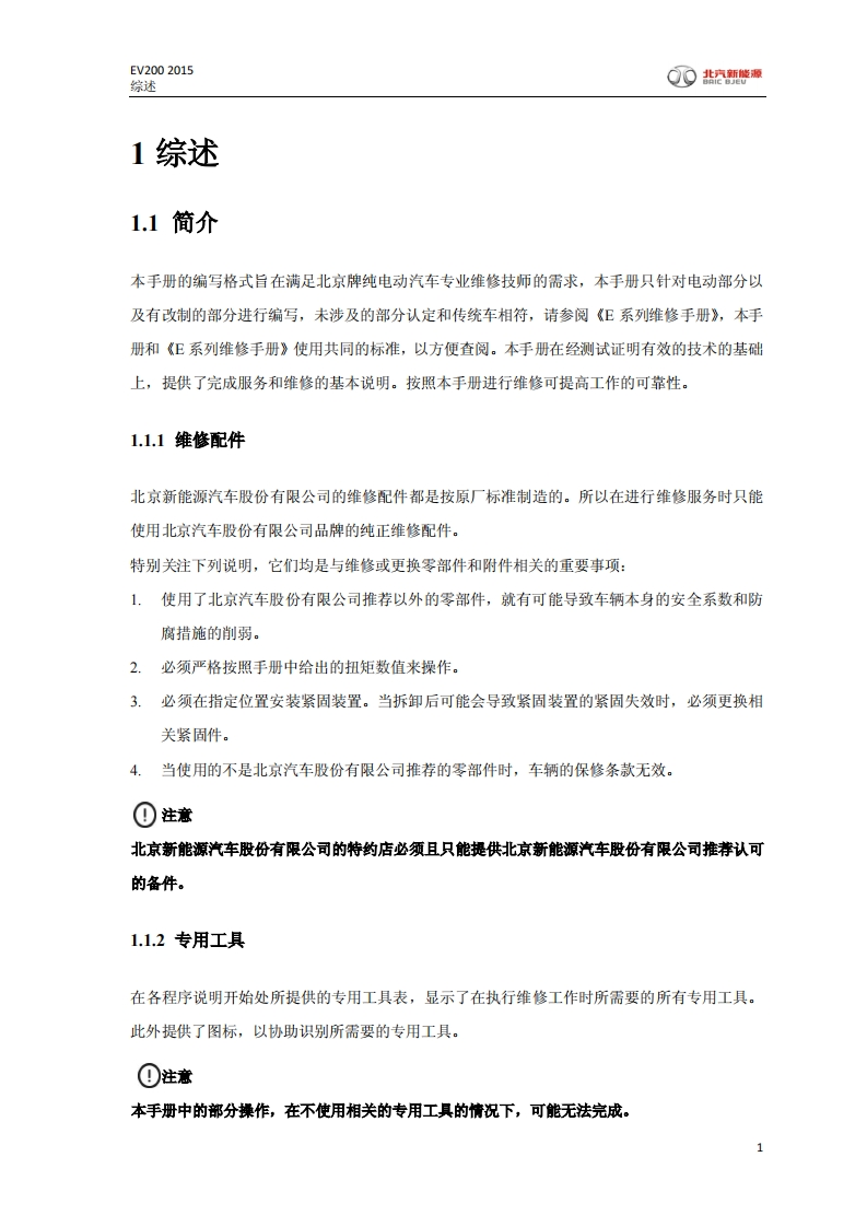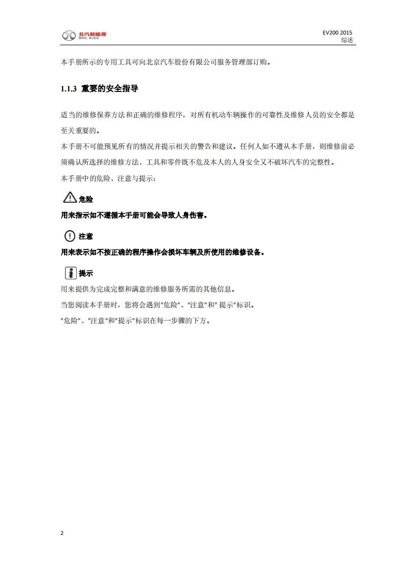 EV2002015目录Q9北产新能源1综述11.1简介...11.2一般信息.1.3标准作业程序.1.4动力电池相关要求1.5健康与安全….141.6环境防范..201.7维修注意事项..221.8锁紧装置.….231.9固定件标识.….261.10螺纹..281.11接合和接合面.….281.12如何确定螺母强度..291.13如何确定螺栓的强度..301.14标准螺栓的规定扭矩311.15技术规格……332保养内容352.1车辆测试。..352.2保养工作..392.3工作描述..432.4空调系统532.5转向系统...552.6充电系统..562.7DCDC功能.582.8底盘.592.9车身部分.632.10动力电池系统.742.11冷却系统.….772.12其它部分81