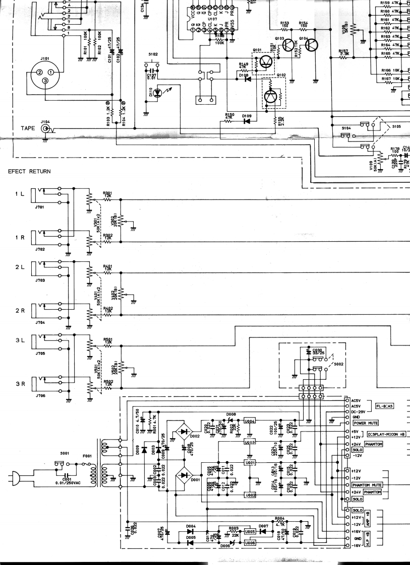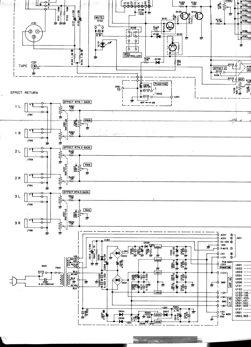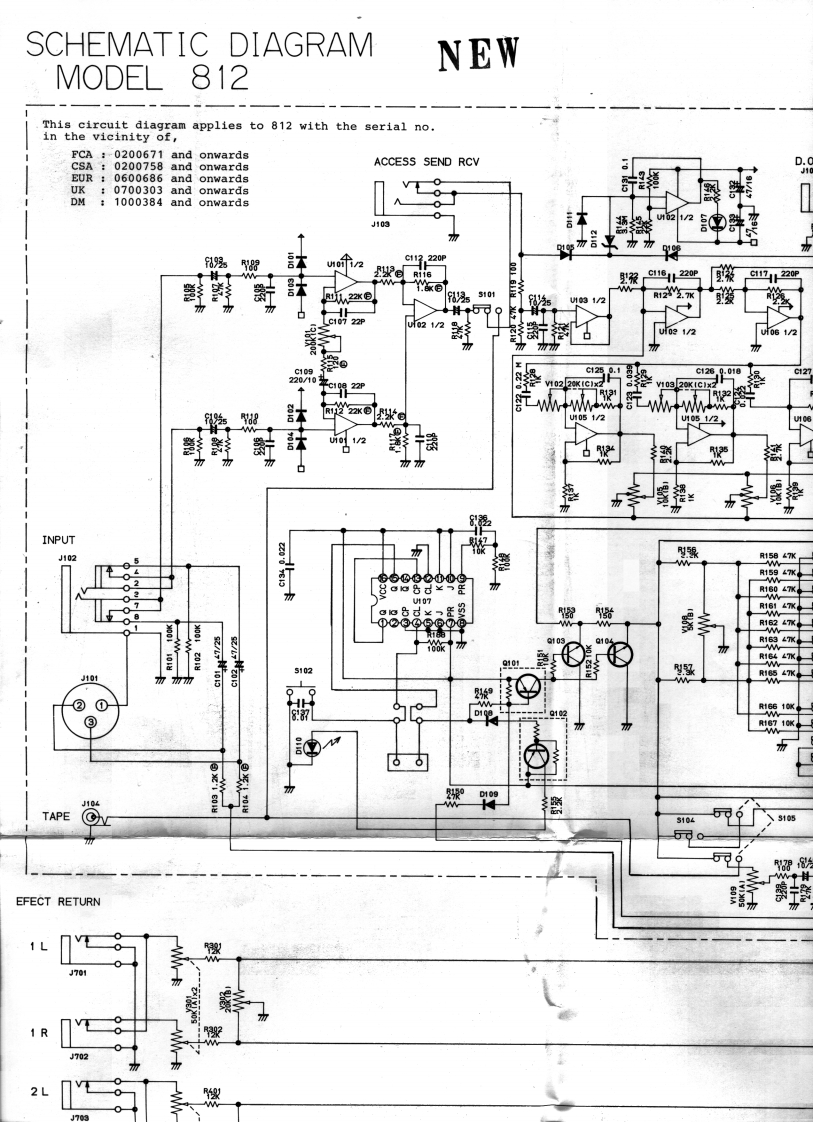 SCHEMATIC DIAGRAMMODEL 812ACCESS SEND RCVPEA☒J103中C112.220PR116116220r装22355101U1031/2/2TRIM]新uo31/210220KG1x210320KC1xR132食1222x1/2512鉴INPUTJ102$R15927PANR1610器R18船J101②①CORTROLLER2°TAPEEFFECT 26可0PHANTOMEFFECT RETURN/500224vEFFECT RTN 1 GAINJ70时PANEFFECT RTN 2 GAIN