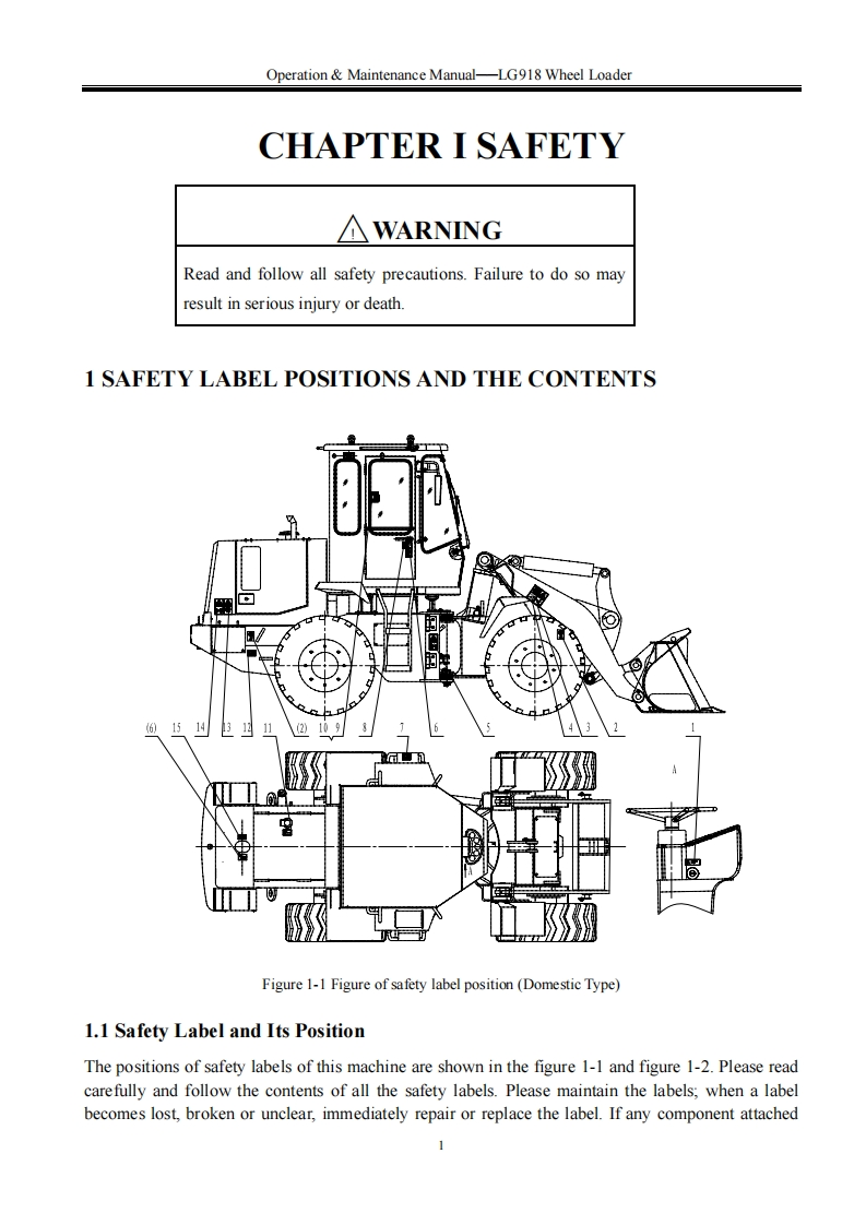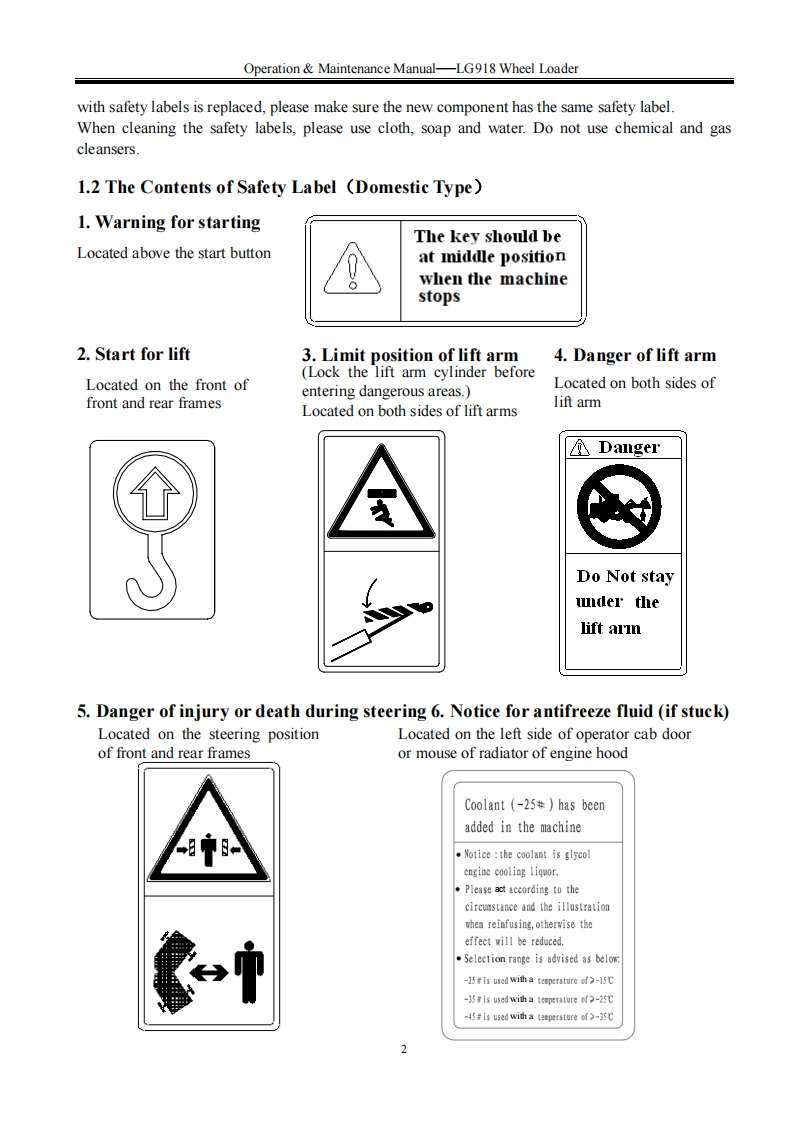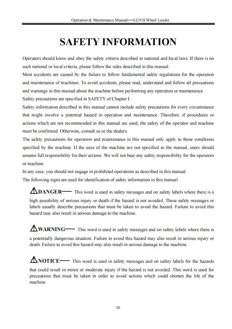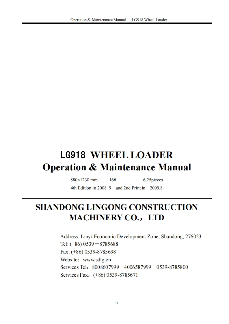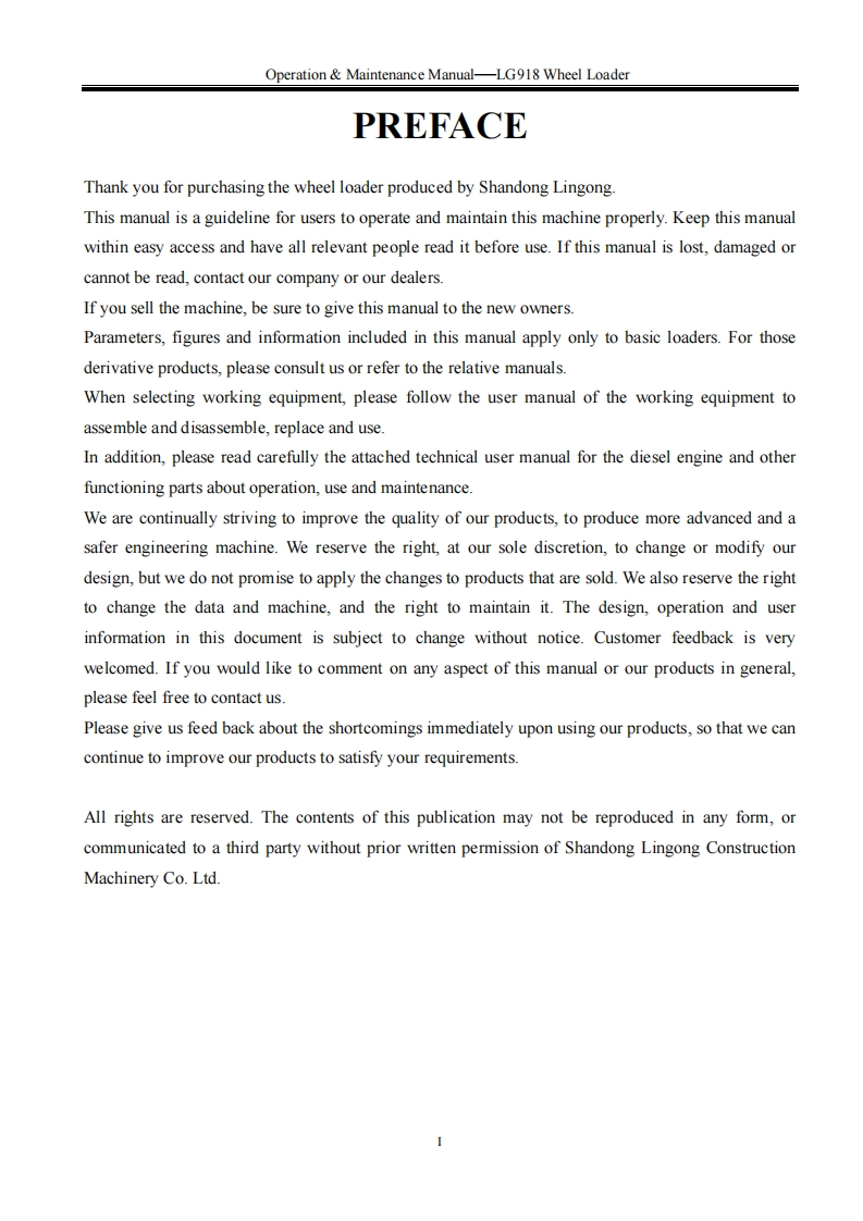 SHANDONG LNGONGSPLGMember of Volvo's GroupOperation Maintenance ManualLG918WHEEL LOADERWARNINGOperators and maintenance persons should read this manualcarefully and understand these instructions before use toavoid serious accident.For the convenience of relevantpeople using this manual,it should be easily accessable andkept in readable condition.SHANDONG LINGONG CONSTRUCTION MACHINERY CO.,LTD