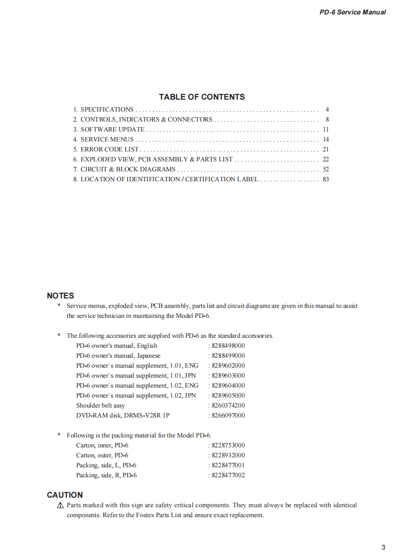 Service ManualModelPD-6DVD LOCATION RECORDERVISIBLE OR INVISIBLE LASER RADIATION WHEN OPENAVOID DIRECT EXPOSURE TO BEAM.Use of controls or adjustments or performance of proceduresother than those specified herein may result in hazardousradiation exposure.The use of optical instruments with this product will increaseeye hazard.FoStex