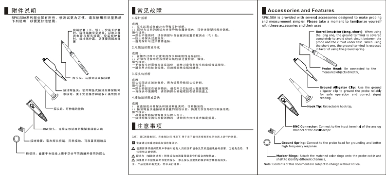 Troubleshooting探头参数Prob0 Characteristios)1.Probe tip is broken aff:性传指标(Technical Specifications)RIGOL'The probe falls off or other physkcal impact breaks of the probe tlp.希宽[-3d)Bandwidth (-3dB)1.5GH2用户手册h1Bg生把b品:po whichfadesthe mtal tip and adts don衰减比Attenustion Reatio10:1(Fixed)Tips:输入电阻深头+示渡器)Input Resistance (Probe+Scopel5000±100User's Guide-Please do not kee the probe on the test point [holel when it is not used一Do nat et0muc ressure an the probe输入电容Input Capacitance1.6ef-Do not connect the probe with hotcbjects.2.Probe wire is broken off or agingl示波器输入偶合Scope Input Coupling502Reasons:b888otigatbatwenthwprebeandatlesbemddtoemuadrmo量大输入电压Maximum Input Voltage (AC RHS)TVCAT Ili.The cable is strained or twisted too much during cperation or storage.一般规精(General Specifications)0-50℃ngprobe and do st bnd the com t腰作乐液Operation Environment0~80%RH-20w60℃3.Retractable hook tip is broken off:存虚坏境Storage Environment0=90%RHR4车Ishakenhwdyaieretrocaehooktplsonreted切edevlke醒头限时Cable Length145±20mTipe:探头重量Weight4842g.aC3.动akehewoeateretr3ctatMehooktpsonrectedtothethetrehk tprome devicender tesththee探头零件清单青AcG8*0yKt)4.Ground wire is broken off or missing:北®m名棕借送DescriptionQuantityR6J5055&86glar5Breaksmthenmmecting6rdscomnectingteprobeandhe1探头Probe Head12前端护套《长,短)Barrel Insulator (long,short)2ground allgator clipis conc toth3探头碎Hook Tip1-Do not disconnect the ground alligator dllp from the probe as far as poss ble.42.a3th*ehewocaerthe7oWndstorcpscmnetothe标识环(黄粉.浅蓝.深蓝网arker Rings(yellow,Prklight blue and dark blue)5接地铜鱼夹Ground Alligator ClipNOTES2011 RIGOL Technologies,Inc All Rights Reserved.29maa5womwgro接地健簧Ground Spring2普源精电科技段份有舰公司RIGOL TECHNOLOGIES CO,LTD.RP6150A无源探头C会aw正电子解箱:5 ervice ripol.c0nE-mail:service@rigol.com网是:wwm.ipc0mebsite:w■w.rigol.com△置ePR0区AS区VDLY is ueed is a manser n达pecied by the mun☆cug,nPcaRP6150A Passive Probeprovided by the PRDOEASSEMOL'Y may be impainad.