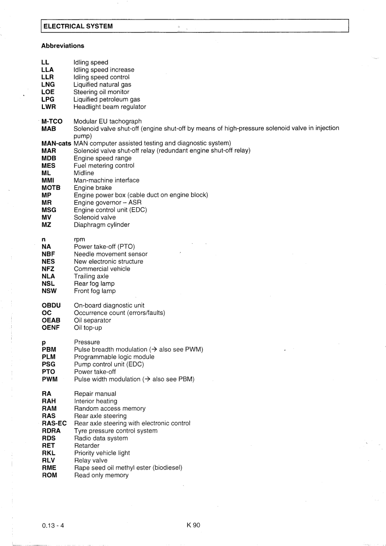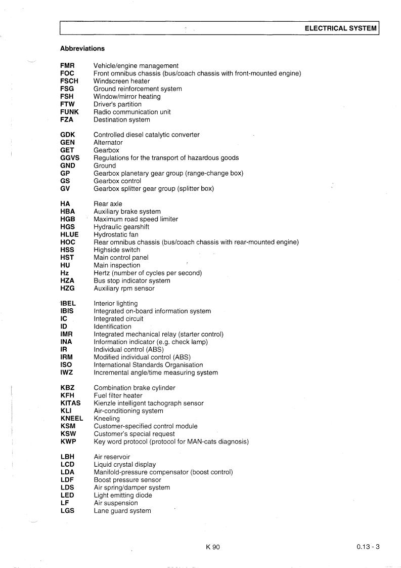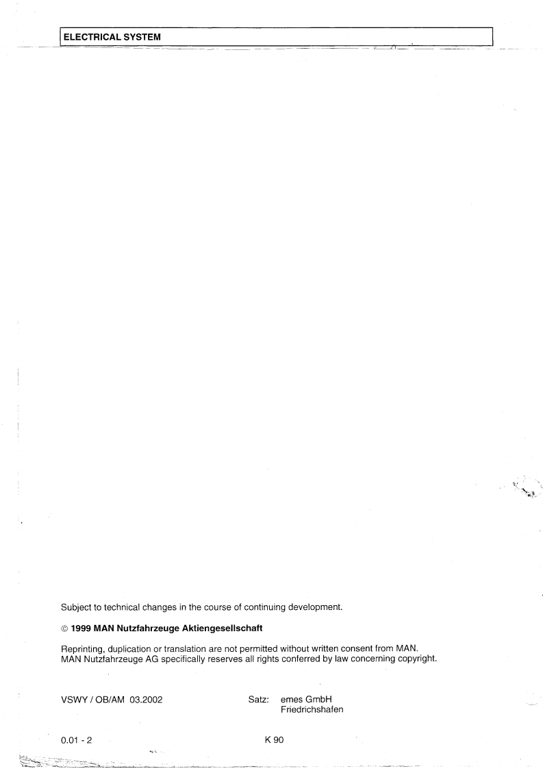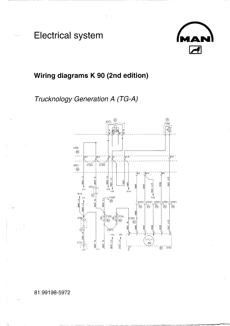 ×MAN团KElectrical systemTrucknology Generation A(TG-A)200211234|516171819|10111|12Publication no.:Wiring diagrams81.99198-59722nd Edition K 90MAN Nutzfahrzeuge AktiengesellschaftElektrische Anlage TG-ADachauer Str.667 oder Postfach 50 06 20Schaltplane K 90(2.Ausgabe)80995 MUNCHEN80976 MUNCHEN-.englisch-Printed in Germany
