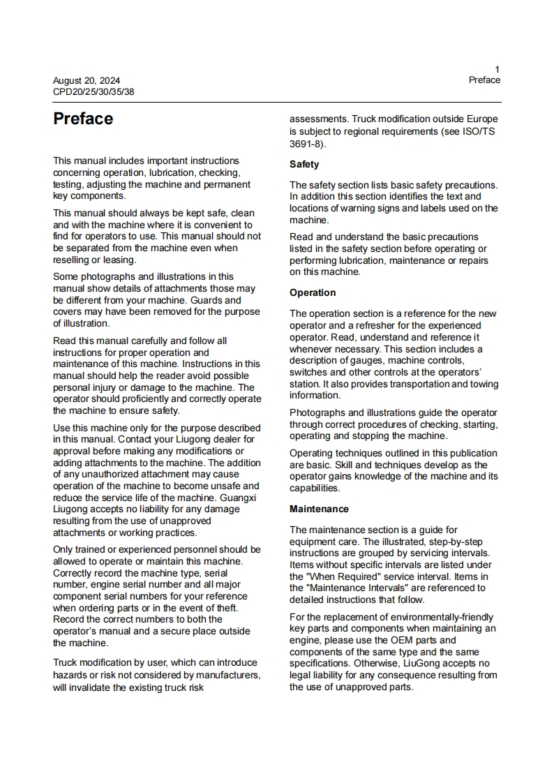 柳工叉车CPD2025303538-E-series驾驶与维修维护手册找手册网8小时前发布关注私信11.78MB236页028柳工叉车CPD2025303538-E-series驾驶与维修维护手册此内容为付费资源,请付费后查看¥29¥31黄金会员免费钻石会员免费立即购买您当前未登录!建议登陆后购买,可保存购买订单付费资源 第1页 / 共236页 第2页 / 共236页 第3页 / 共236页 第4页 / 共236页 第5页 / 共236页 第6页 / 共236页 第7页 / 共236页 第8页 / 共236页 第9页 / 共236页 第10页 / 共236页 试读已结束,还剩226页,您可下载完整版后进行离线阅读 THE END柳工/临工 文本预览 GLIUGONG印工202408003CPD20/25/30/35/38BATTERY FORKLIFT TRUCKE SERIES(英文)OPERATION ANDMAINTENANCE MANUAL 查看更多 收起部分 喜欢就支持一下吧收藏