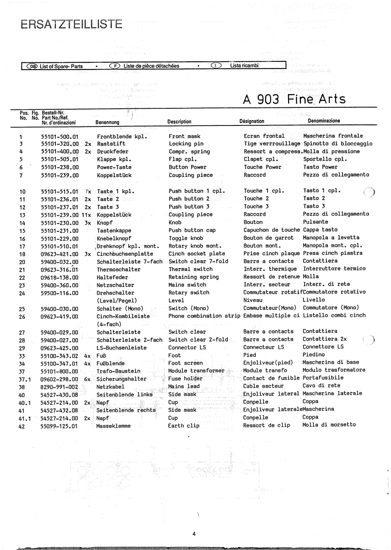 GRUNDIGSERVICE MANUALHIFI©Btx*32700#A90312/87FINE RTSTechnlsche DatenSpecificatlonsAusgangsleistung:2x 100 Watt Sinus/8QOutput power2x 100 W sine-wave /802x 150 Watt Musik /802x 150 W music/80Klirrfaktor:≤0,006%Distortion factors0,006%TIM:≤0,01%Tim:s0,01%Gerauschspannungsabstand nachS/N ratio acc,to IECIEC bei Nennleistung/50 mWat rated power/50mWCD:2102/79dBCD:210279dBHochpogel:≥1011/79dBHigh Level:2101/79dBPhono MM278/75dBPhono MM:27875dBLeistungsbandbreite≤5.50.000HzPower bandwidth:s5.50.000HzObertragungsbereich:Frequency response:Hochpegel3.55.000HzHigh Level3.55.000HzCD3.80.000HzCD3..80.000HzObersprechdampfung:Crosstalk attenuation:bei1kHz/CD≥75dBat 1 KHz/CD275dBEingangsempfindlichkeit:Input sensitivityTape,Tuner,Aux /TV/CD180mV/230k2Tape,Tuner,Aux/TV/CD180mV/230k2Phono MM1,9mV/47knPhono MM1.9mV/47kDampfungsfaktor2100Attenuation factor2100Notzspannung/Netzfrequenz:220V,50B0HzMains voltage/standard frequency220V,50/60Hz