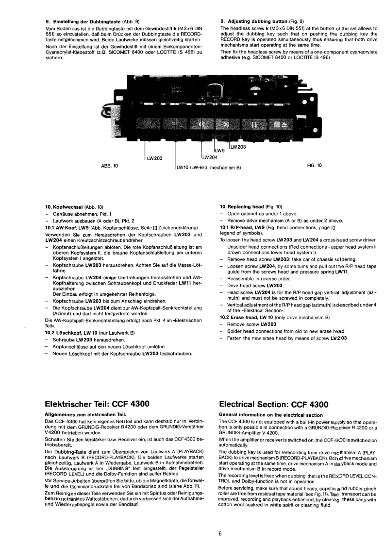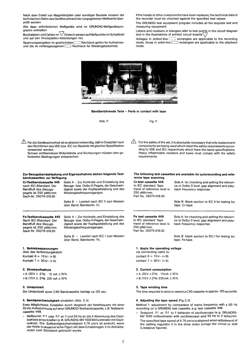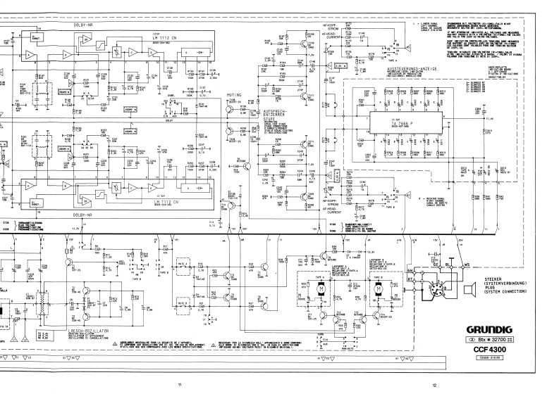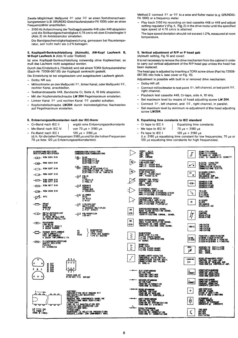 GRUNDIGSERVICE MANUAL⊙hx*32700开12/86CCF 4300g。⑩G®InhaltsverzeichnisContentsMechanischer TeilSeiteMechanical sectionPageAllgemeines zum mechanischen Teil2General information on the mechanical section1.Gehause abnehmen21.Opening cabinet2.Laufwerke ausbauen32.Disassembly of drive mechanisms33.Riemenwechsel33.Renewing belts34.Motor wechseln44.Replacing motor45.Schwungrad wechseln5.Replacing flywheel46.Andruckrolle wechsein56.Replacing pinch roller57.Aufwickelmoment bei Start57.Winding torque at start8.Gleichlauf58.Synchronism59.Einstellung der Dubbingtaste69.Adjusting dubbing button10.Kopfwechsel610.Replacing head6Elektrischer TellElectrical SectionAllgemeines zum elektrischen Teil6 und 7General information on the electrical section6 and 71.Betriebsspannungen1.Apply the operating voltage2.Stromaufnahme72.Current consumption73.Umspulzeit73.Tape winding time74.Bandgeschwindigkeit74.Adjusting the tape speed5.Kopfspalt-Senkrechtstellung85.Vertical adjustment of head86.Entzerrungszeitkonstanten86.Equalizing time constants8Zeichenerklarung8Legend8Schaltbild9..12Circuit diagram9.-12Druckplattenabbildungen13..15lllustration of printed plats13..157....14 Elektrische Messungen und Anforderungen16,18und207....14 Measurement and requirement7.19and20Ersatzteillisten21..24List of Spare-Parts21.24