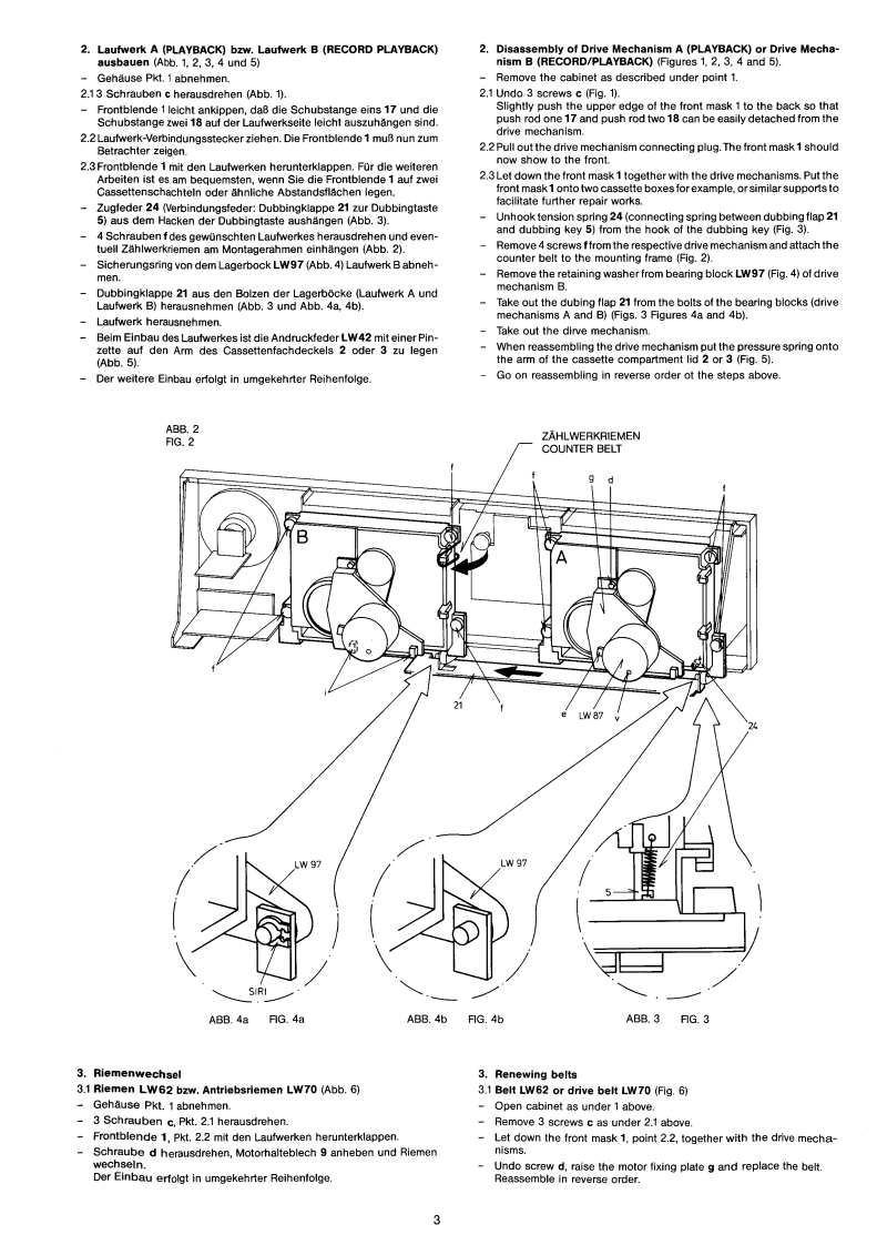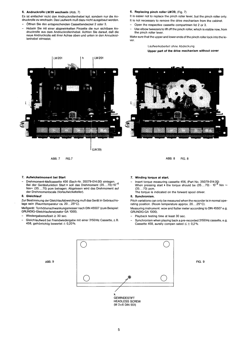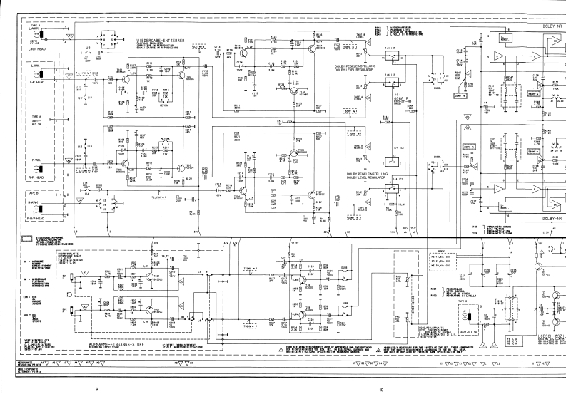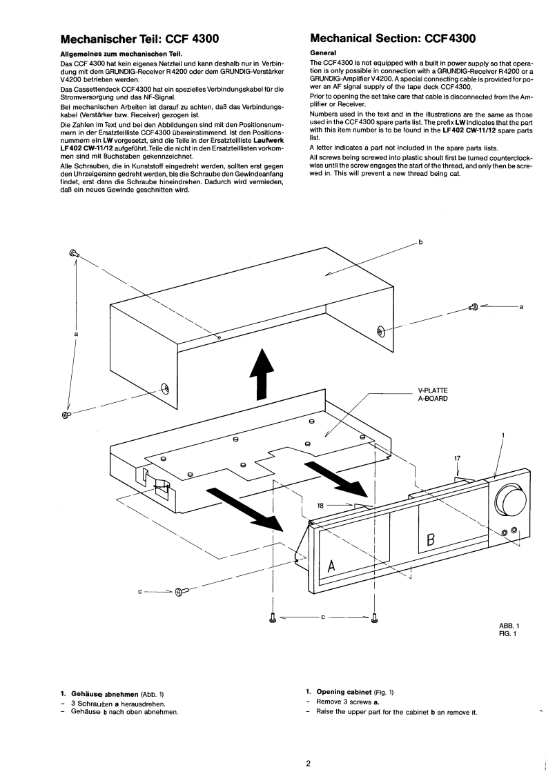 GRUNDIGSERVICE MANUAL⊙hx*32700开12/86CCF 4300g。⑩G®InhaltsverzeichnisContentsMechanischer TeilSeiteMechanical sectionPageAllgemeines zum mechanischen Teil2General information on the mechanical section1.Gehause abnehmen21.Opening cabinet2.Laufwerke ausbauen32.Disassembly of drive mechanisms33.Riemenwechsel33.Renewing belts34.Motor wechseln44.Replacing motor45.Schwungrad wechseln5.Replacing flywheel46.Andruckrolle wechsein56.Replacing pinch roller57.Aufwickelmoment bei Start57.Winding torque at start8.Gleichlauf58.Synchronism59.Einstellung der Dubbingtaste69.Adjusting dubbing button10.Kopfwechsel610.Replacing head6Elektrischer TellElectrical SectionAllgemeines zum elektrischen Teil6 und 7General information on the electrical section6 and 71.Betriebsspannungen1.Apply the operating voltage2.Stromaufnahme72.Current consumption73.Umspulzeit73.Tape winding time74.Bandgeschwindigkeit74.Adjusting the tape speed5.Kopfspalt-Senkrechtstellung85.Vertical adjustment of head86.Entzerrungszeitkonstanten86.Equalizing time constants8Zeichenerklarung8Legend8Schaltbild9..12Circuit diagram9.-12Druckplattenabbildungen13..15lllustration of printed plats13..157....14 Elektrische Messungen und Anforderungen16,18und207....14 Measurement and requirement7.19and20Ersatzteillisten21..24List of Spare-Parts21.24