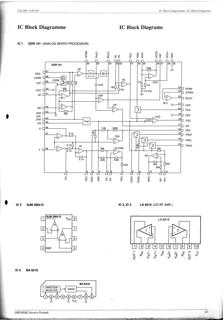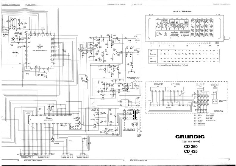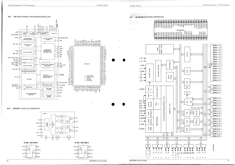 GRUnDIGSERVICE MANUALCDServiceManual⊙Btx*32700#CD360CD435CD360(9.79700-10511G.LC1615)CD435(9.79701-1051/G.LC1715COMPACTDIGITAL AUDIOCD360CD435GRUNDIGDGBInhaltsverzeichnisSeiteContentsPageSicherheitshinweise2..7Safety Instructions2..7LasersicherheitLaser Safety8Bedienelemente9..10Operating Controls9..10Fernbedienung RC 1 CD11Remote Control RC 1 CD11Ausbauhinweise12...13Disassembly Instructions12..13Einstellungen14Adjustments14Schaltbild15,,,17Circuit Diagram15...17Druckplattenabbildungen18...20Illustration of printed boards18...20IC Block Diagramme21..23IC Block Diagrams21..23Ersatzteilliste24..26List of spare parts24...26Explosionszeichnungen27..31Exploded Views27.31Technische Daten32Technical Data832Anderungen vorbehaltenPrinted in GermanyService Manual Sach-Nr.72010-733.00Subject to alterationVK2241192Service Manual Part No.72010-733.00