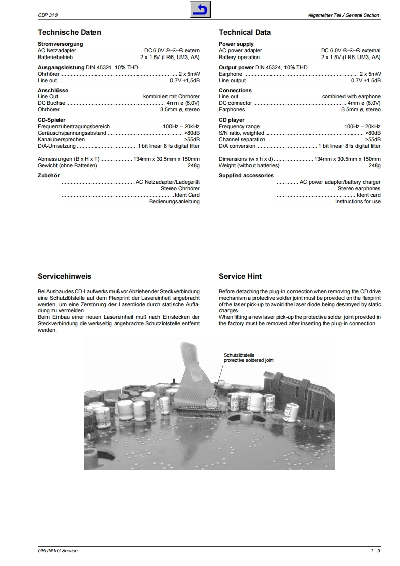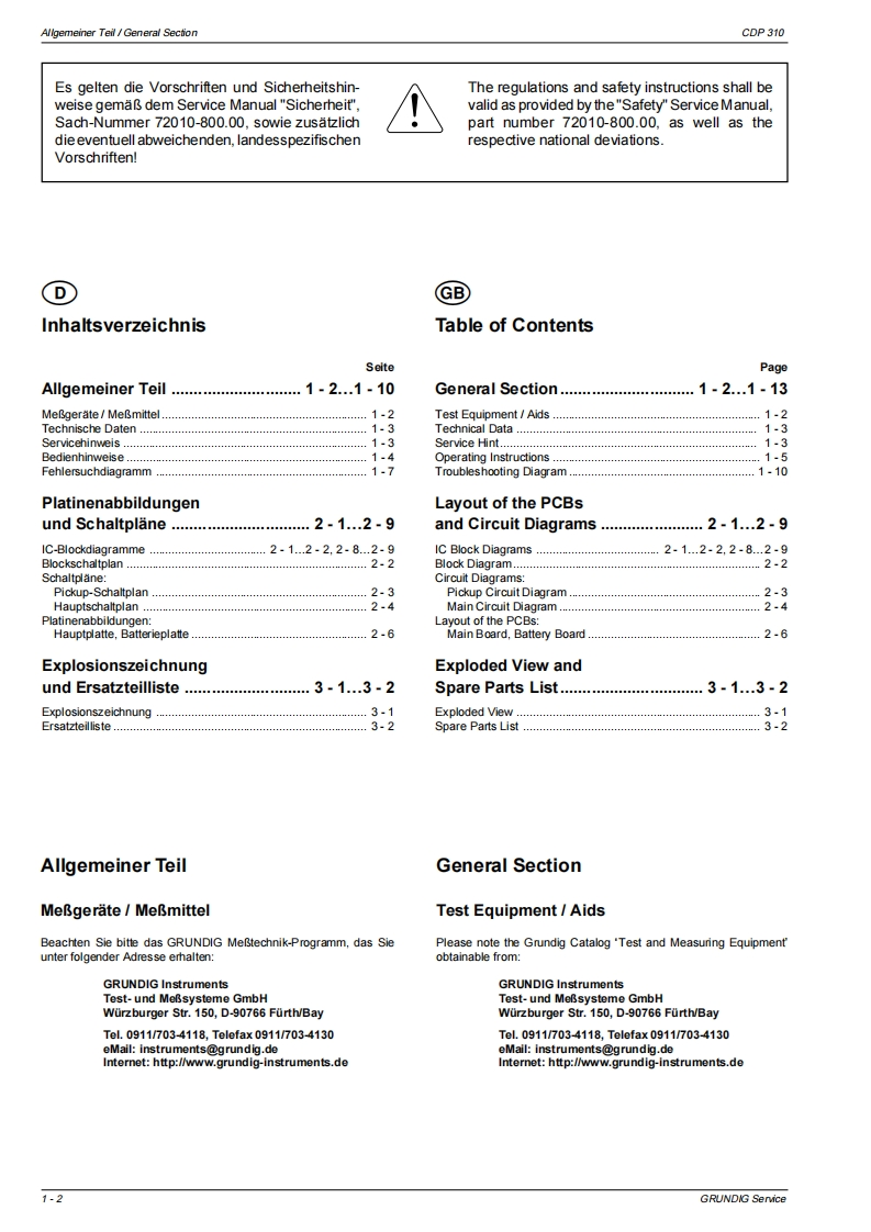 GRUnDGService ManualAudioGrundig ServiceCDP 310Technik:TV/SAT0180/5231841VCR/LIveCam0180/52318-42HIFl/Audlo0180/52318.43Car Audlo0180/52318.44Telekommunikation0180/52318-45Fax:0180/52318-51Ersatz leil-Beslellannahme:Telefon:0180/52318-40Fax:0180/52318.50GRUnDIG06Zusatzlich er forderlicheUnterlagen fur den KompletserviceAdditionally reauiredService Manuals for the Complele ServiceBt*32700#ServiceServiceManualManualSachnummerPart Number 72010 757 8500CDP 310SicherheitAnderungen vorbehaltenSafetySubject to alterationSach-Nr/Pat NoSad-Nr/Part NoPrinted in Germany72010757850072010-800.00VK2320498