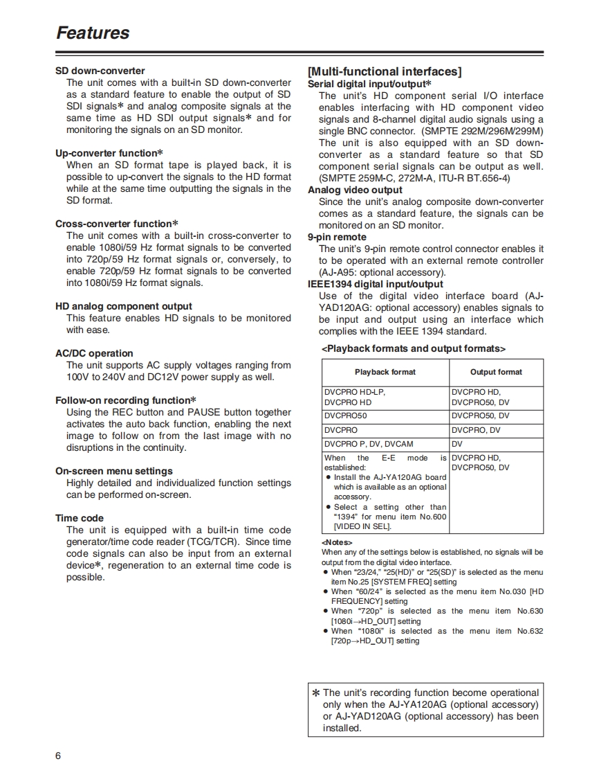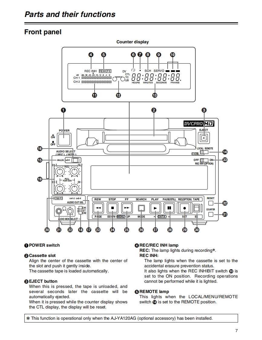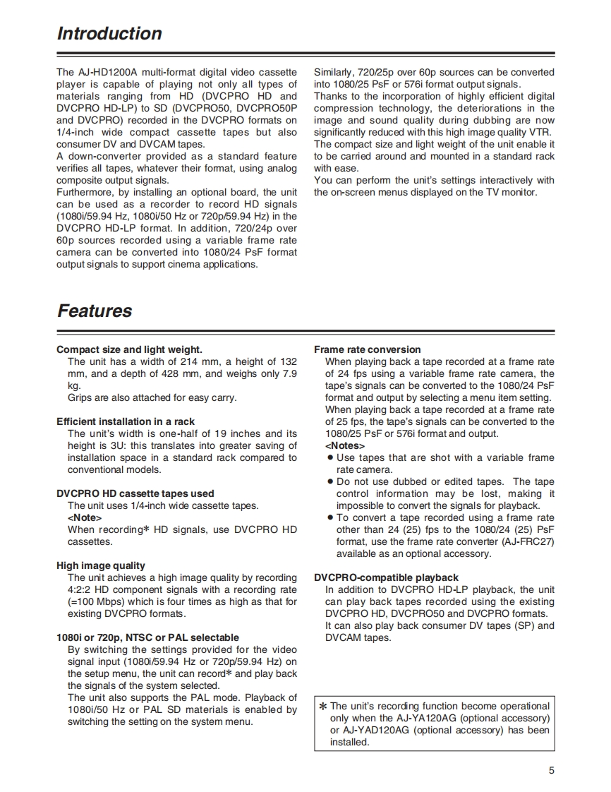 PanasonicDigital HD Video Cassette Player/RecorderOperating InstructionsModel No.AJ-HD1200APDVCPROH▣EXThe unit's recording function become operational only whenthe AJ-YA120AG (optional accessory)or AJ-YAD120AG(optional accessory)has been installed.物6nno66时0■■■Before operating this product,please read the instructions carefully and save this manual for future use.VQTOL36-1