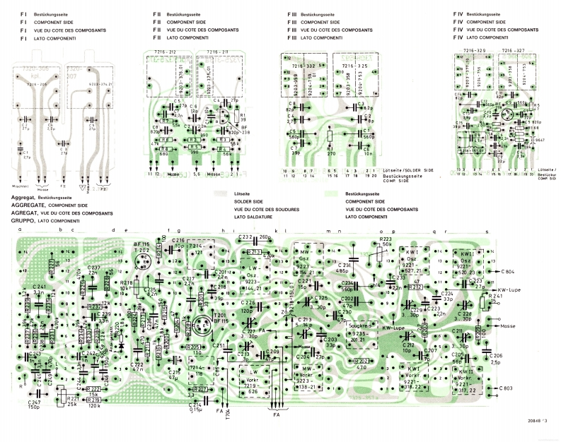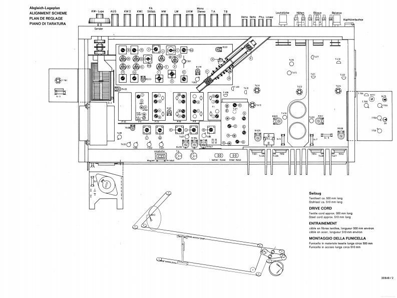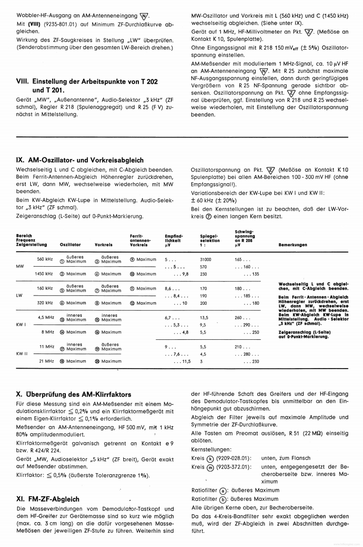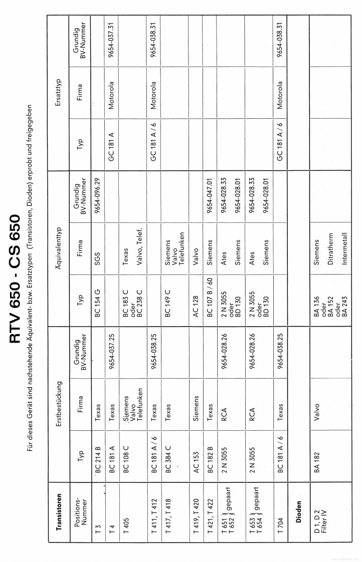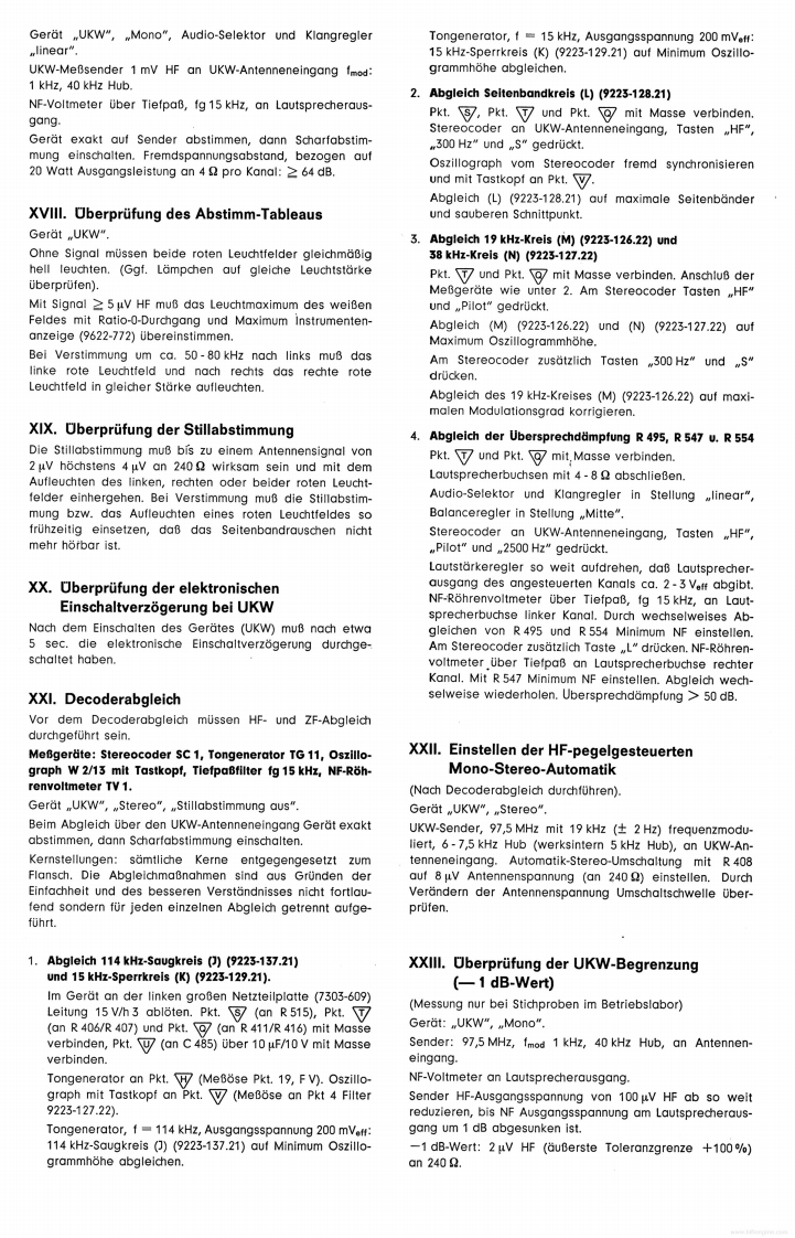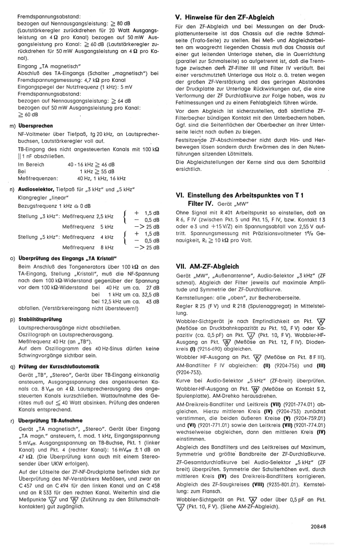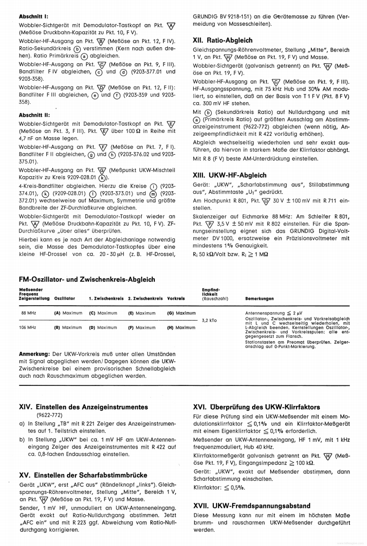 GrundchassisGRUnDIGReparaturhelferCS650RTV 650Studio 6501969Abgleich-und Prufvorschrift fur das GeratCS650(Z.Nr.19-8054-4001)RTV 650(Z.Nr.18-1570-1101)Studio650(Z.Nr.12-2419-1103)Reihenfolge des Abgleichs und der Prufung.Einsatz und Paarung der TransistorenV.Hinweise fuUr den ZF-AbgleichIL.Inbetriebnahme des GerdtesEinstellung des Arbeitspunktes von T 1 F IVArbeitspunkteinstellung des NF-VerstarkersVIL.AM-ZF-AbgleichIV.Prufung des NF-VerstarkersVIL.Einstellung der Arbeitspunkte von T 202,T 201a)Ausgangsleistung1X.AM-HF-Abgleichb)LeistungsbandbreiteX.UberprUfung des AM-Klirrfaktorsc)EingangsempfindlichkeitXI.FM-ZF-Abgleichd)Maximale Eingangsspannunge)Frequenzgang .linear"XIL.Ratio-Abgleichf)Eingangswiderstand,,TB"XIL.UKW-HF-Abgleichg)Entzerrung,TA magnetisch"XIV.Einstellen des Anzeigeinstrumentesh)Regelbereich KlangreglerXV.Einstellen der Scharfabstimmbruckei)Physiologie (Contour)XVI.Uberprufung des UKW-Klirrfaktorsk)KanalabweichungenXVIL.I)FremdspannungsabstandUKW-Fremdspannungsabstandm)UbersprechenXVIll.UberprUfung des Abstimm-Tableausn)Audio-SelektorXIX.Uberprufung der Stillabstimmungo)Eingang .,TA Kristall"XX.Uberprufung der Einschaltverz&gerungp)StabilitatsprufungXXI.Decoderabgleichq)PrUfung der KurzschluBautomatikXXIl.Einstellen der Mono-Stereo-Automatikr)UberprUfung TB-AufnahmeXXIII.UberprUfung der UKW-Begrenzung(-1 db-Wert)I.Einsatz und Paarung der TransistorenPaarungsbedingungen:Soweit fur die in diesem Gerat verwendeten TransistorenUnterschied der Stromverstarkung der Transistoren einesund Dioden BV-Blatter angelegt wurden (siehe auch Schalt-Komplementarpaares nicht groBer als 30%/.Mesbedingun-bild),ist zu gewahrleisten,daB nur solche Transistoren undgen nach BV 9654-030.31 konnen vom ZKD bezogen werden.Dioden eingesetzt werden,die den darin aufgefuhrtenTreiberpaar und Endtransistorenpaar eines Kanals mussenSpezifikationen entsprechen.nach folgendem Schema einander zugeordnet werden:Die Endtransistoren 2 N 3055 werden nach BV 9654-028.26bereits gepaart angeliefert.Die Treiber SJE 210 und SJE 211 mussen im Werk gepaart1.Beispiel:Treiber silberwerdenHierzu passen die Endtransistoren mit den Farbkennzeichen:rot,orange,gelb.2.Beispiel:Treiber grun(Schrlftiarbe)(Farbpunkt)Hierzu passen die Endtransistoren mit den Farbkennzeichen:der Trelberder Endtransistorengold,schwarz,braun,rot.grUnBgeadaanrotEs ist darauf zu achten,daB alle Kondensatoren bzw.Elkossllber oder welsdie vorgeschriebenen Betriebsspannungen und speziellenEigenschaften besitzen (FKC,MKT,Elkos mit verbessertemSonwortBgeadhaonScheinwiderstand,ferner schwer entflammbare Wider-orange,gelbstande usw.).GRUNDIG-Werke GmbH..8510 Furth/Bayern.Kurgartenstr.37