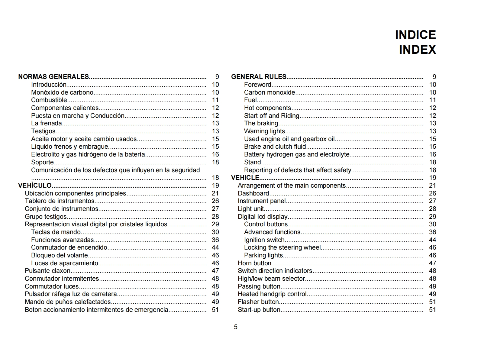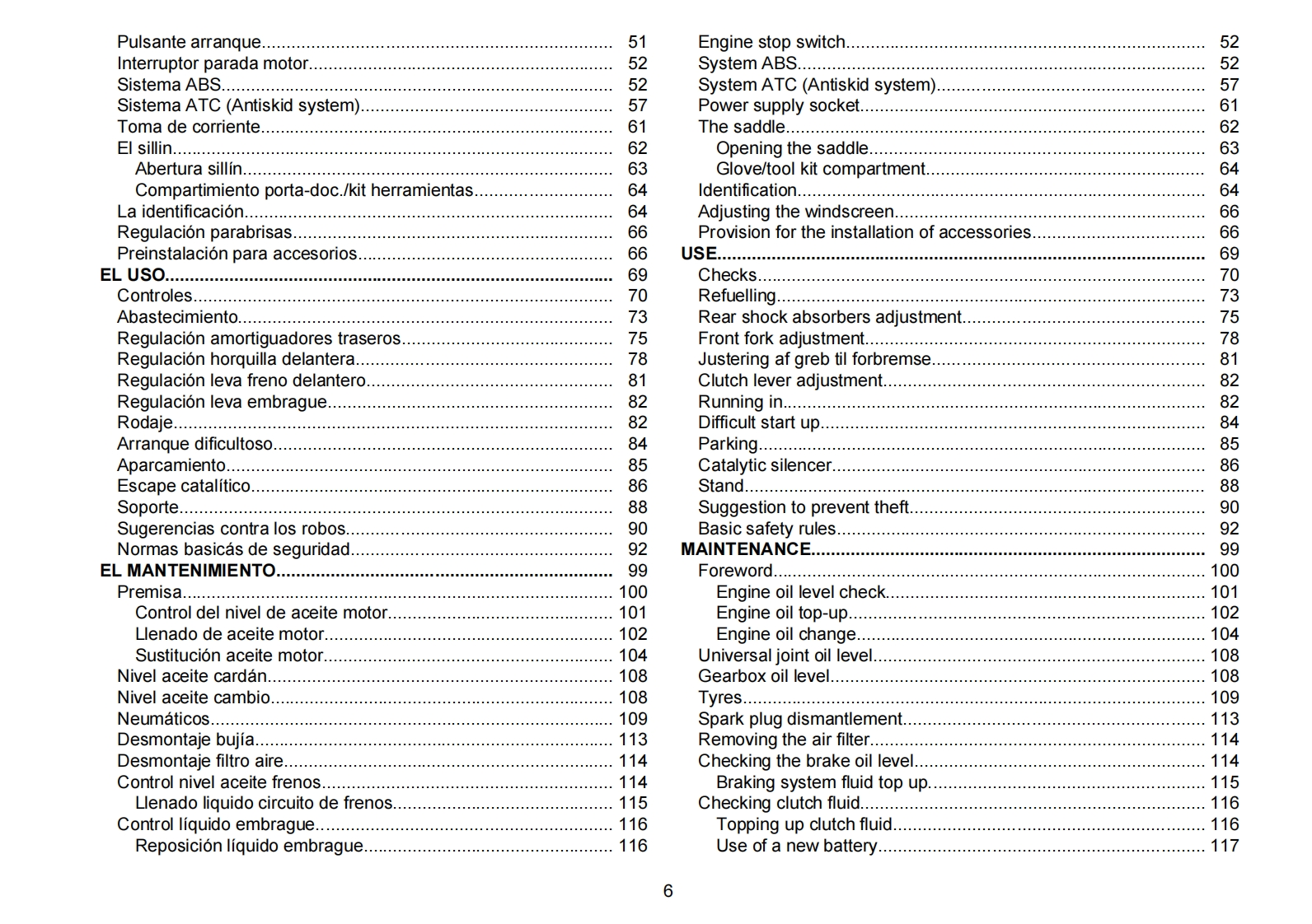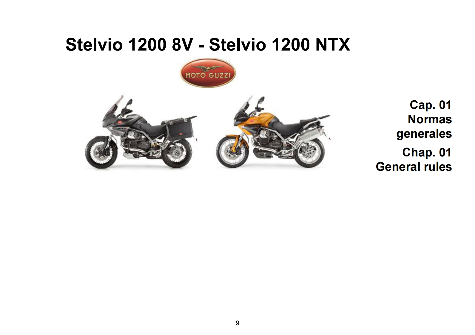 MOTO GUZZI DESEA AGRADECERLEpor haber elegido uno de sus productos.Hemos preparado este manual para permitirle apreciar todas sus cualidades.Le aconsejamos que lea todosu contenido antes de conducir por primera vez.Contiene informacion,consejos y advertencias para el uso de su vehiculo;asimismo,descubriracaracteristicas,piezas y soluciones que le convenceran de lo acertado de su eleccion.Estamos seguros de que teniendo todo esto en cuenta,leresultara facil conocer su nuevo vehiculo,el cual podra disfrutar por mucho tiempo con total satisfaccion.La presente publicacion es parte integrantedel vehiculo y en caso de venderlo debe entregarse al nuevo propietario.MOTO GUZZI WOULD LIKE TO THANK YOUfor choosing one of its products.We have compiled this booklet to provide a comprehensive overview of your vehicle's quality features.Please read itcarefully before riding the vehicle for the first time.It contains information,tips and precautions for using your vehicle.It also describes features,detailsand devices to assure you that you have made the right choice.We believe that if you follow our suggestions,you will soon get to know your new vehiclewell and that it will continue to give you satisfactory service for many years to come.This booklet forms an integral part of the vehicle;should the vehiclebe sold,it must be transferred to the new ownerStelvio 1200 8V-Stelvio 1200 NTXMOTO GUZZIEd.0309/2012