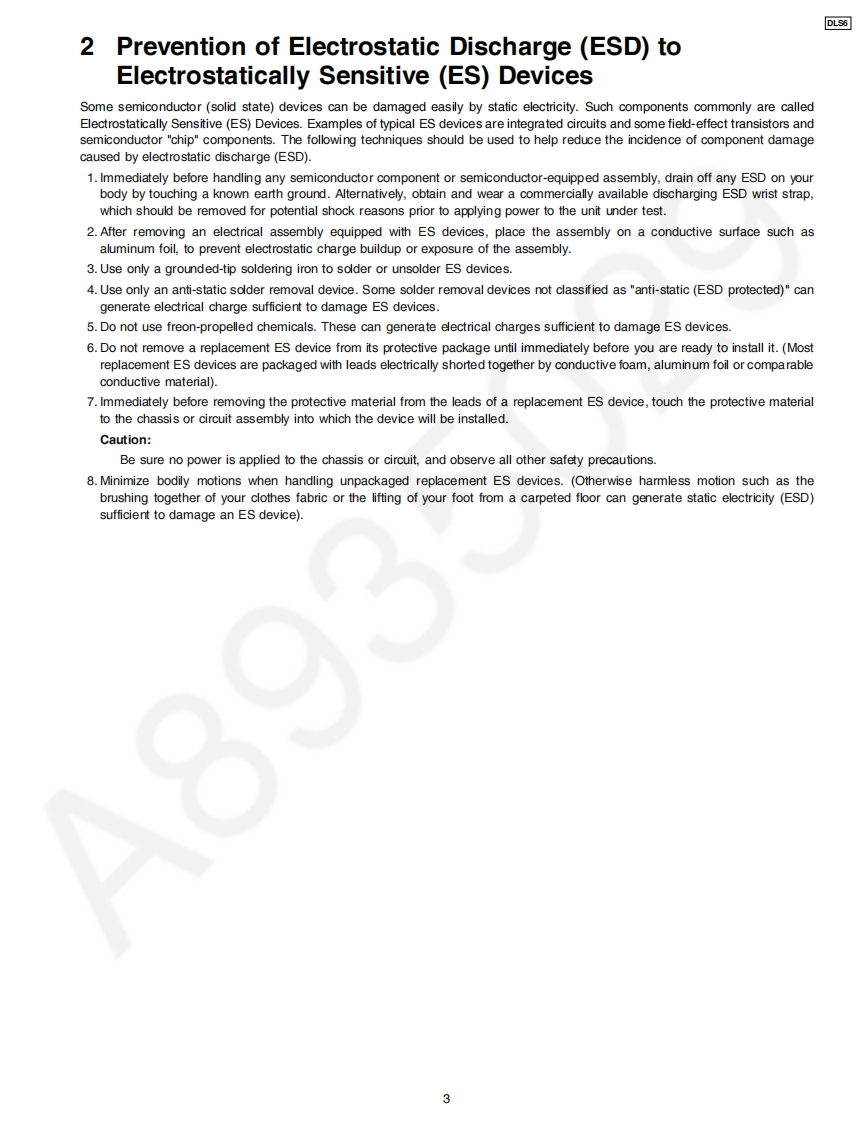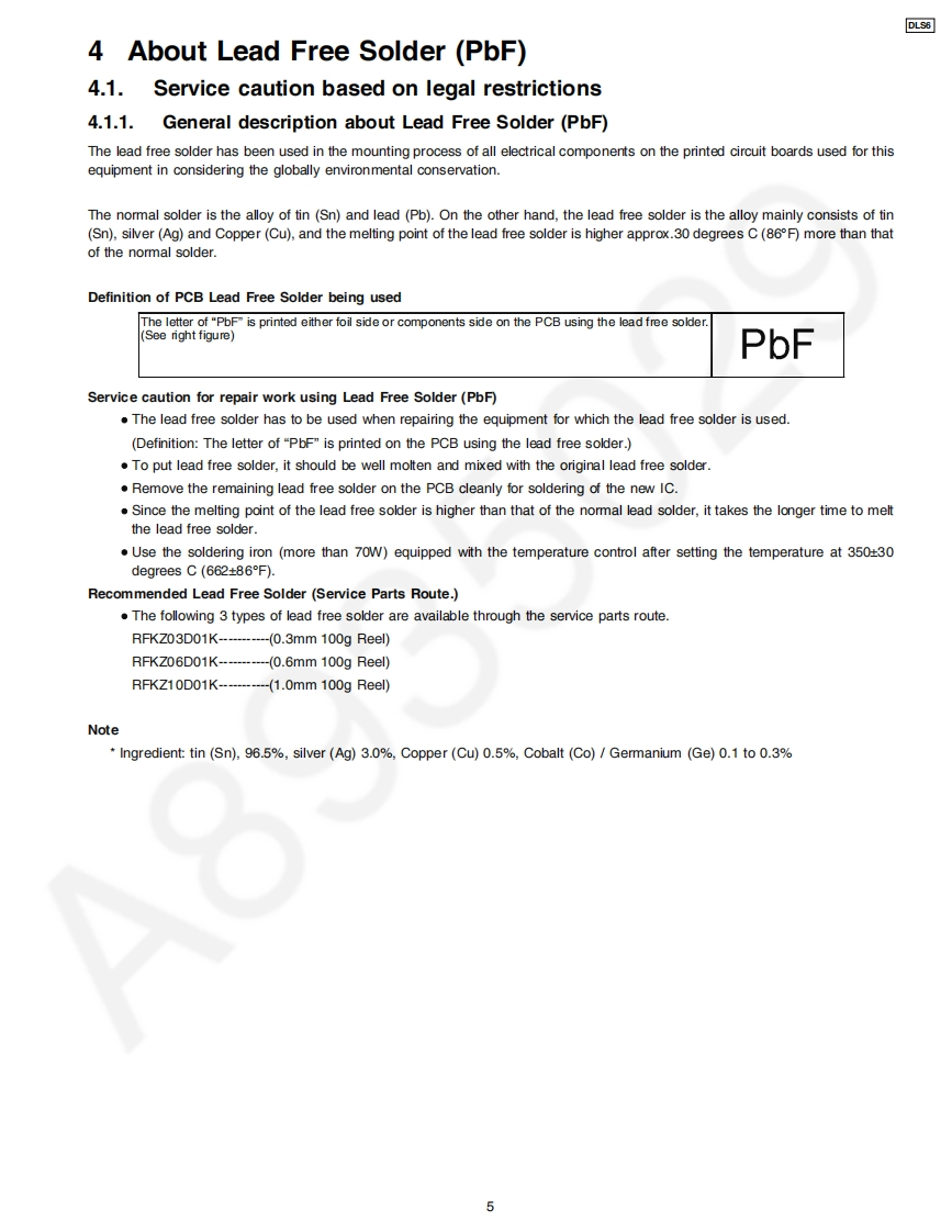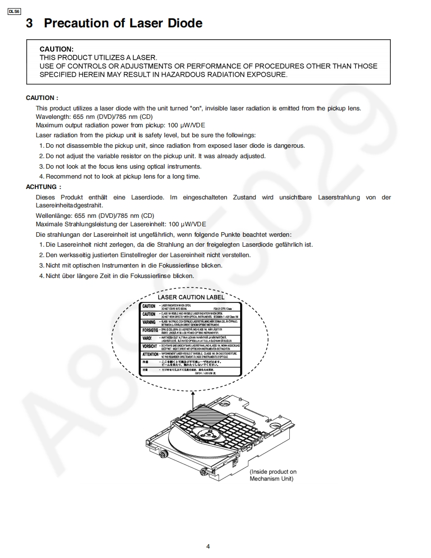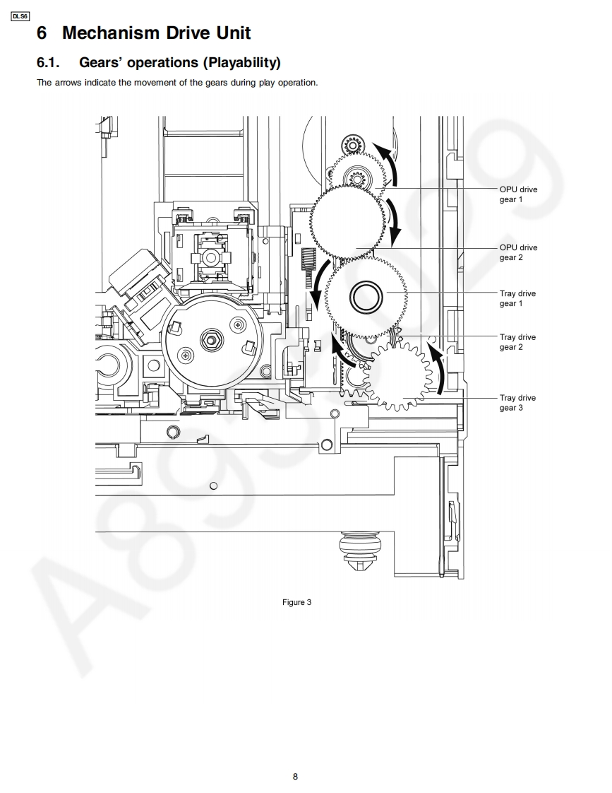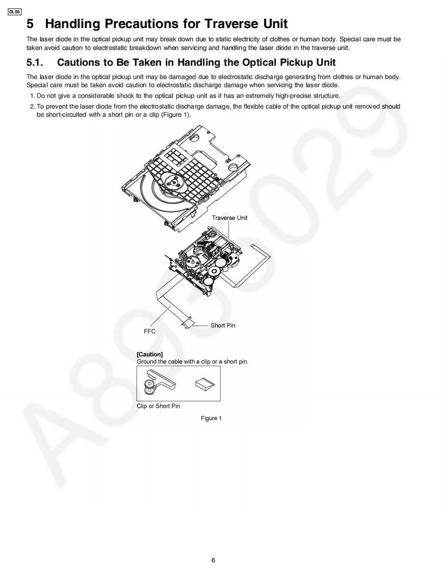 ORDER NO.MD0801003CEA6Service ManualMechanism UnitDLS6AWARNINGThis service information is designed for experienced repair technicians only and is not designed for use by the general public.It does not contain warnings or cautions to advise non-technical individuals of potential dangers in attempting to service a product.Products powered by electricity should be serviced or repaired only by experienced professional technicians.Any attempt to serviceor repair the product or products dealt with in this service information by anyone else could result in serious injury or death.CONTENTSPagePage1 Mechanism Overview (DLS6).…27 Mechanism Operation Description…112 Prevention of Electrostatic Discharge (ESD)to8 Assembling Disassembling…17Electrostatically Sensitive (ES)Devices.39 Disassembly Flow…323 Precaution of Laser Diode410 DLS6 Mechanism Reliability-…334 About Lead Free Solder (PbF)11 Exploded Views…395 Handling Precautions for Traverse Unit-12 Replacement Parts List.416 Mechanism Drive UnitPanasonic2008 Matsushita Electric Industrial Co.Ltd..Allrights reserved.Unauthorizedcopying anddistribution is a violation of law.