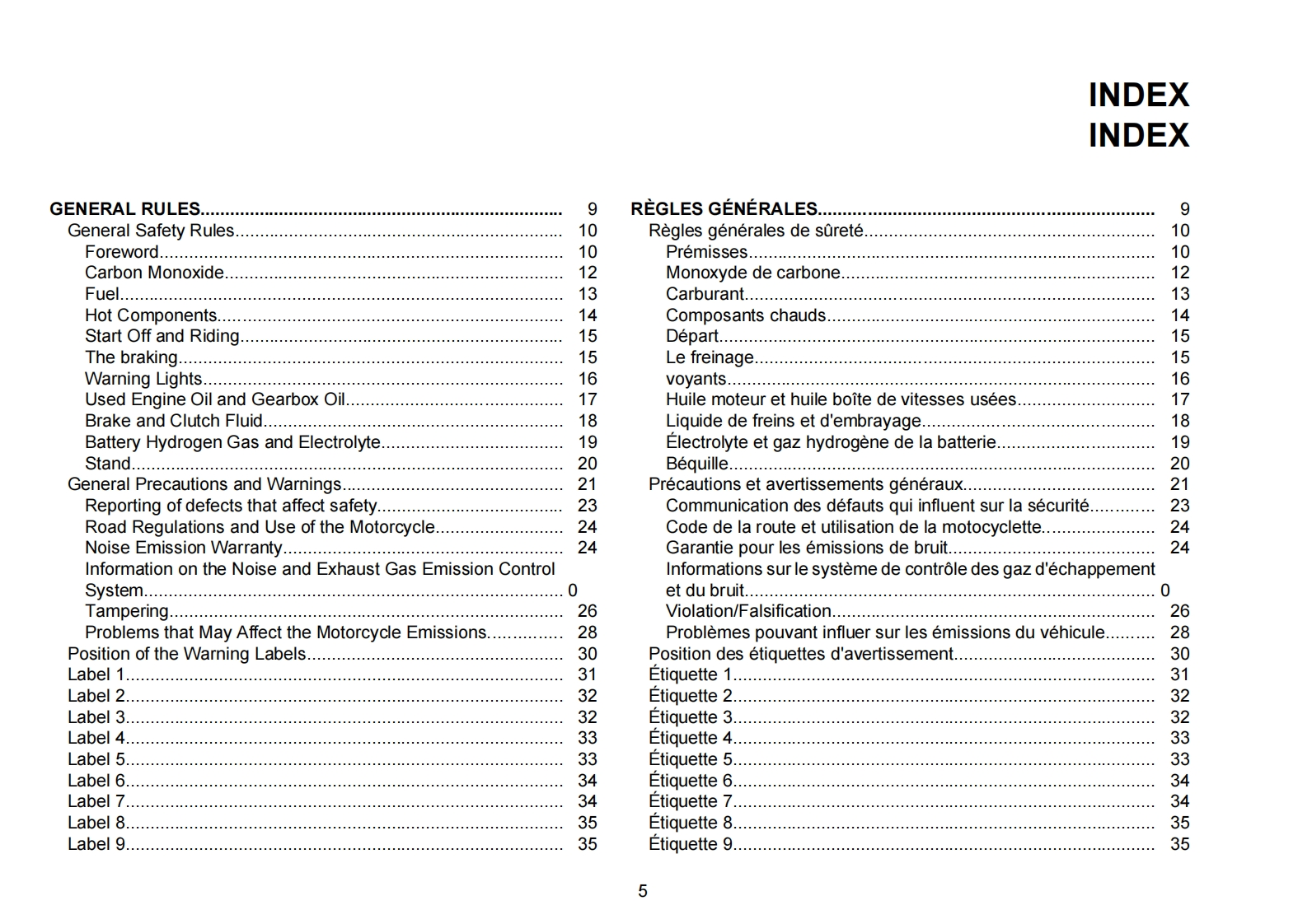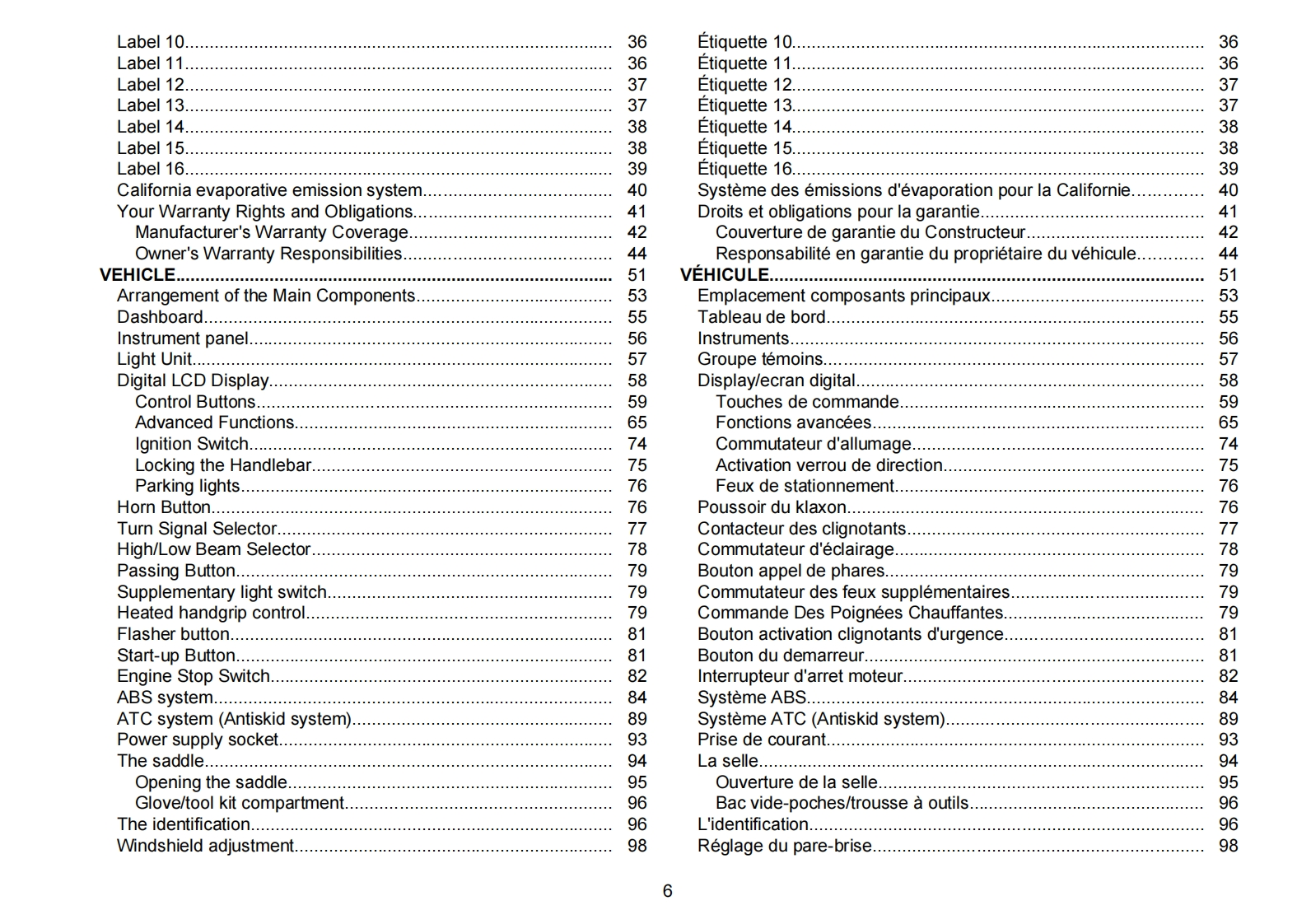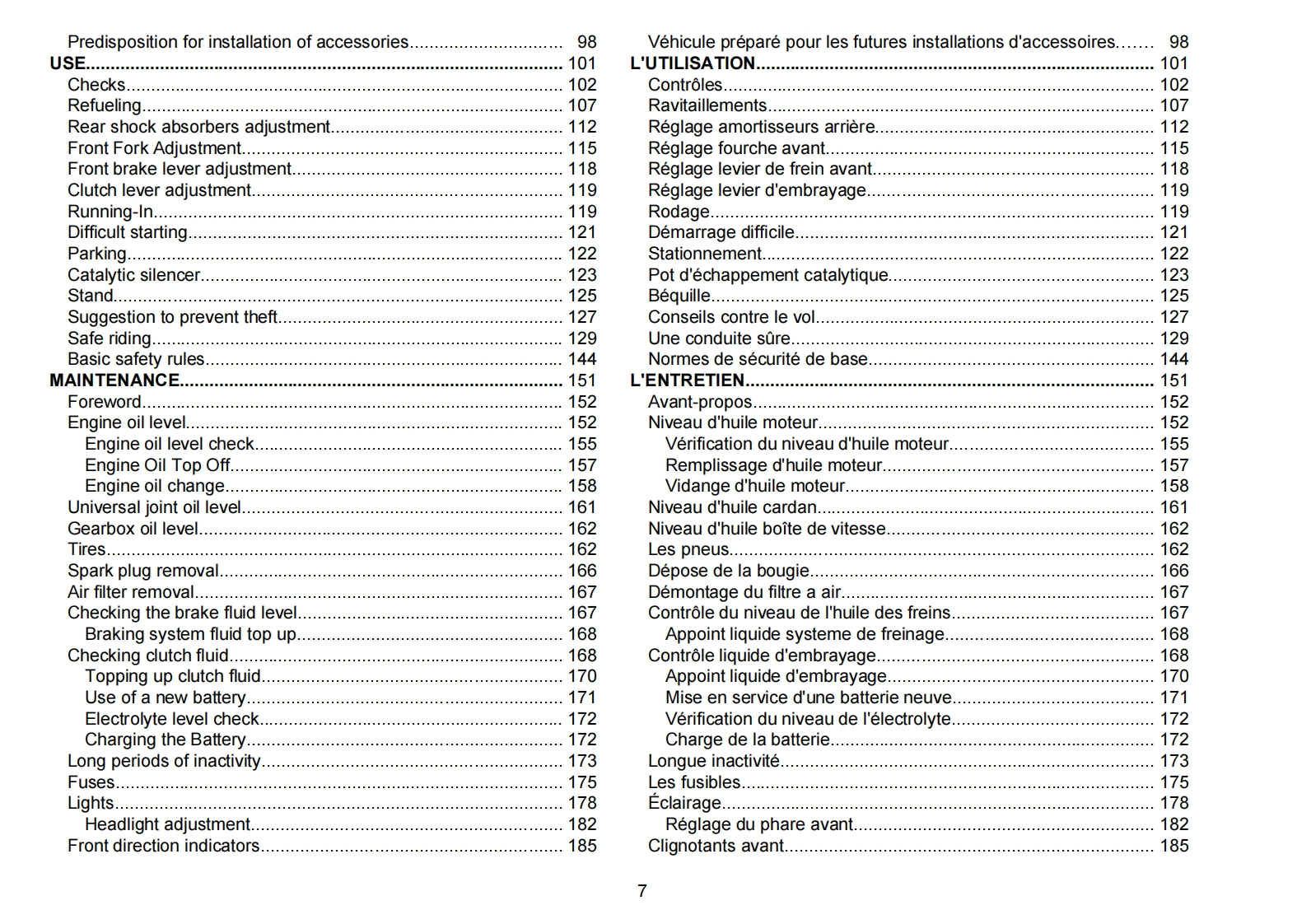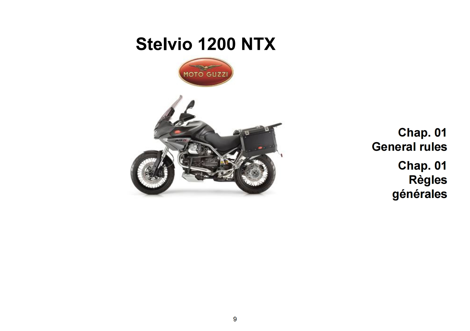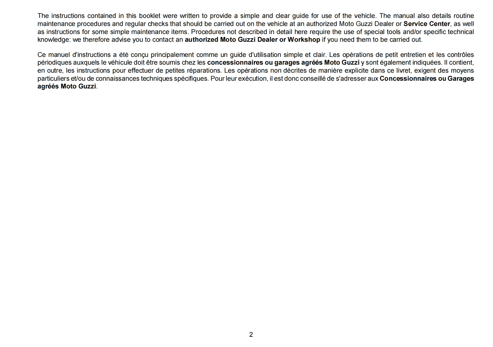 MOTO GUZZI WOULD LIKE TO THANK YOUfor choosing one of its products.We have drawn up this manual to show you all the features of your motorcycle.Please read it carefully before ridingthe motorcycle for the first time.It contains information,tips and precautions for using your vehicle.You will also discover features,details and deviceswhich will reassure you that you have made the right choice.We believe that if you follow our suggestions,you will soon get to know your new motorbikeinside and out and it will serve you well for a long time to come.This booklet is an integral part of the vehicle;should the vehicle be sold,it must betransferred to the new owner.MOTO GUZZI SOUHAITE VOUS REMERCIERd'avoir choisi un de ses produits.Ce manuel a ete concu et prepare par nos soins afin que vous puissiez en apprecier pleinement la qualite.Nous vousrecommandons de bien lire chaque partie avant de vous mettre a la conduite du vehicule.Ce manuel contient des informations,des conseils et desavertissements lies a l'utilisation de votre vehicule.Vous decouvrirez ainsi des caracteristiques,des details et des solutions qui vous persuaderont devotre excellent choix.Convaincus du fait que vous en tiendrez compte,I'utilisation de votre nouveau vehicule en sera d'autant plus harmonieuse etsatisfaisante.Ce manuel fait partie integrante du vehicule et en cas de vente de celui-ci,il doit etre remis au nouveau proprietaire.Stelvio 1200 NTXMOTO GUZZIEd.0409/2012