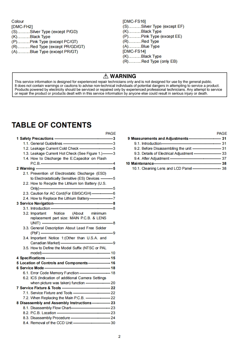 ORDER NO.DSC1102026CEB26Service ManuaDigital CameraLUMIXModel No.DMC-FH2PDMC-FH2PCDMC-FH2PRDMC-FH2PUDMC-FH2GADMC-FH2GCDMC-FH2GDDMC-FH2GFDMC-FH2GHDMC-FH2GKDMC-FH2GNDMC-FH2GTDMC-FS16EBDMC-FS16EEDMC-FS16EFDMC-FS16EGDMC-FS16EPDMC-FS14EBDMC-FS14EEDMC-FS14EGDMC-FS14EPVol.1Panasonic Corporation 2011 Unauthorized copy-Panasonicing and distribution is a violation of law.