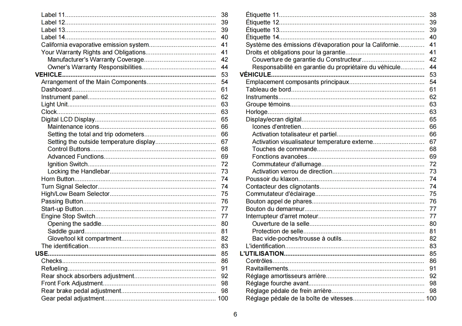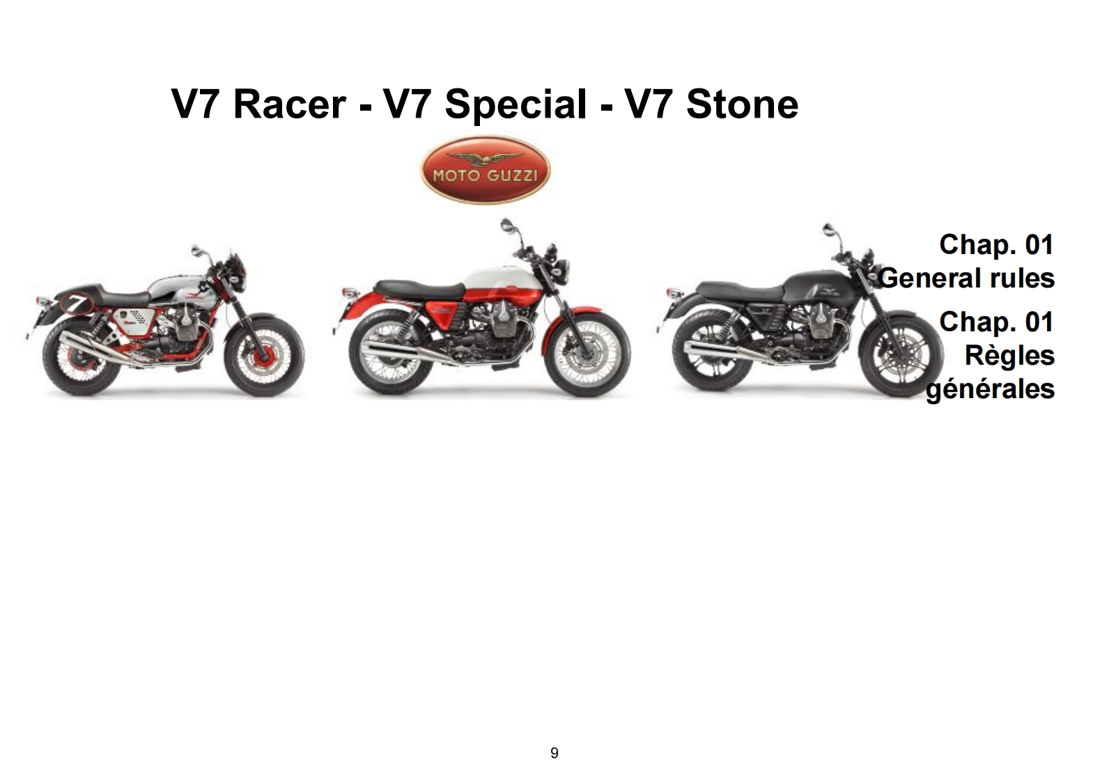 MOTO GUZZI WOULD LIKE TO THANK YOUfor choosing one of its products.We have drawn up this manual to provide a comprehensive overview of your vehicle's quality features.Please read itcarefully before riding the motorcycle for the first time.It contains information,tips and precautions for using your vehicle.It also describes features,details and devices to assure you that you have made the right choice.We believe that if you follow our suggestions,you will soon get to know yournew vehicle well and will use it for a long time at full satisfaction.This booklet is an integral part of the vehicle,and should the vehicle be sold,it mustbe transferred to the new owner.MOTO GUZZI SOUHAITE VOUS REMERCIERd'avoir choisi un de ses produits.Ce manuel a ete concu et prepare avec soin afin de vous fournir le plus d'informations necessaires dans le butd'apprecier pleinement les qualites de votre Moto Guzzi.Nous vous recommandons de bien lire chaque partie avant de vous mettre a la conduite duvehicule.Ce manuel contient des informations,des conseils et des avertissements lies a l'utilisation de votre vehicule ainsi,vous decouvrirez descaracteristiques,des details et des solutions qui vous persuaderont de votre excellent choix.Convaincus du fait que vous en tiendrez compte,I'utilisationde votre nouveau vehicule en sera d'autant plus harmonieuse et satisfaisante.Cette publication fait partie integrante du vehicule et en cas de transfertde propriete de celui-ci,elle doit etre remise au nouveau proprietaireV7 Racer -V7 Special -V7 StoneMOTO GUZZIEd.0106/2012