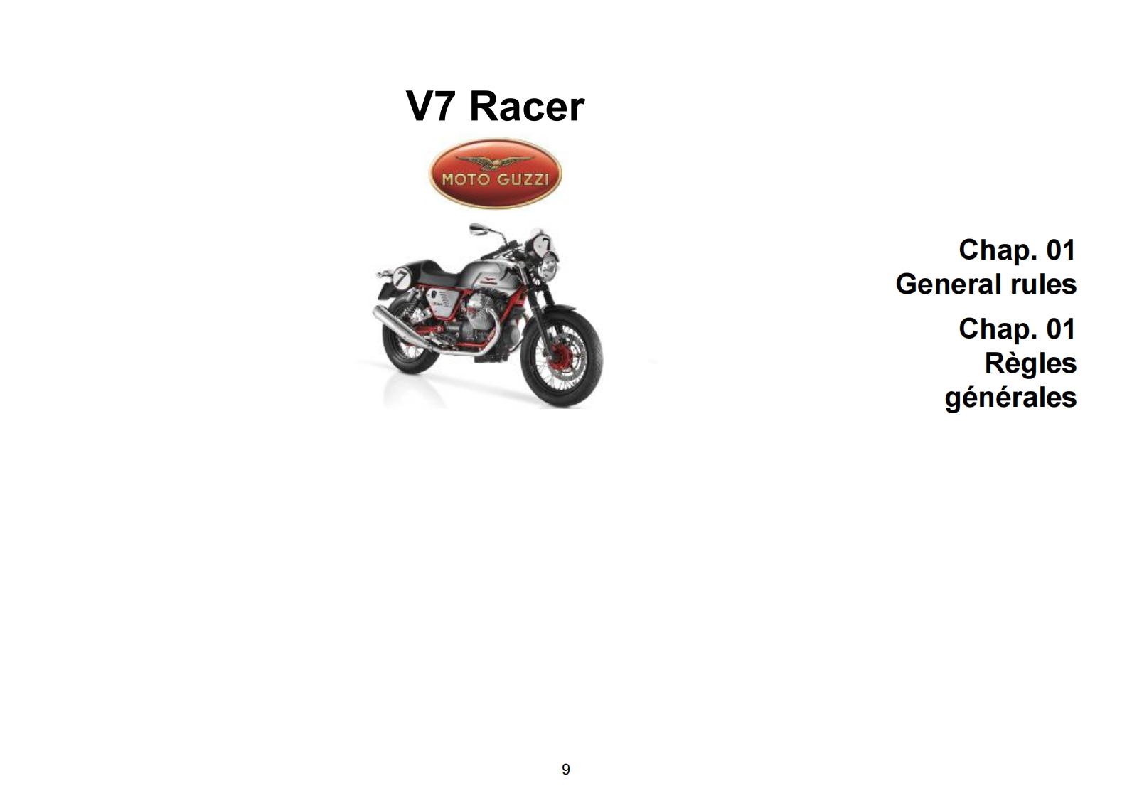 MOTO GUZZI WOULD LIKE TO THANK YOUfor choosing one of its products.We have drawn up this manual to provide a comprehensive overview of your vehicle's quality features.Please read itcarefully before riding the motorcycle for the first time.It contains information,tips and precautions for using your vehicle.It also describes features,details and devices to assure you that you have made the right choice.We believe that if you follow our suggestions,you will soon get to know yournew vehicle well and will use it for a long time at full satisfaction.This booklet is an integral part of the vehicle,and should the vehicle be sold,it mustbe transferred to the new owner.MOTO GUZZI SOUHAITE VOUS REMERCIERd'avoir choisi un de ses produits.Ce manuel a ete concu et prepare par nos soins afin que vous puissiez en apprecier pleinement la qualite.Nous vousrecommandons de bien lire chaque partie avant de vous mettre a la conduite du vehicule.Ce manuel contient des informations,des conseils et desavertissements lies a l'utilisation de votre vehicule ainsi,vous decouvrirez des caracteristiques,des details et des solutions qui vous persuaderont devotre excellent choix.Convaincus du fait que vous en tiendrez compte,I'utilisation de votre nouveau vehicule en sera d'autant plus harmonieuse etsatisfaisante.Cette publication fait partie integrante du vehicule et en cas de transfert de propriete de celui-ci,elle doit etre remise au nouveauproprietaire.V7 RacerMOTO GUZZIEd.112011