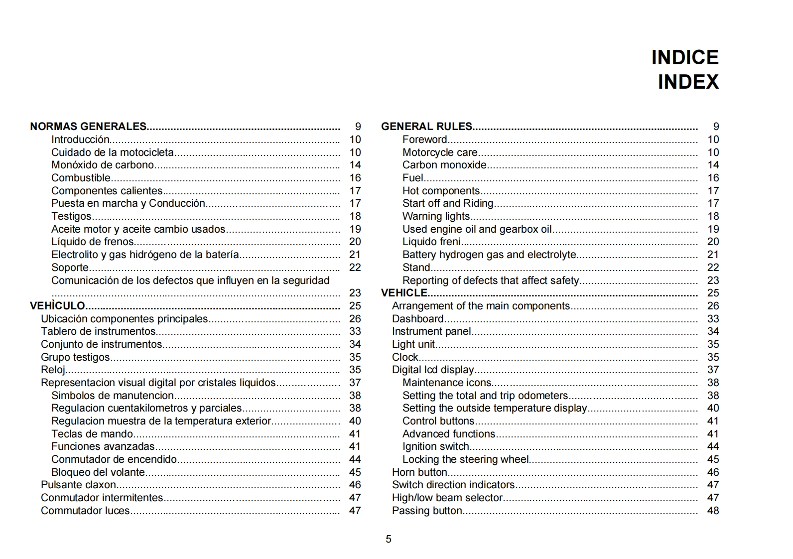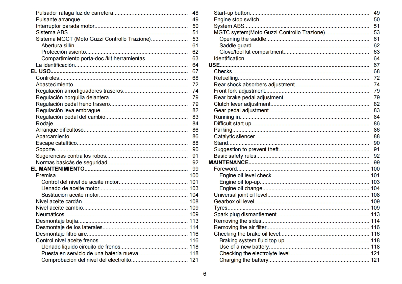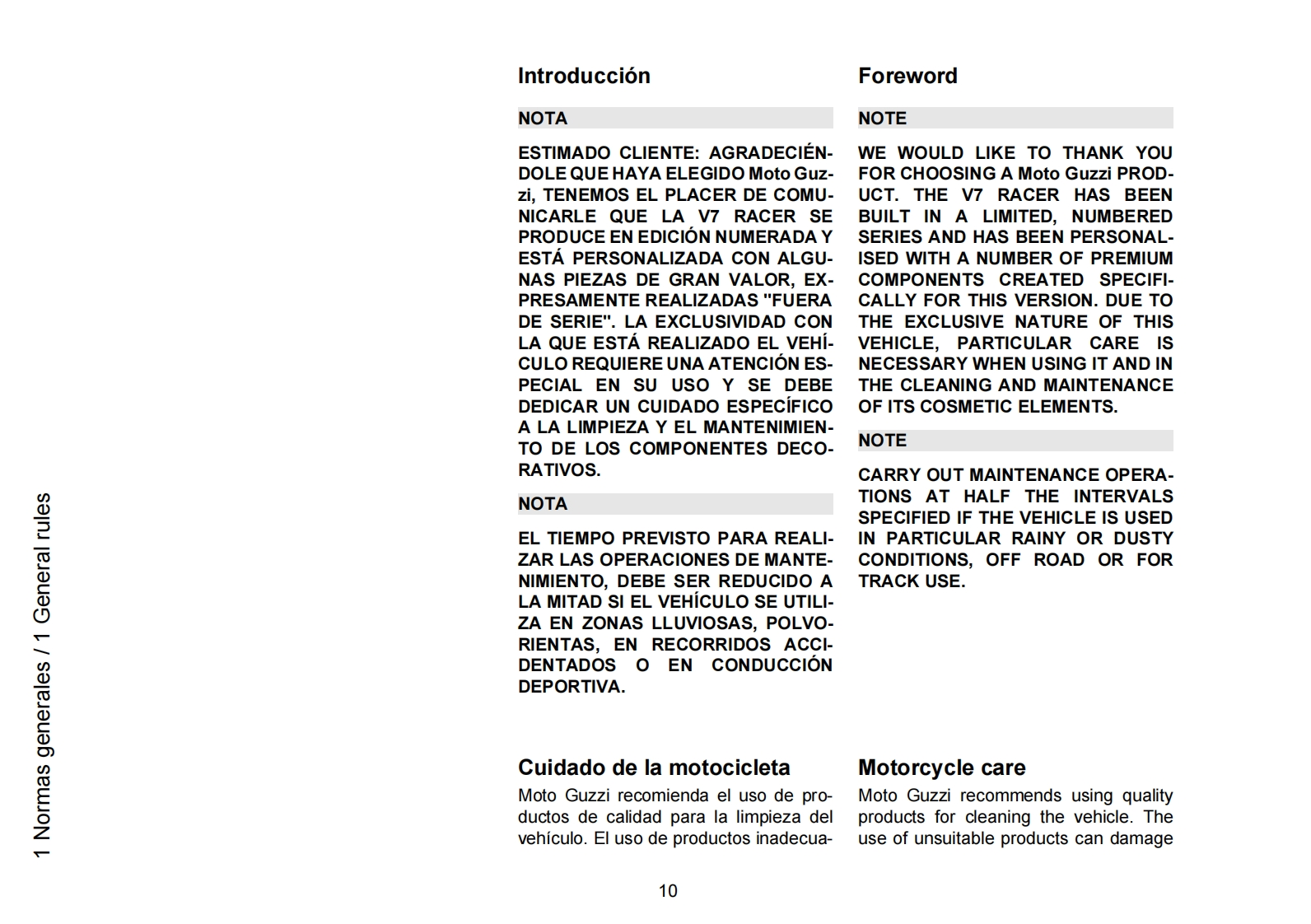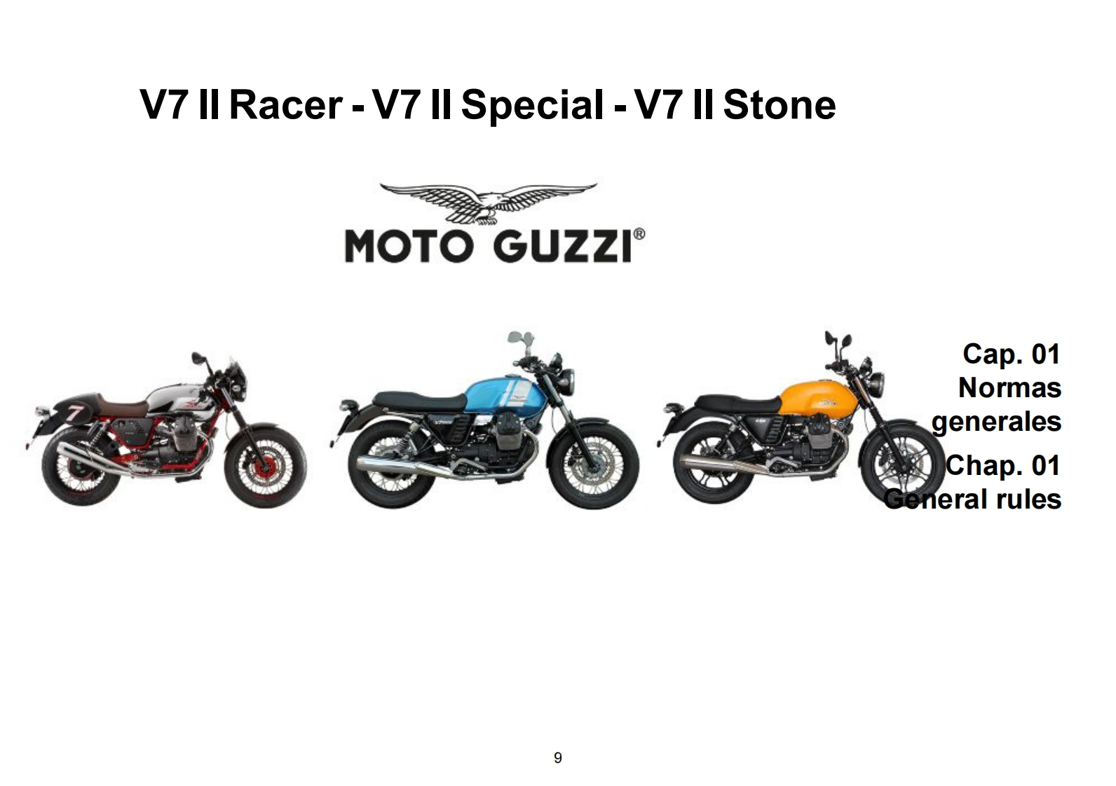 MOTO GUZZI DESEA AGRADECERLEpor haber elegido uno de sus productos.Hemos preparado este manual para permitirle apreciar todas sus cualidades.Le aconsejamos que lea todosu contenido antes de conducir por primera vez.Contiene informacion,consejos y advertencias para el uso de su vehiculo;asimismo,descubriracaracteristicas,piezas y soluciones que le convenceran de lo acertado de su eleccion.Estamos seguros de que teniendo todo esto en cuenta,leresultara facil conocer su nuevo vehiculo,el cual podra disfrutar por mucho tiempo con total satisfaccion.La presente publicacion es parte integrantedel vehiculo y en caso de venderlo debe entregarse al nuevo propietario.MOTO GUZZI WOULD LIKE TO THANK YOUfor choosing one of its products.We have compiled this booklet to provide a comprehensive overview of your vehicle's quality features.Please read itcarefully before riding the vehicle for the first time.It contains information,tips and precautions for using your vehicle.It also describes features,detailsand devices to assure you that you have made the right choice.We believe that if you follow our suggestions,you will soon get to know your new vehiclewell and that it will continue to give you satisfactory service for many years to come.This booklet forms an integral part of the vehicle;should the vehiclebe sold,it must be transferred to the new owner.V7 II Racer -V7 II Special V7 II StoneMOTO GUZZIEd.0111/2014
