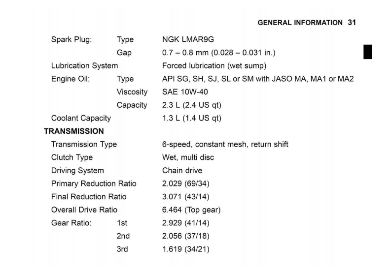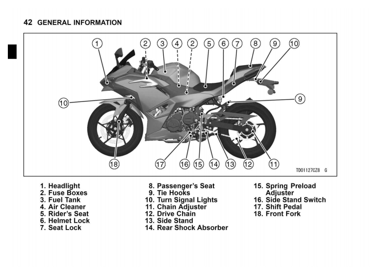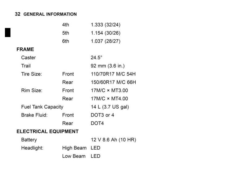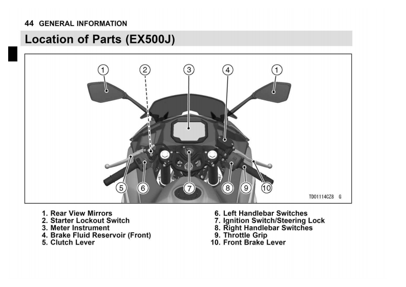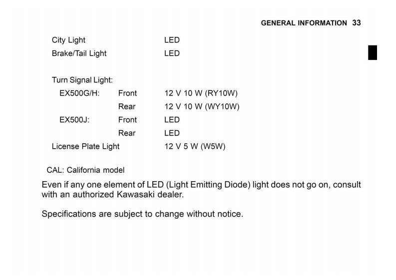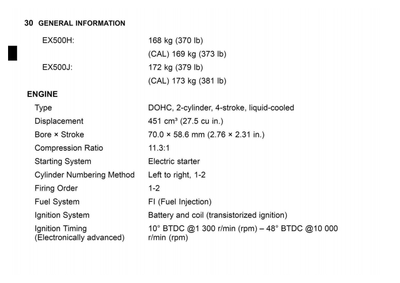 GENERAL INFORMATION 29GENERAL INFORMATIONSpecificationsPERFORMANCEMinimum Turning Radius2.5m(8.2t)DIMENSIONSOverall Length1995mm(78.54in.)Overall Width730mm(28.7in.)Overall Height:EX500G/H1120mm(44.09in.)EX500J1180mm(46.46in.)Wheelbase1375mm(54.13in.)Road Clearance145mm(5.71in.)Curb Mass:EX500G:170kg(3751b)(CAL)171 kg(377 Ib)