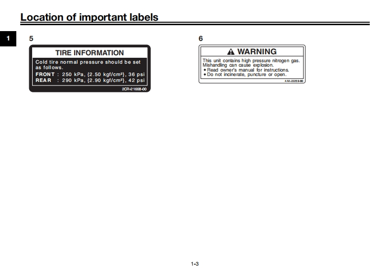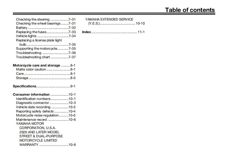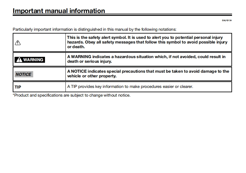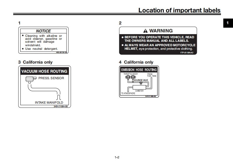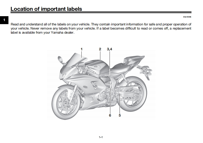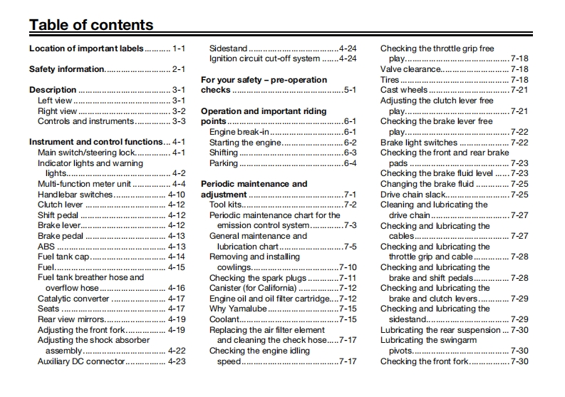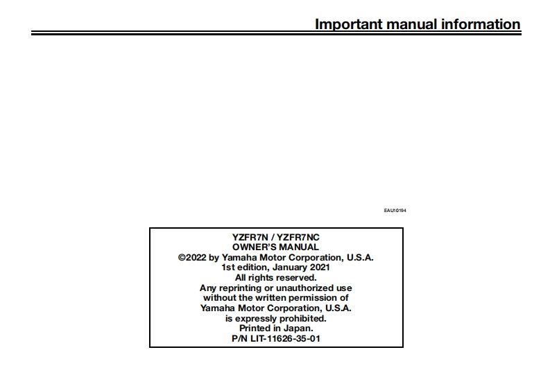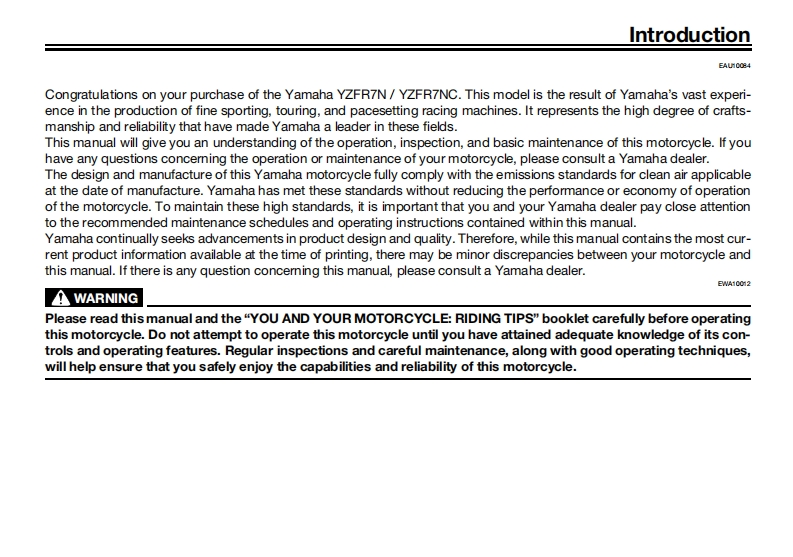 多YAMAHARead this manual carefullybefore operating this vehicle.Location of important labelsOWNER'S MANUALSafety informationDescriptionInstrument and control functionsFor your safety -pre-operation checks5Operation and important riding points6Periodic maintenance and adjustmentMotorcycle care and storage8Specifications9MOTORCYCLEConsumer informationYZFR7N/YZFR7NC (YZF-R7IndexL1T-11626-35-01BEB-28199-10
