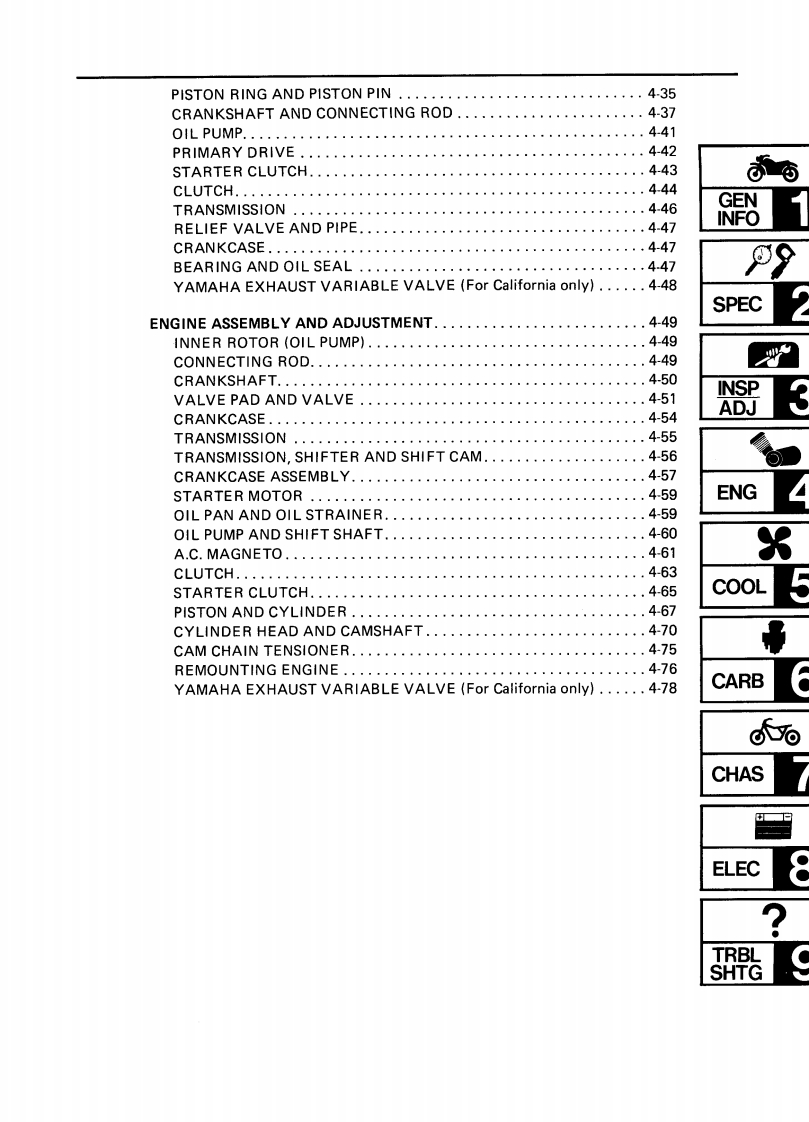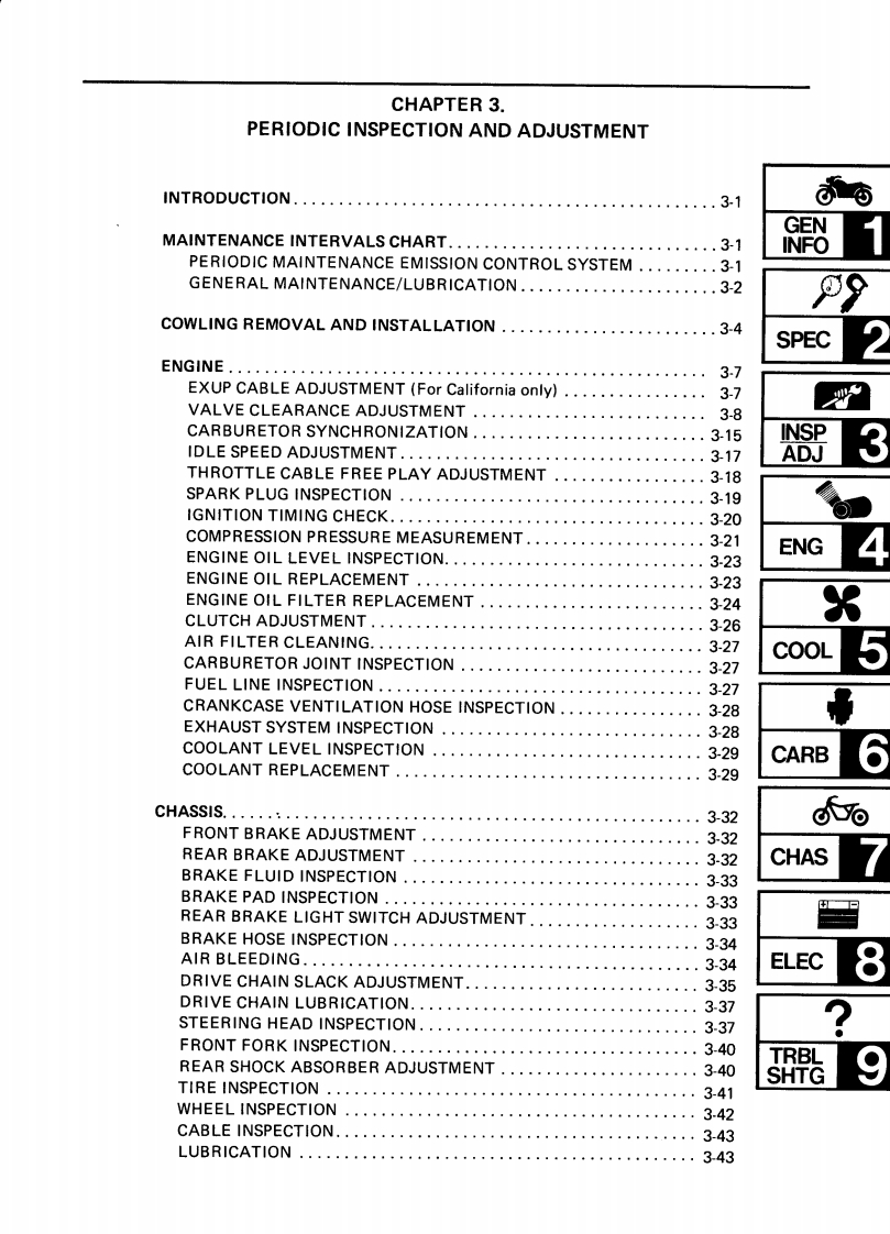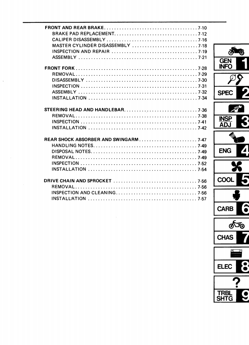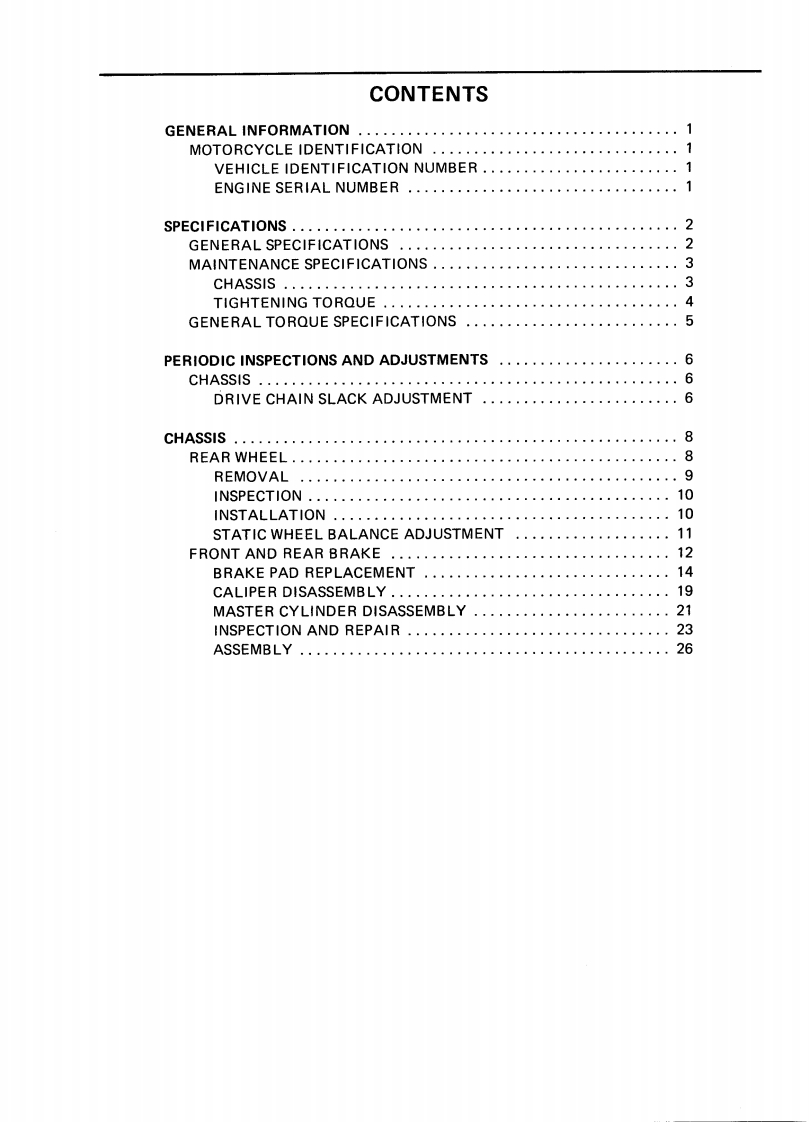 CONTENTSCHAPTER 1.GENERAL INFORMATIONMOTORCYCLE IDENTIFICATION................................1-1VEHICLE IDENTIFICATION NUMBER.........................1-1ENGINE SERIALNUMBER...................................1-1IMPORTANT INFORMATION....................................1-2PREPARATION FOR REMOVAL..............................1-2ALL REPLACEMENT PARTS..·.·.······1-2GASKETS,OIL SEALS,AND O-RINGS .......1-2LOCK WASHERS/PLATES AND COTTER PINS..................1-3BEARINGS AND OIL SEALS..............................1-3CIRCLIPS…1-3SPECIAL TOOLS.......1-4FOR TUNE UP.....1-4FOR ENGINE SERVICE1-5FOR CHASSIS SERVICE.·1-8FOR ELECTRICAL COMPONENTS1-9CHAPTER 2.SPECIFICATIONSSPECIFICATIONS...........2-1GENERAL SPECIFICATIONS....2-1MAINTENANCE SPECIFICATIONS....2.4ENGINE...........................24CHASSIS...........................2-11ELECTRICAL..............2-14GENERAL TORQUE SPECIFICATIONS.·...·.216DEFINITION OF UNITS.......,216LUBRICATION POINT AND GRADE OF LUBRICANT..........2-17LUBRICATION DIAGRAM.....219COOLANT DIAGRAM.....2-20CABLE ROUTING........2-21