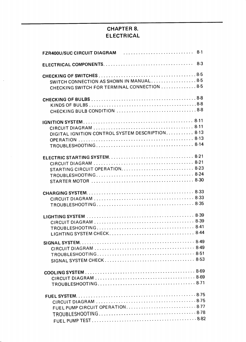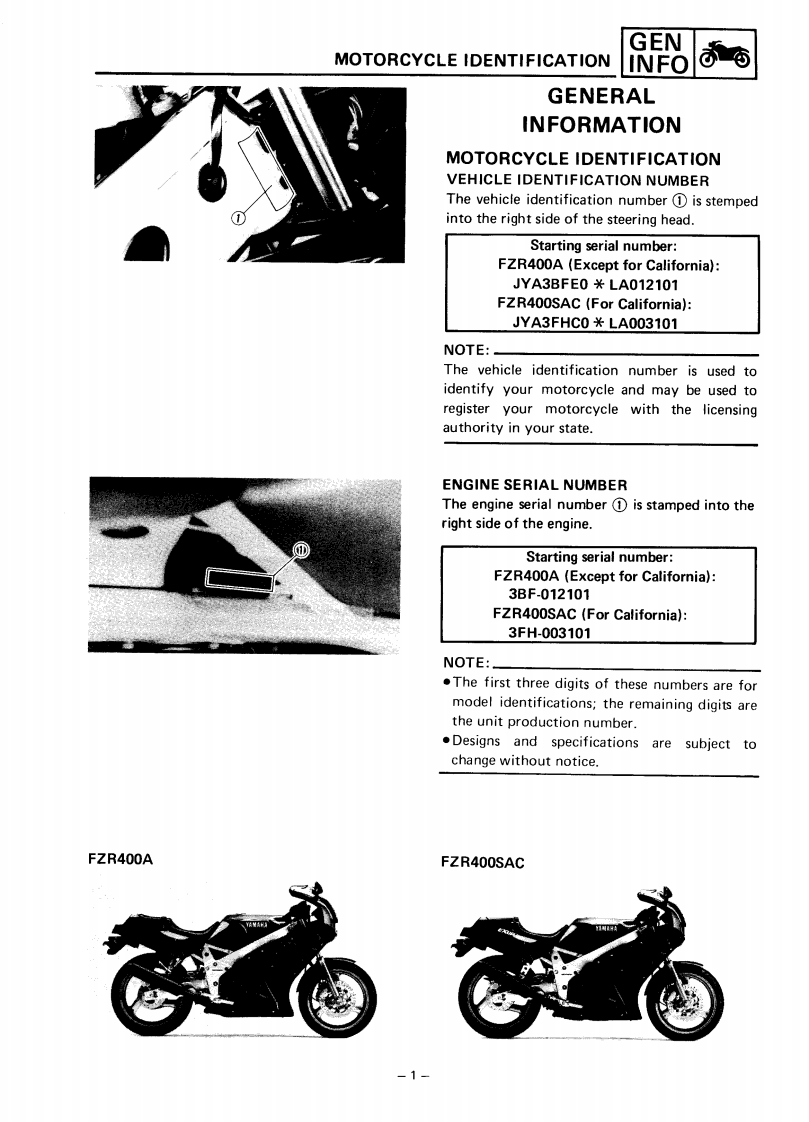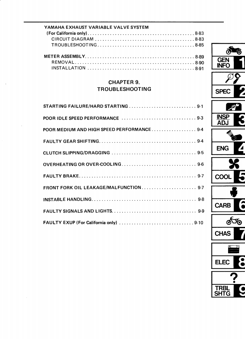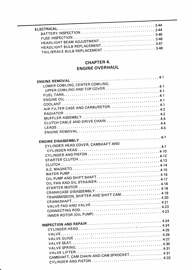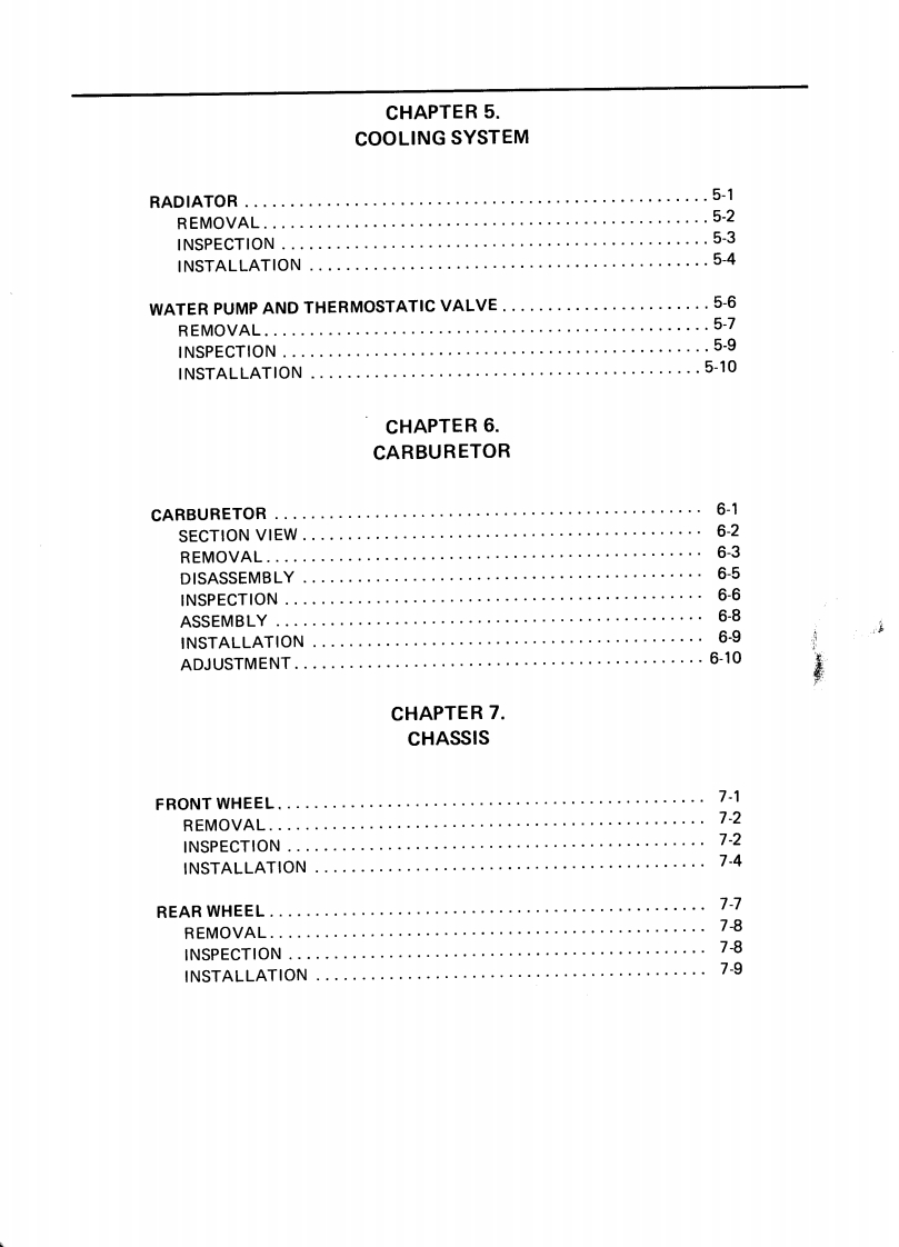 CONTENTSCHAPTER 1.GENERAL INFORMATIONMOTORCYCLE IDENTIFICATION................................1-1VEHICLE IDENTIFICATION NUMBER.........................1-1ENGINE SERIALNUMBER...................................1-1IMPORTANT INFORMATION....................................1-2PREPARATION FOR REMOVAL..............................1-2ALL REPLACEMENT PARTS..·.·.······1-2GASKETS,OIL SEALS,AND O-RINGS .......1-2LOCK WASHERS/PLATES AND COTTER PINS..................1-3BEARINGS AND OIL SEALS..............................1-3CIRCLIPS…1-3SPECIAL TOOLS.......1-4FOR TUNE UP.....1-4FOR ENGINE SERVICE1-5FOR CHASSIS SERVICE.·1-8FOR ELECTRICAL COMPONENTS1-9CHAPTER 2.SPECIFICATIONSSPECIFICATIONS...........2-1GENERAL SPECIFICATIONS....2-1MAINTENANCE SPECIFICATIONS....2.4ENGINE...........................24CHASSIS...........................2-11ELECTRICAL..............2-14GENERAL TORQUE SPECIFICATIONS.·...·.216DEFINITION OF UNITS.......,216LUBRICATION POINT AND GRADE OF LUBRICANT..........2-17LUBRICATION DIAGRAM.....219COOLANT DIAGRAM.....2-20CABLE ROUTING........2-21