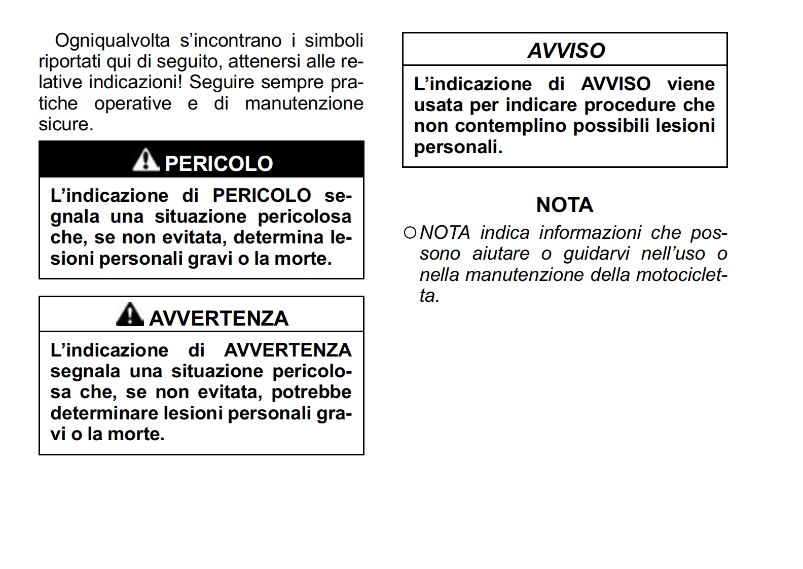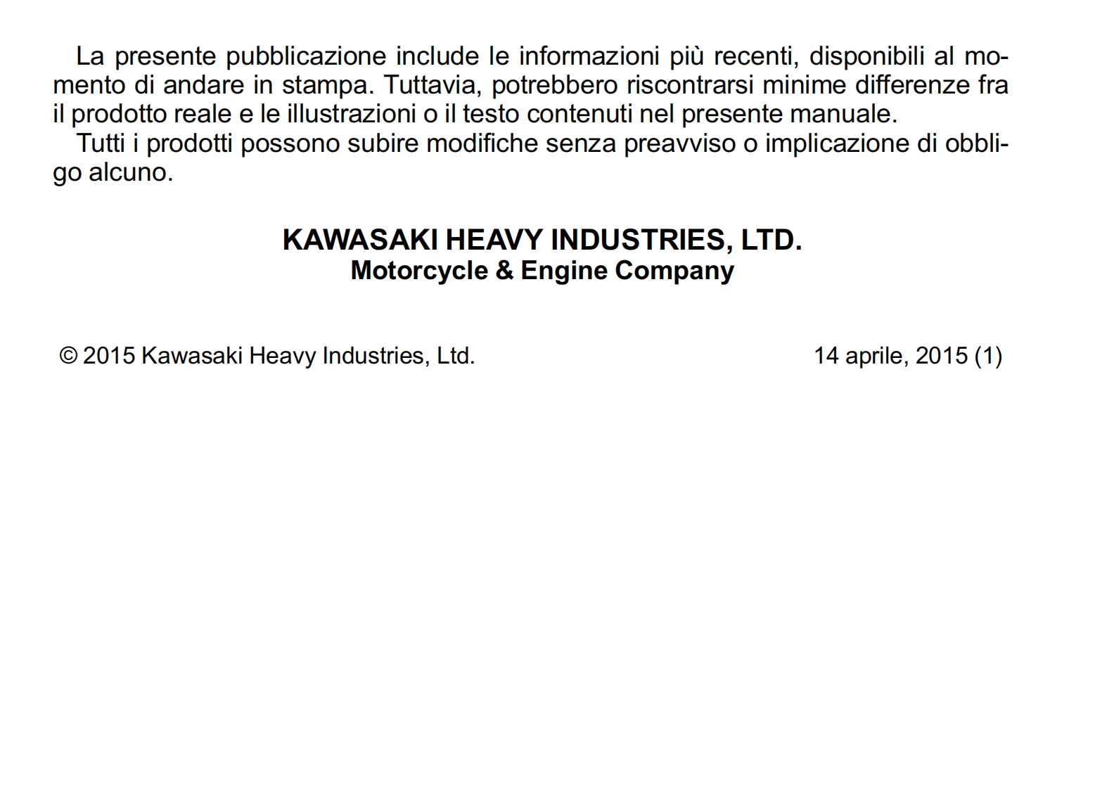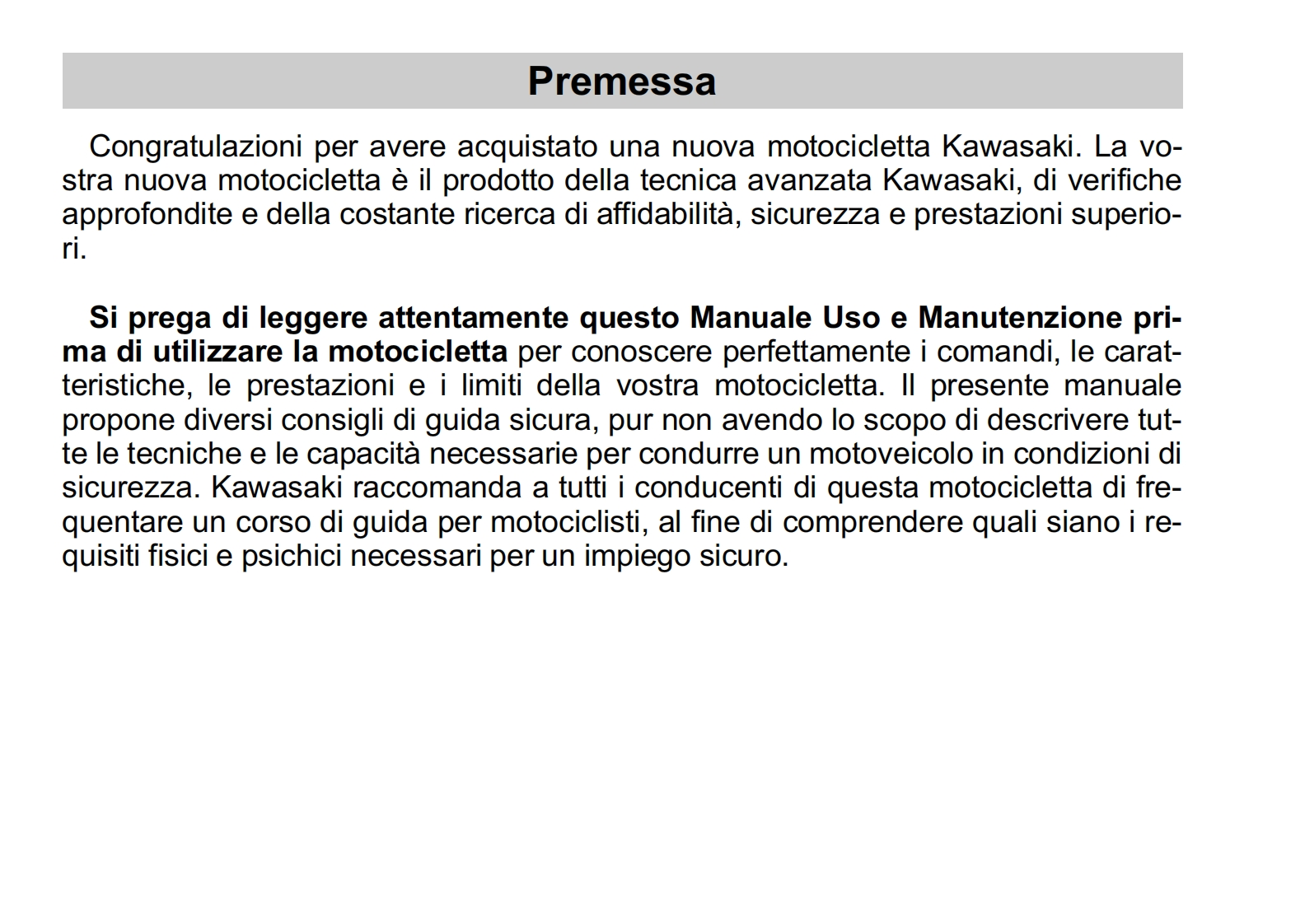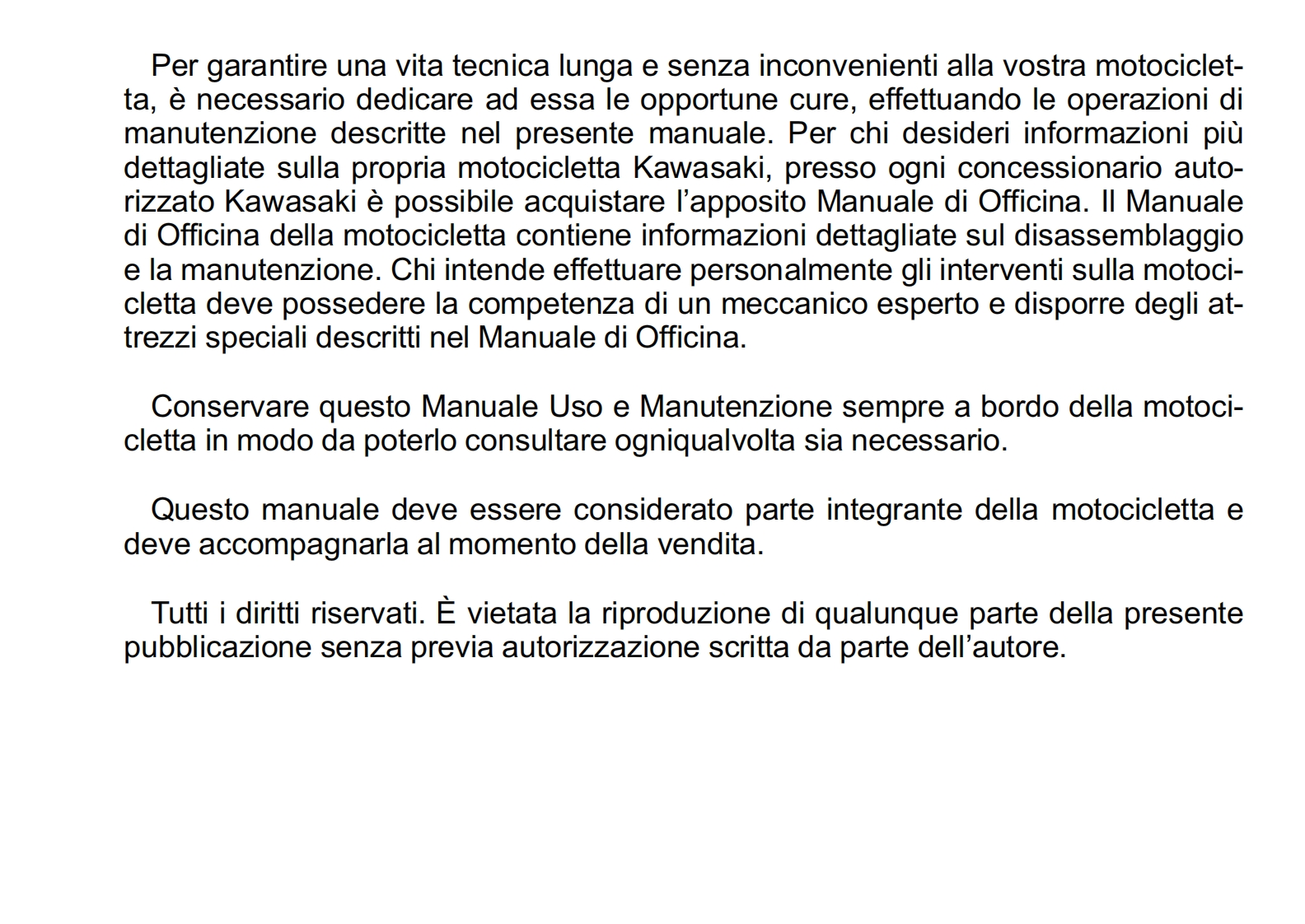 VERSYS 650VERSYS 650 ABSMotociclettaMotocicletaMotorfietsMANUALE USO E MANUTENZIONEMANUAL DEL PROPIETARIOINSTRUCTIEBOEKJELeggere questo manuale attentamente.Contiene informazioni sulla sicurezza.Lea cuidadosamente este manual.Contiene informacion de seguridad.Lees dit handboek aandachtig door.Het bevat belangrijke informatie voor uw veiligheid.Kawasaki