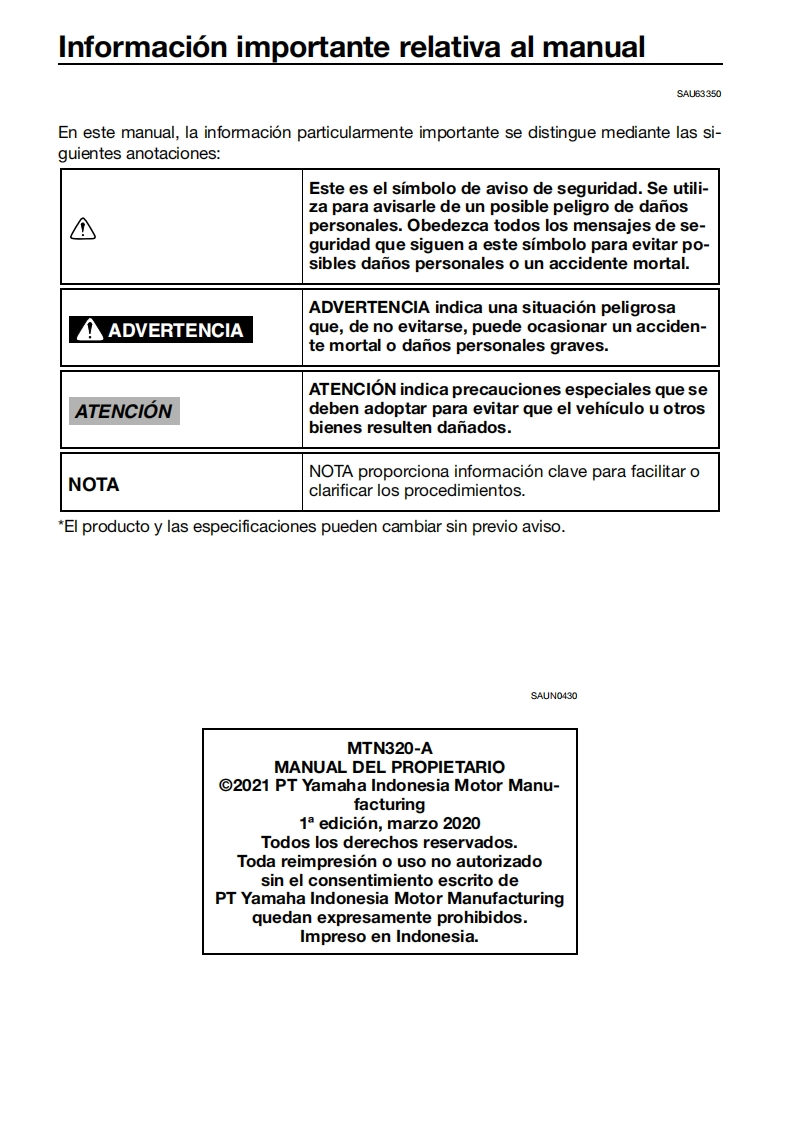 雅马哈MT03摩托车维修零部件说明书手册找手册网27天前发布关注私信6.96MB94页037雅马哈MT03摩托车维修零部件说明书手册此内容为付费资源,请付费后查看¥19¥21黄金会员免费钻石会员免费登录购买付费资源 第1页 / 共94页 第2页 / 共94页 第3页 / 共94页 第4页 / 共94页 第5页 / 共94页 第6页 / 共94页 第7页 / 共94页 第8页 / 共94页 第9页 / 共94页 第10页 / 共94页 试读已结束,还剩84页,您可下载完整版后进行离线阅读 THE END雅马哈 文本预览 米YAMAHAMANUAL DEL PROPIETARIOMT-03 ABSMOTOCICLETALea este manual atentamente antes deutilizar este vehiculo.MTN320-AB5W-F8199-S0● 查看更多 收起部分 喜欢就支持一下吧收藏