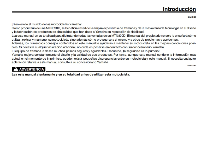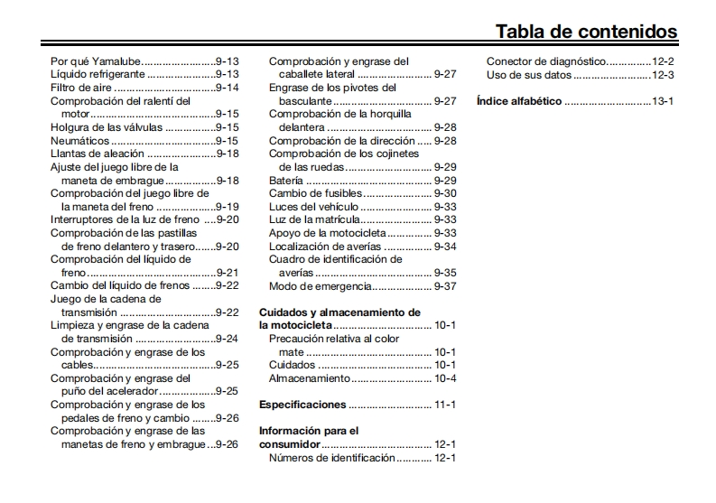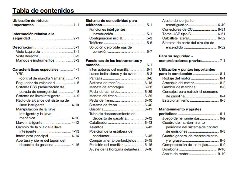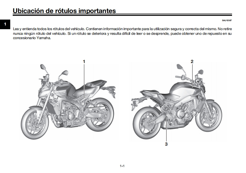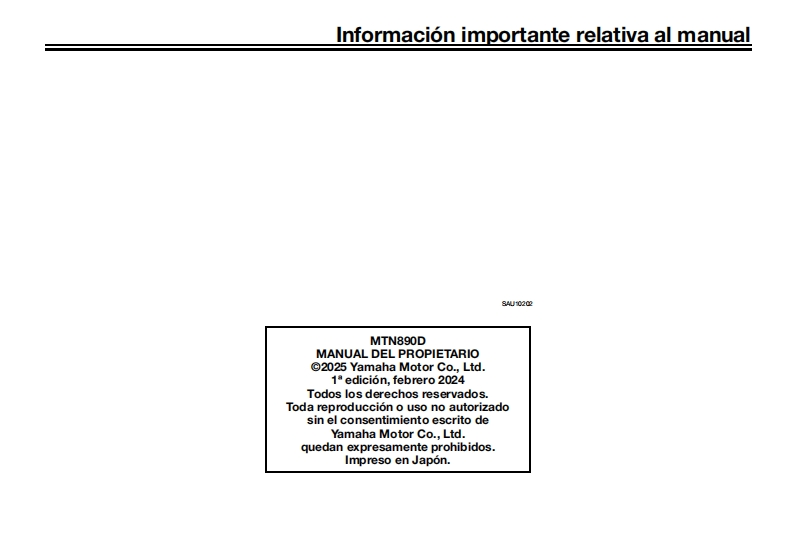 YAMAHALea este manual atentamenteantes de utilizar este vehiculo.Ubicacion de rotulos importantesMANUAL DEL PROPIETARIOInformacion relativa a la seguridadDescripcionCaracteristicas especialesSistema de conectividad para telefonosFunciones de los instrumentos y mandos6Para su seguridad -comprobacionesprevias-三Utilizacion y puntos importantespara la conduccion8Mantenimiento y ajustes periodicosMOTOCICLETACuidados y almacenamientode la motocicletaMTN890D (MT-09 SPEspecificacionesInformacion para el consumidorindice alfabetico13BMM-28199-SA