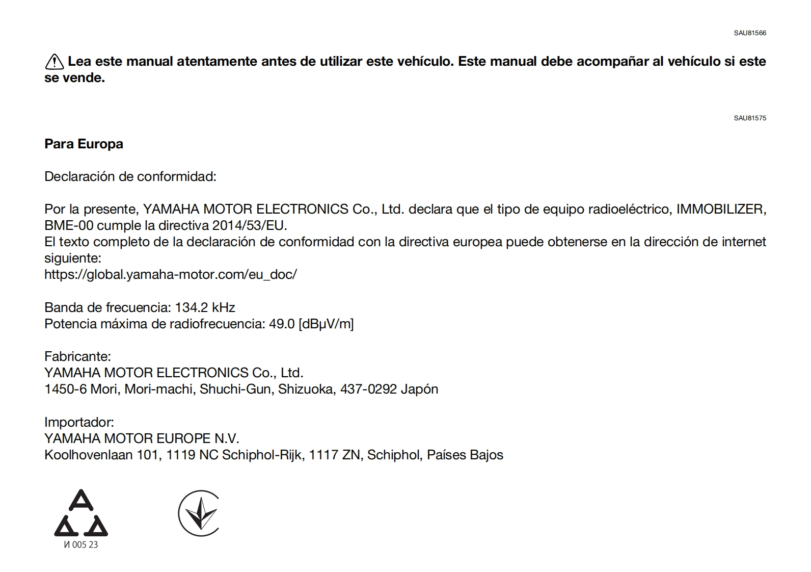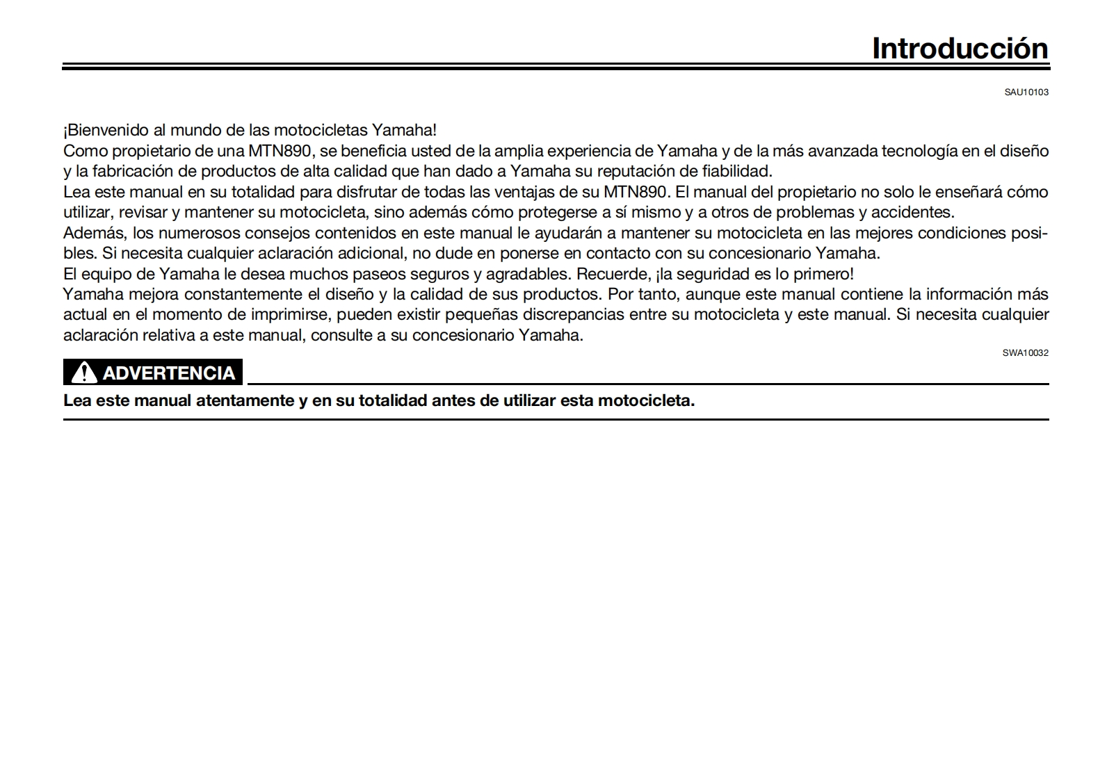 YAMAHALea este manual atentamenteantes de utilizar este vehiculo.Informacion relativa a la seguridadMANUAL DEL PROPIETARIODescripcionCaracteristicas especialesSistema de conectividad para telefonosFunciones de los instrumentos y mandosPara su seguridad-comprobacionesprevias6Utilizacion y puntos importantespara la conduccionMantenimiento y ajustes periodicos8Cuidados y almacenamientode la motocicletaMOTOCICLETAEspecificacionesMTN890 (MT-09)Informacion para el consumidorIndice alfabeticoBME-28199-S0●
