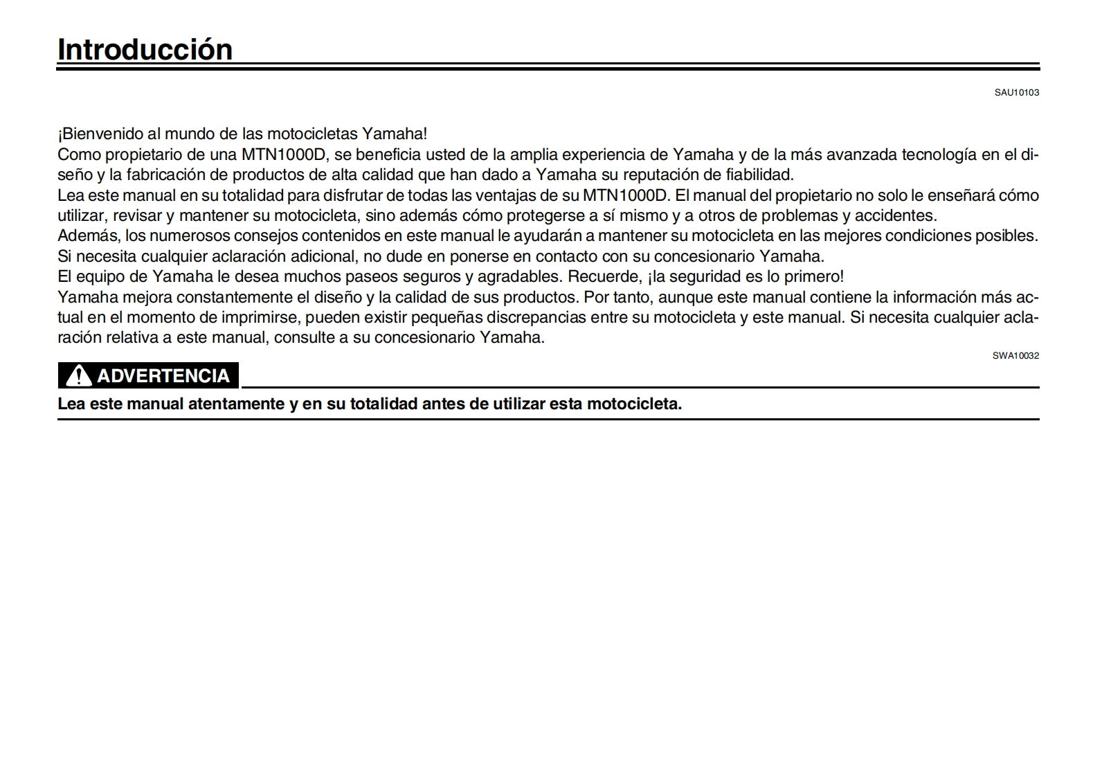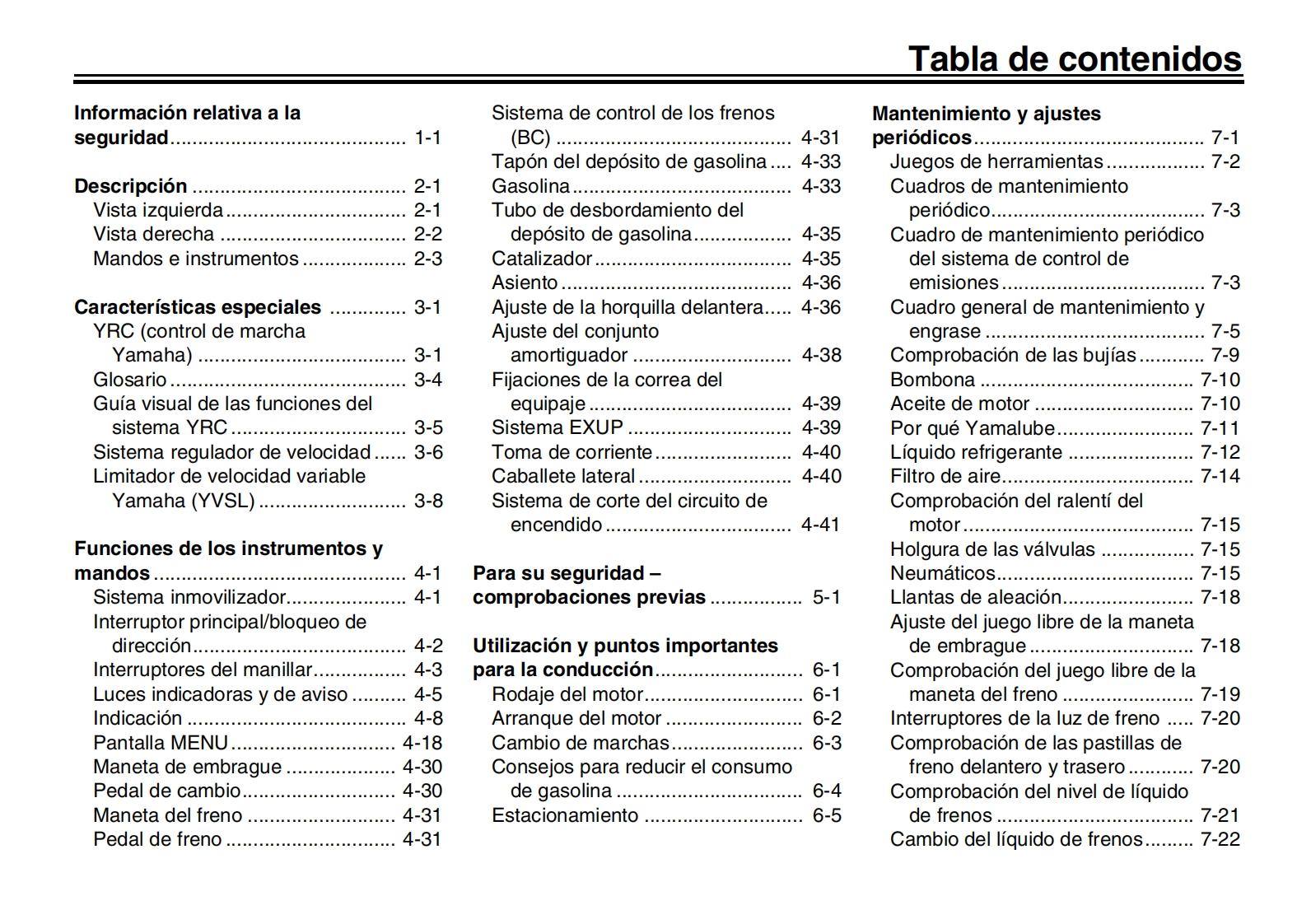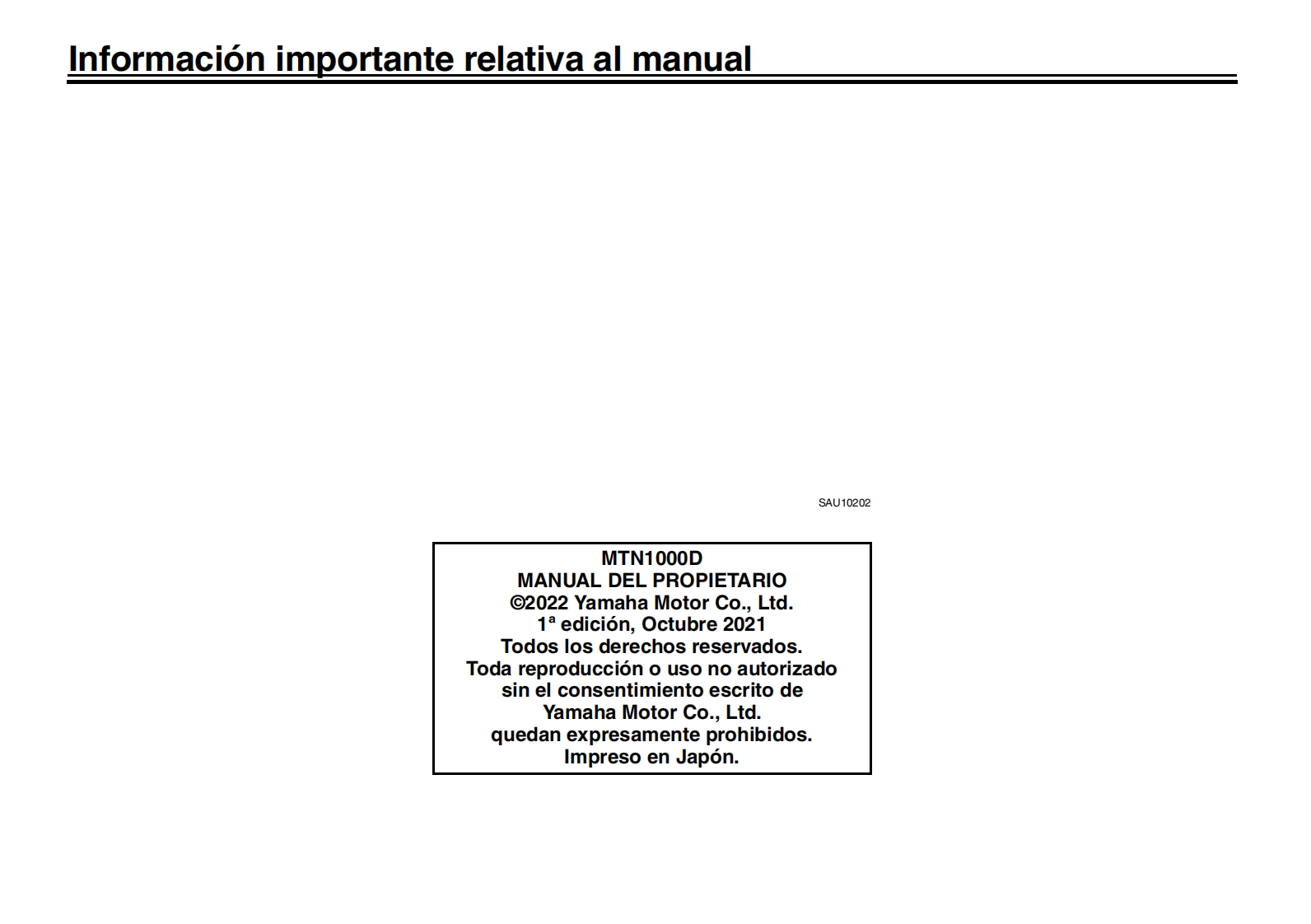 YAMAHALea este manual atentamenteantes de utilizar este vehiculo.Informacion relativa a la seguridadMANUAL DEL PROPIETARIODescripcionCaracteristicas especiales3Funciones de los instrumentos y mandosPara su seguridad-comprobaciones previasUtilizacion y puntos importantes para la con-duccion6Mantenimiento y ajustes periodicosCuidados y almacenamiento de la motocicle-八7-三三ta8EspecificacionesqMOTOCICLETAInformacion para el consumidorMTN1000D (MT-10 SP)indice alfabeticoBGG-28199-S0