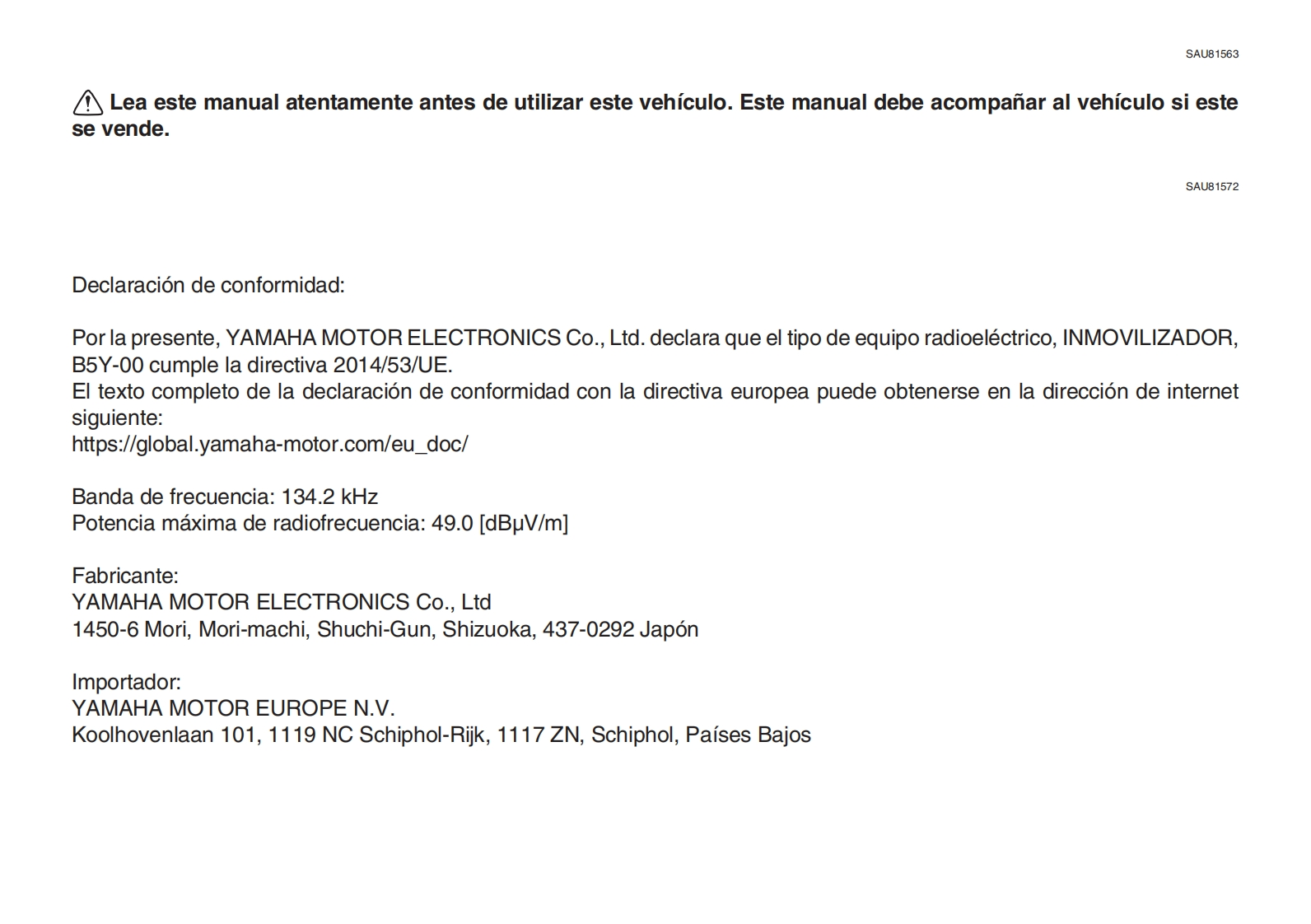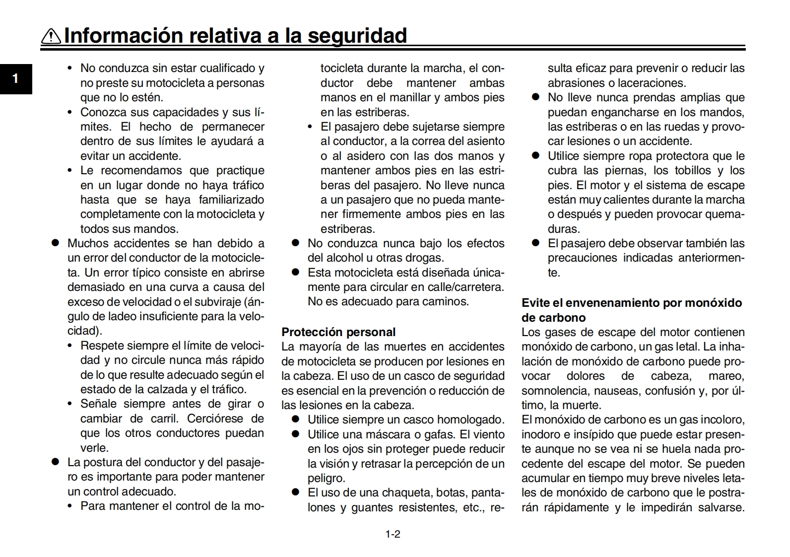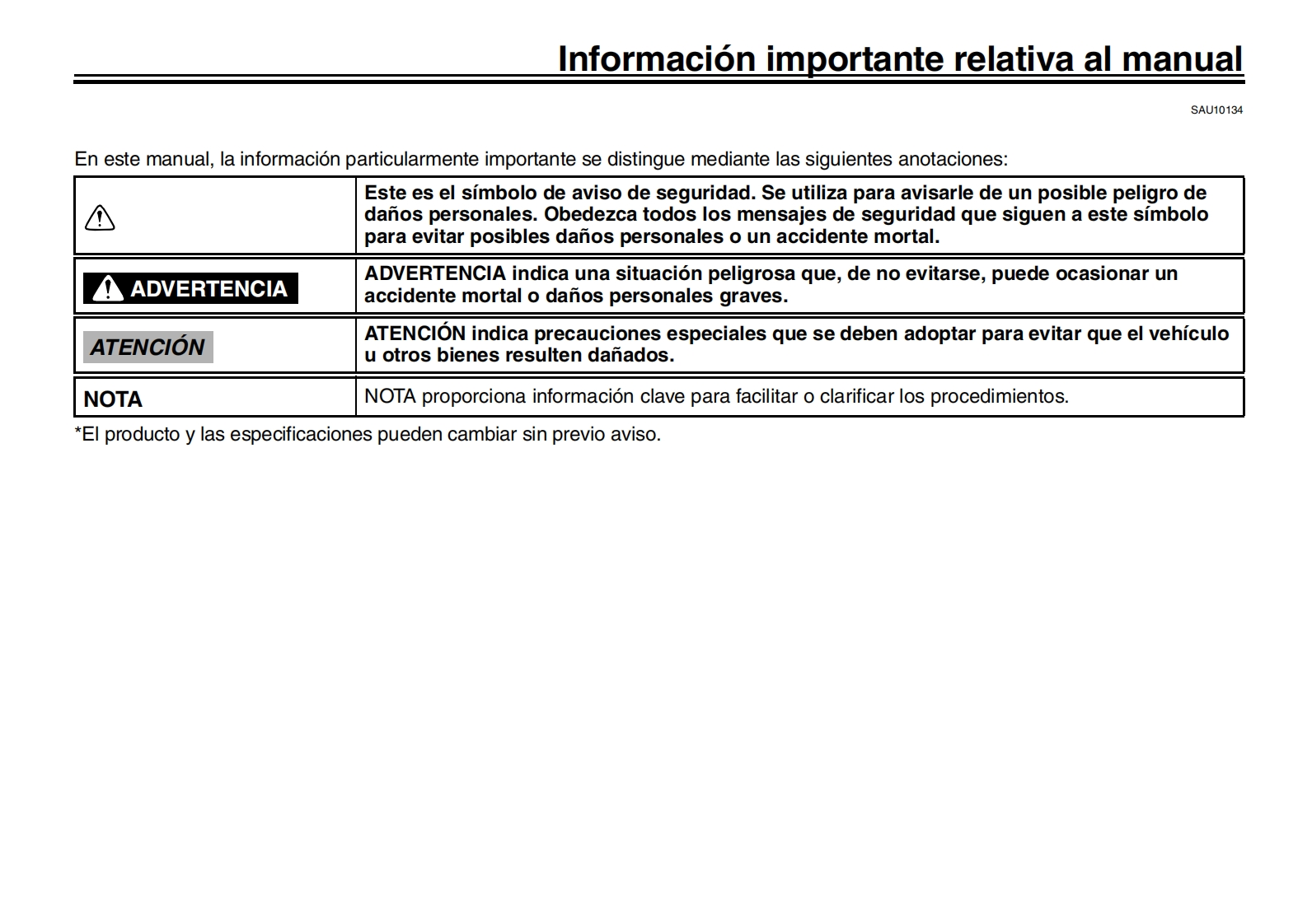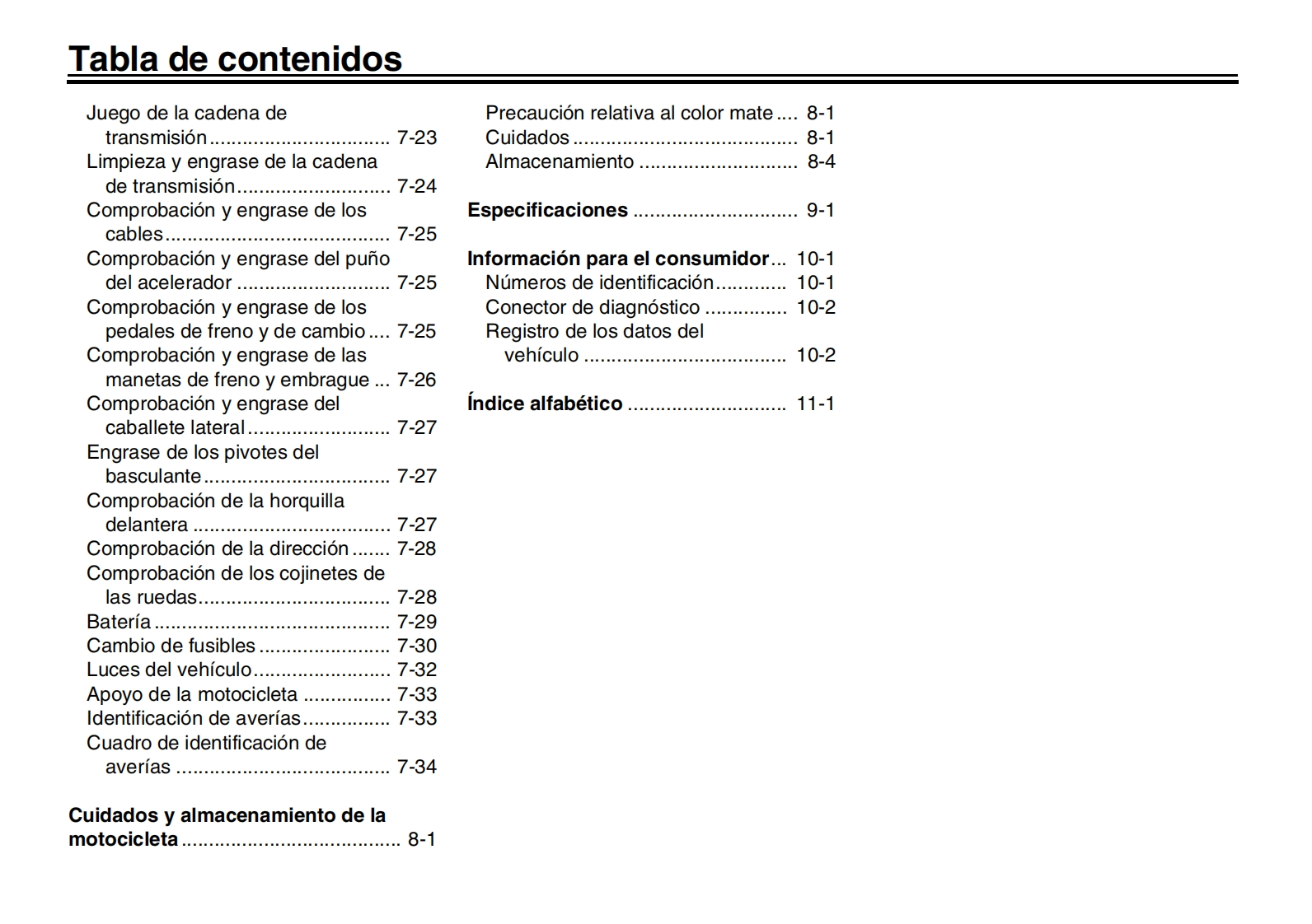 YAMAHALea este manual atentamenteantes de utilizar este vehiculo.Informacion relativa a la seguridadMANUAL DEL PROPIETARIODescripcionCaracteristicas especiales3Funciones de los instrumentos y mandosPara su seguridad-comprobaciones previasUtilizacion y puntos importantes para la con-duccion6Mantenimiento y ajustes periodicosCuidados y almacenamiento de la motocicle-八7-三三ta8EspecificacionesqMOTOCICLETAInformacion para el consumidorMTN1000D (MT-10 SP)indice alfabeticoBGG-28199-S0