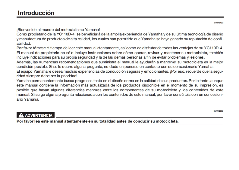 雅马哈YCZ110摩托车维修零部件说明书手册找手册网27天前发布关注私信11.47MB105页035雅马哈YCZ110摩托车维修零部件说明书手册此内容为付费资源,请付费后查看¥19¥21黄金会员免费钻石会员免费登录购买付费资源 第1页 / 共105页 第2页 / 共105页 第3页 / 共105页 第4页 / 共105页 第5页 / 共105页 第6页 / 共105页 第7页 / 共105页 第8页 / 共105页 第9页 / 共105页 第10页 / 共105页 试读已结束,还剩95页,您可下载完整版后进行离线阅读 THE END雅马哈 文本预览 MANUAL DEL PROPIETARIOLea este manual atentamenteY DE GARANTIAantes de utilizar este vehiculo.B0A-F8199-S0666056多YAMAHA 查看更多 收起部分 喜欢就支持一下吧收藏