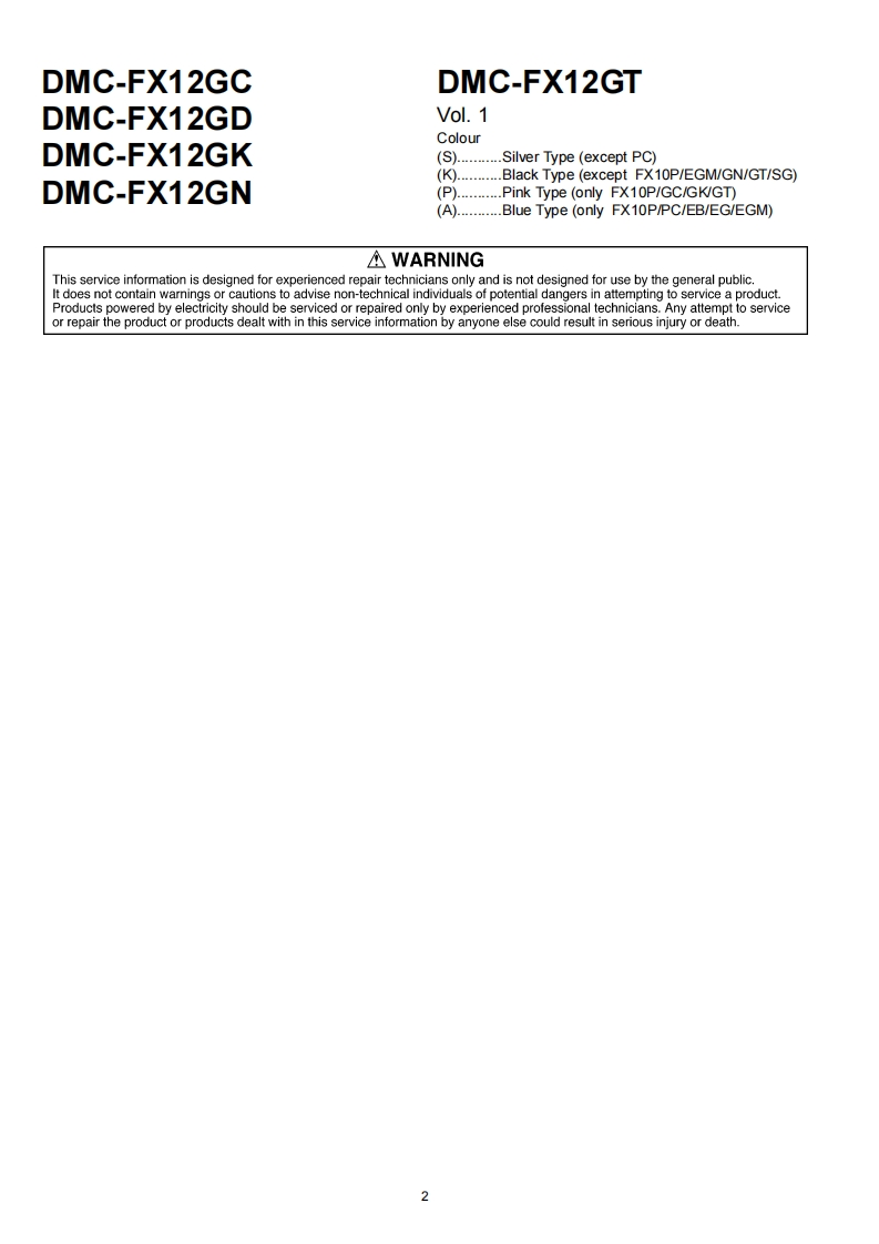 ORDER NO.DSC0701001CEB26Service ManualDigital CameraLUMIXDMC-FX10PLEICADC VARIO-ELMARITDMC-FX10PCDMC-FX10PLDMC-FX10EBDMC-FX10EEDMC-FX10EFDMC-FX10EGDMC-FX10EGMDMC-FX10GCDMC-FX10GDDMC-FX10GKDMC-FX10GNDMC-FX10GTDMC-FX10SGDMC-FX12PDMC-FX12PCDMC-FX12PLDMC-FX12EBDMC-FX12EEDMC-FX12EFDMC-FX12EGDMC-FX12EGM2007 Matsushita Electric Industrial Co..Ltd.AllPanasonicrights reserved.Unauthorized copying and distribu-tion is a violation of law.