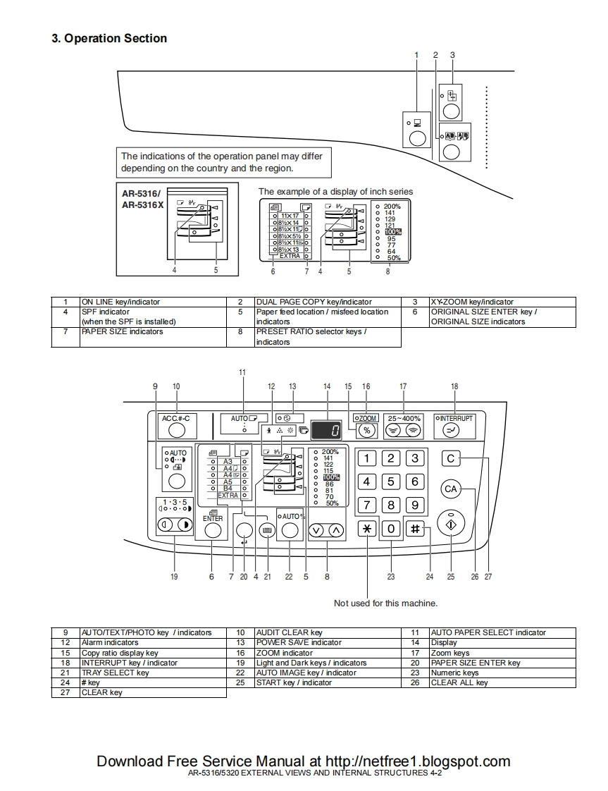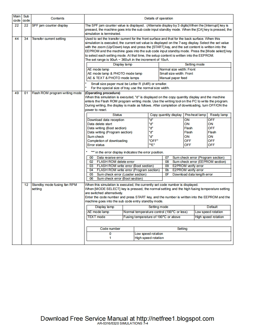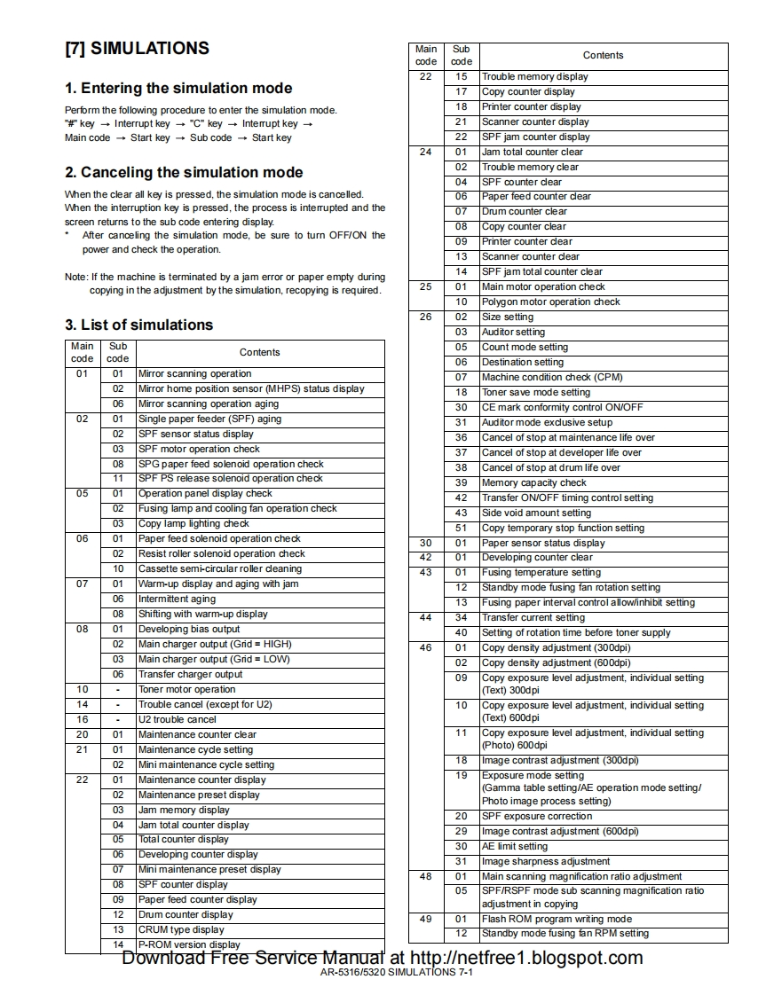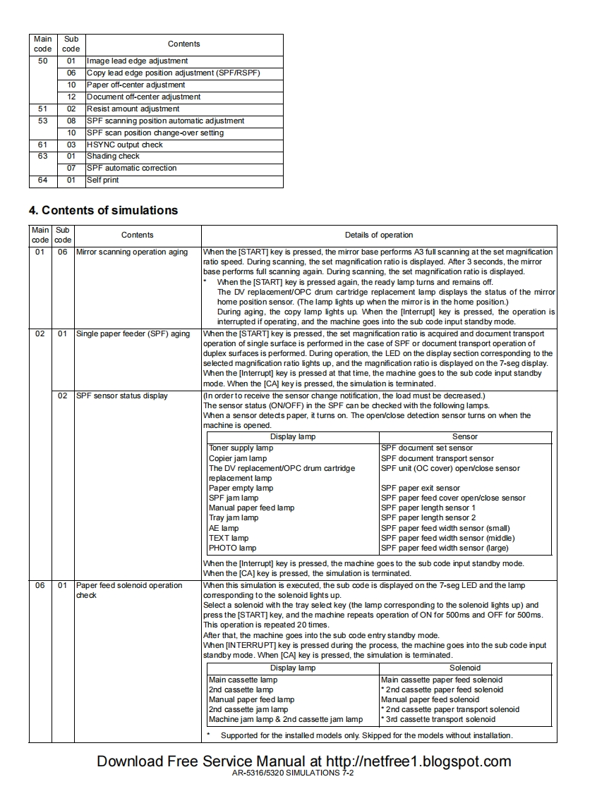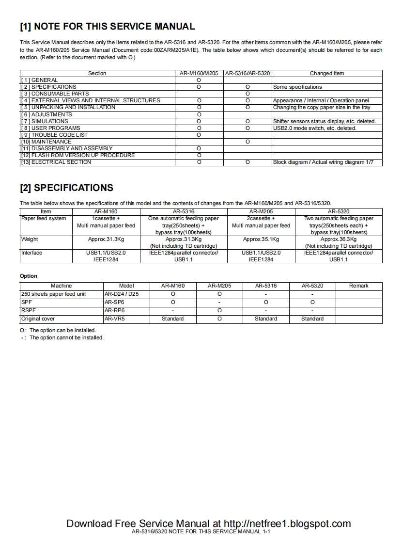 SHARPSERVICE MANUALCODE 00ZAR5320/A1EDIGITAL COPIERAR-5316AR-5316MODELAR-5320AR-5320(with option installed)CONTENTS[1 NOTE FOR THIS SERVICE MANUAL ...............Refer to AR-M160[2 SPECIFICATIONS.......AR-5316/5320[3 CONSUMABLE PARTS........AR-5316/5320[4]EXTERNAL VIEWS AND INTERNAL STRUCTURES......AR-5316/5320[5 UNPACKING AND INSTALLATION.........AR-5316/5320[6]ADJUSTMENTS...Refer to AR-M160[7]SIMULATIONS...AR-5316/5320[8]USER PROGRAMS.AR-5316/5320[9]TROUBLE CODE LIST......Refer to AR-M160[10]MAINTENANCE ......AR-5316/5320[11]DISASSEMBLY AND ASSEMBLY..Refer to AR-M160[12]FLASH ROM VERSION UP PROCEDURERefer to AR-M160[13]ELECTRICAL SECTION............AR-5316/5320Parts marked with""are important for maintaining the safety of the set.Be sure to replace these parts with specified ones for maintaining the safety and performance of the set.This document has been published to be used forSHARP CORPORATIONafter sales service only.The contents are subject to change without notice.