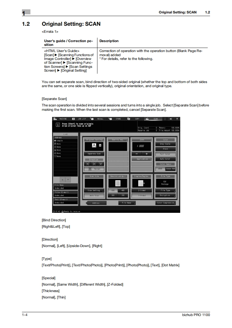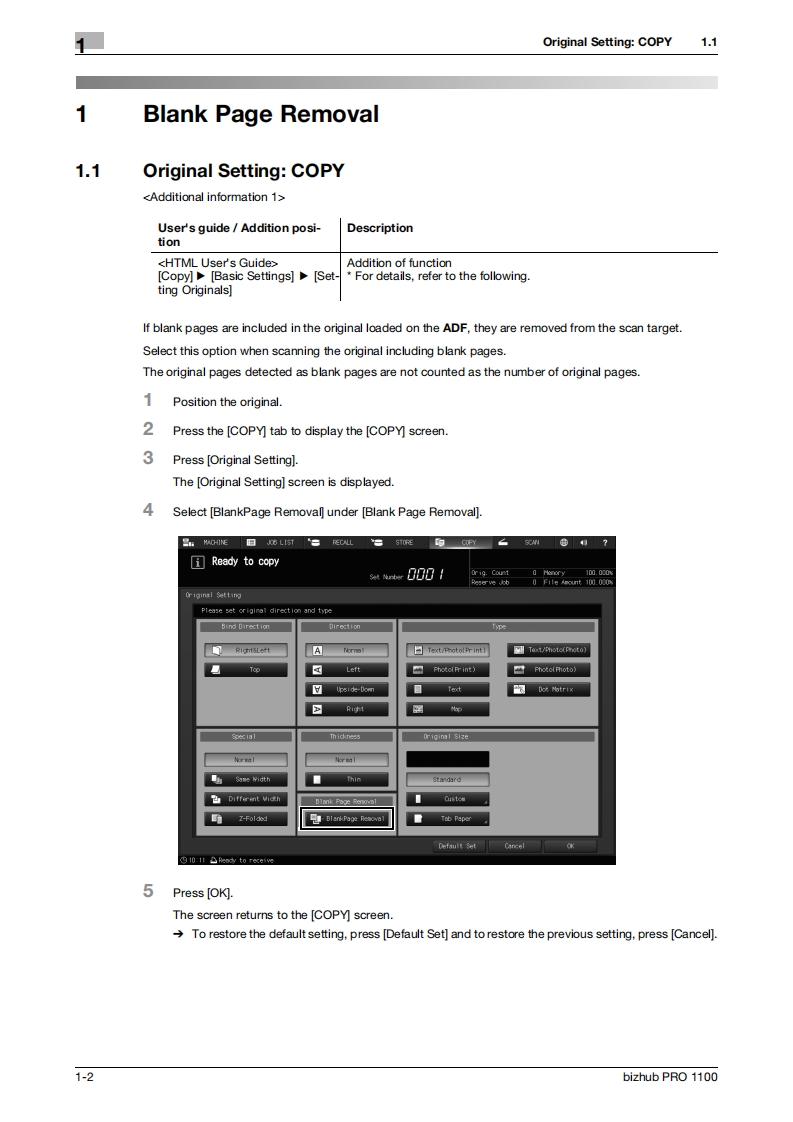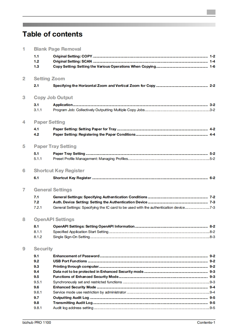 KONICA MINOLTAbizhub PRO1100Additional InformationProduct specifications have been modified for bizhub PRO 1100.This Additional Information describes the changes in operation proceduresand precautions for use which are required due to the modification,as well as changed contents of specifications.Please read it through.Keep this booklet beside the machine so that it is readily available for reference.