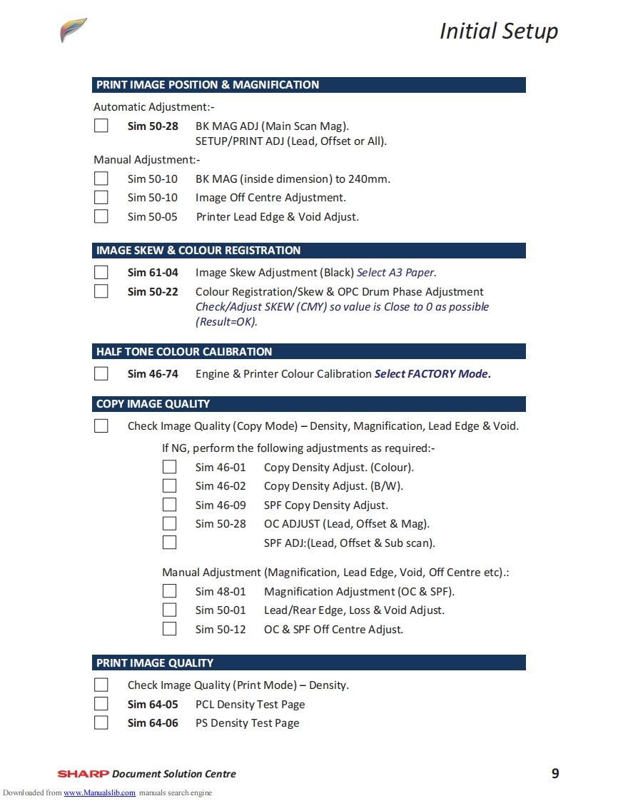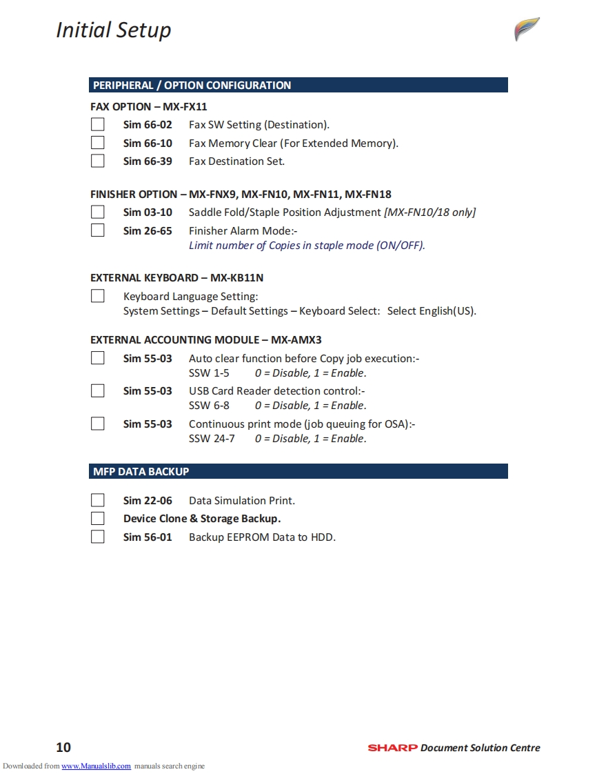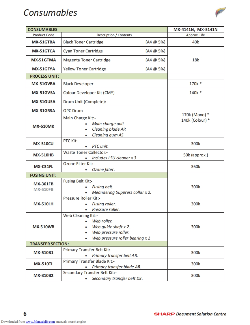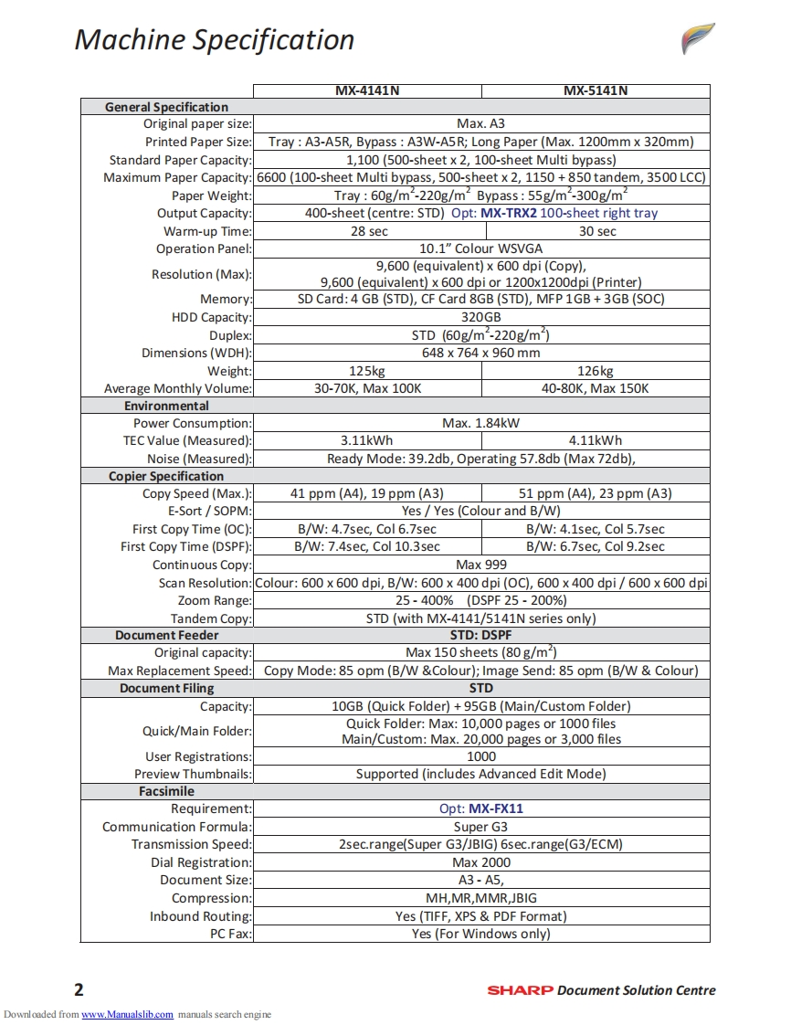 SHARPMX-4141NMX-5141NTechnical Handy GuideSeptember 2013ContentMachine Specification2MX-EB12N Mirroring Kit1Machine Options4SD Card Replacement Procedure3Consumables6CF Card Replacement ProcedureInitial Set-upeFirmware Print Driver Revision37Colour Calibration11Test SimulationMaintenance13Trouble Codes45Operating System Support17Sensor LocationElectrical18Jam Cause CodesCoin Vend Interface19Repair Hints55Firmware Upgrade21Technical Bulletin IndexE-Manual Update25Document ReferenceWatermark Update27Notes76859HDD Replacement Procedure29Downloaded from www.Manualslib.com manuals search engine