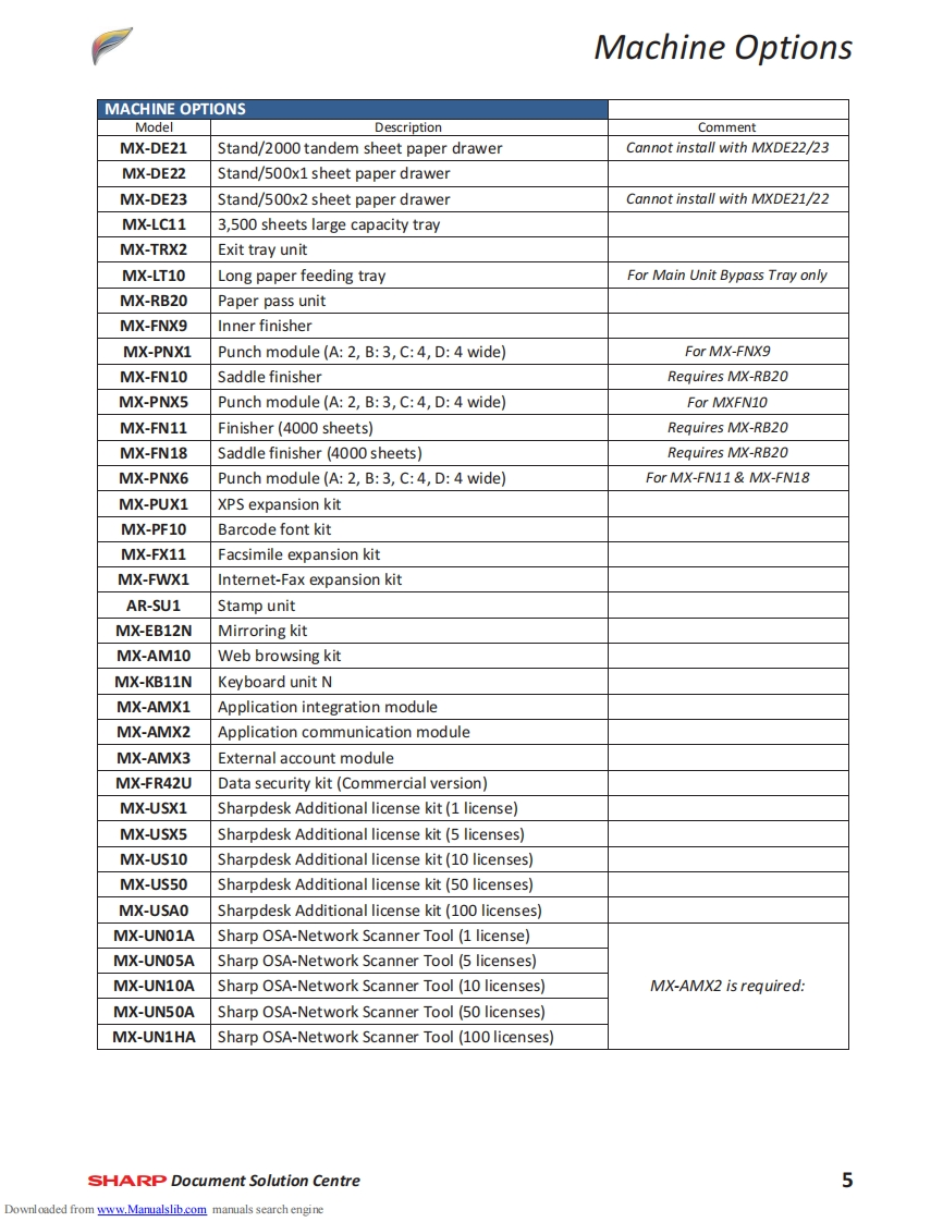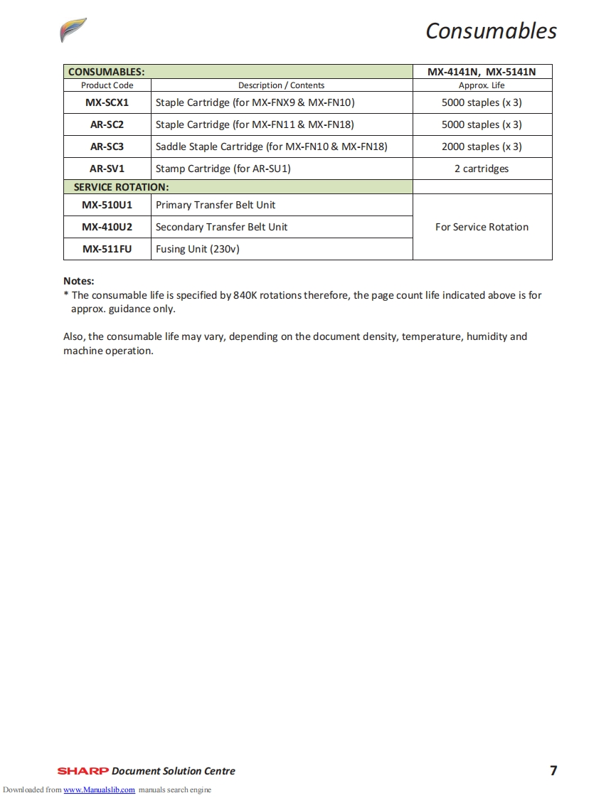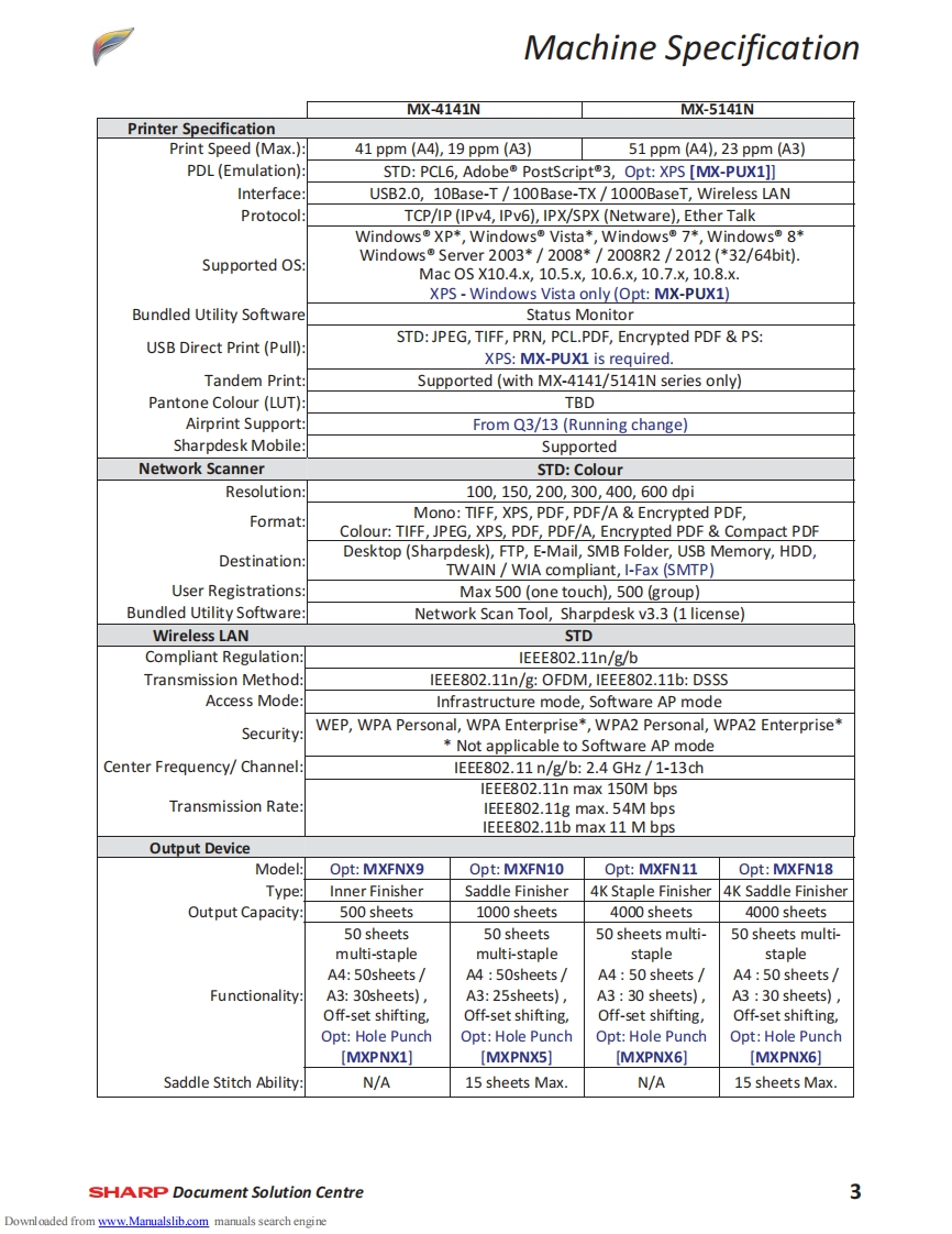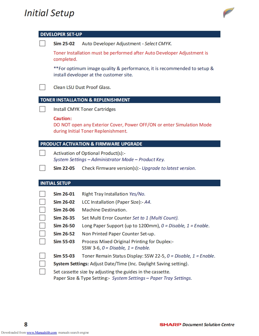 SHARPMX-4141NMX-5141NTechnical Handy GuideSeptember 2013ContentMachine Specification2MX-EB12N Mirroring Kit1Machine Options4SD Card Replacement Procedure3Consumables6CF Card Replacement ProcedureInitial Set-upeFirmware Print Driver Revision37Colour Calibration11Test SimulationMaintenance13Trouble Codes45Operating System Support17Sensor LocationElectrical18Jam Cause CodesCoin Vend Interface19Repair Hints55Firmware Upgrade21Technical Bulletin IndexE-Manual Update25Document ReferenceWatermark Update27Notes76859HDD Replacement Procedure29Downloaded from www.Manualslib.com manuals search engine